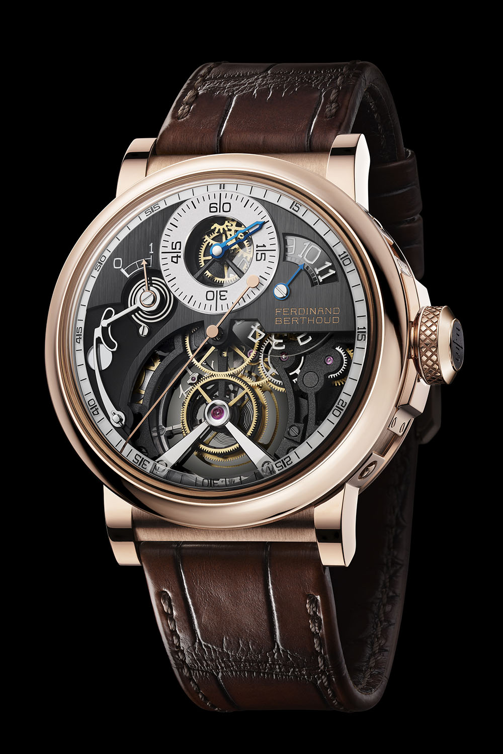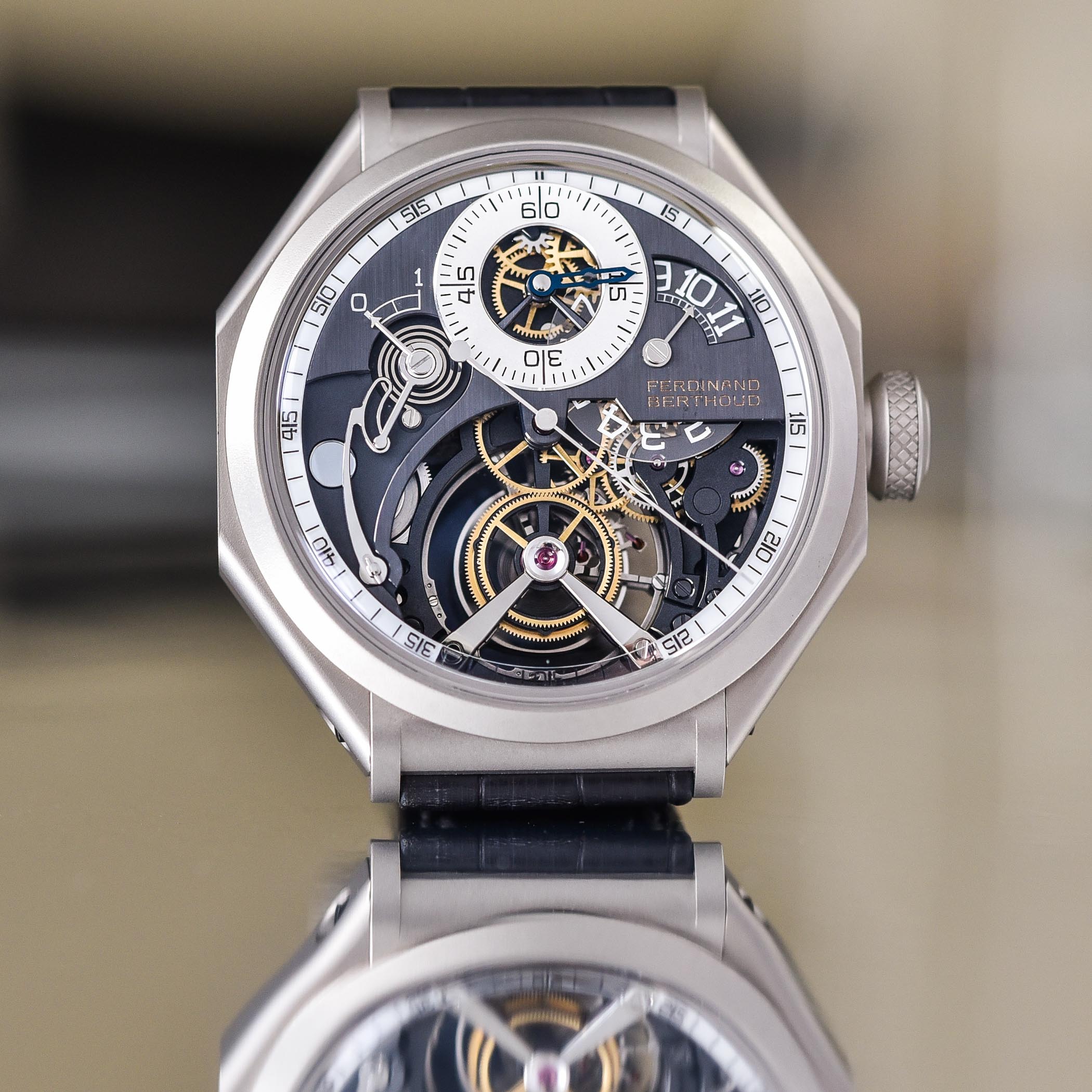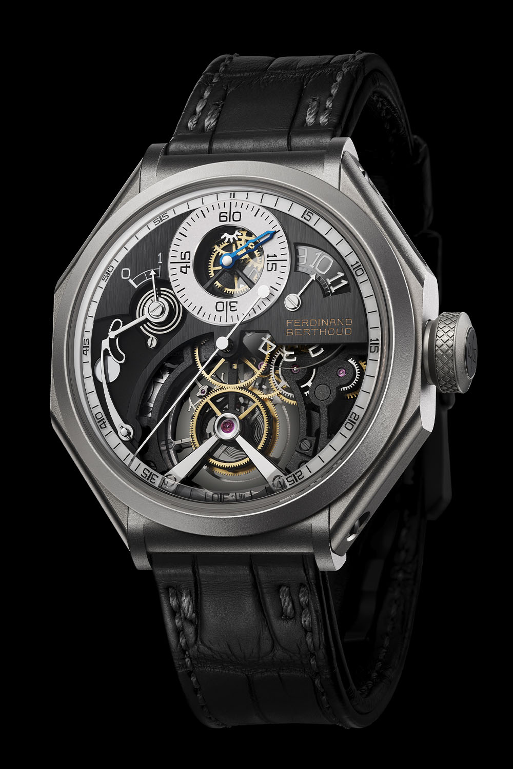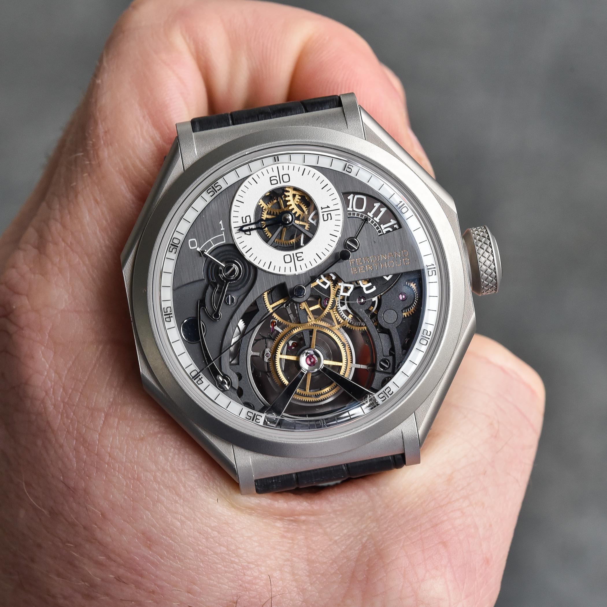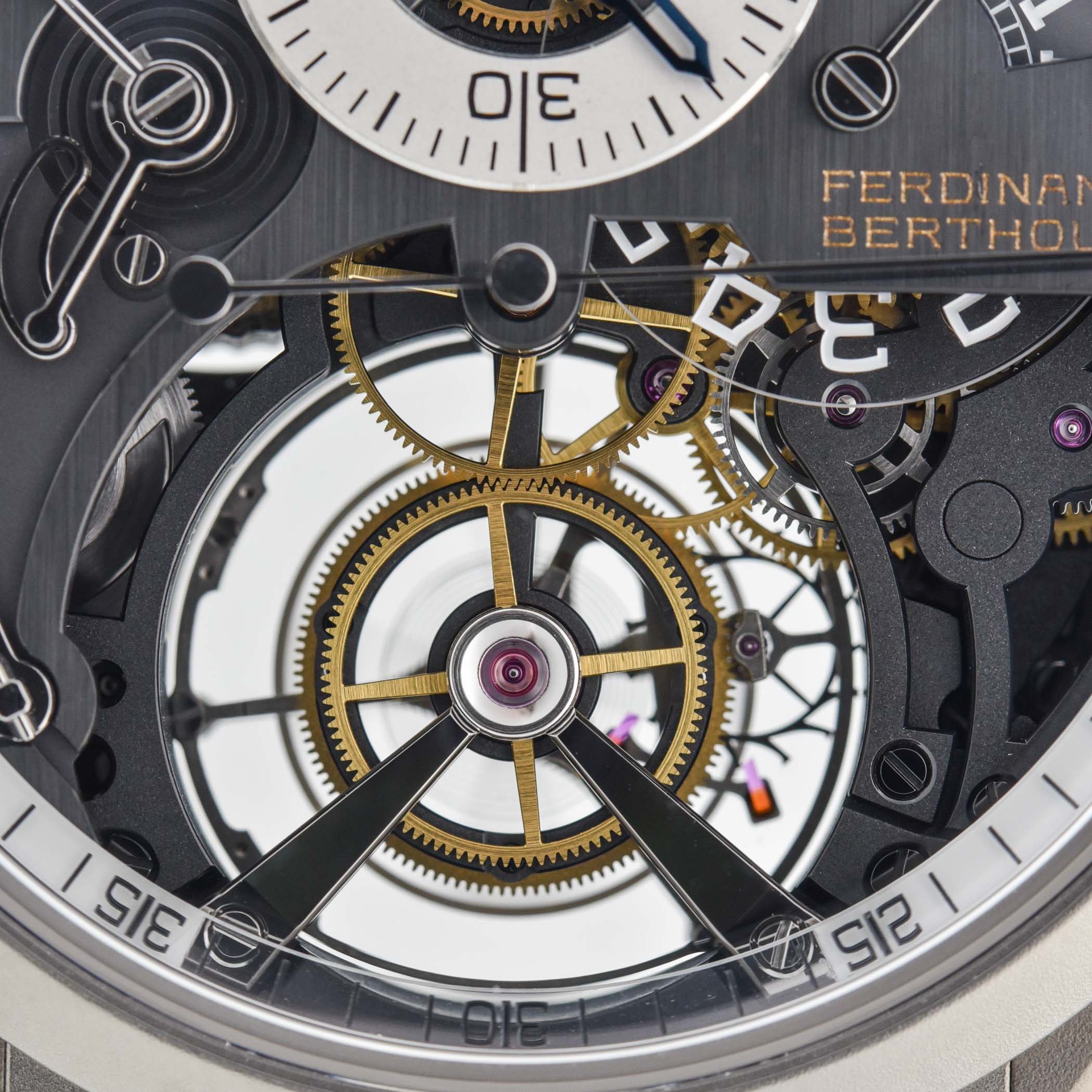 As you have come to expect from Ferdinand Berthoud, the finishing is spectacular. All components are decorated with meticulous attention. The overall look is quite technical as many components feature black PVD coating, alternating with polished, matte, vertical satin-brushed and sandblasted finishes.