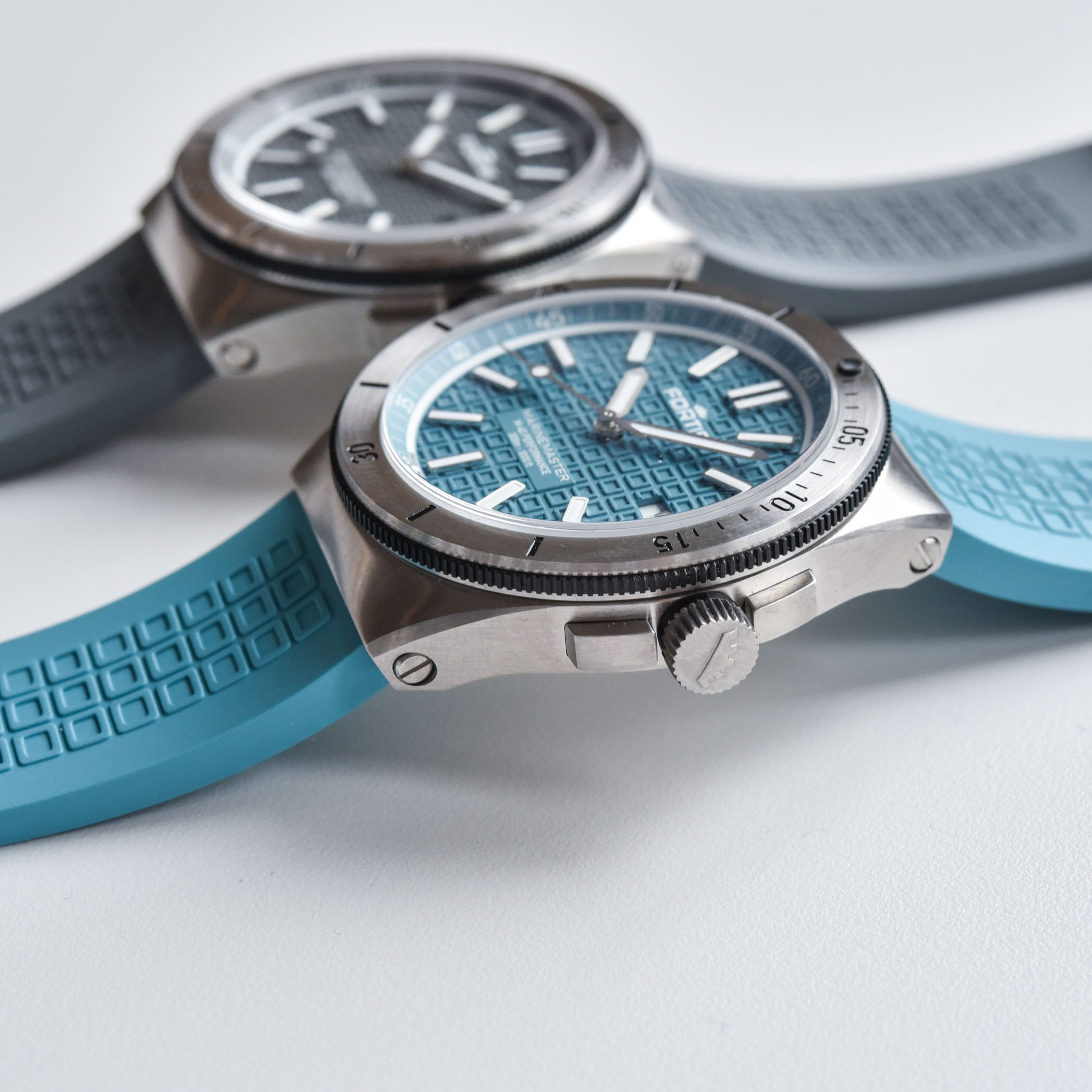 The Fortis Marinemaster M-40 is worn either on a steel bracelet or on a flexible integrated ‘Horizon’ rubber strap. The brand’s three-link block bracelet is robust yet flexible – its safety folding buckle is fitted with a practical quick-adjustable extension. The rubber strap matches the dial’s colour and pattern. It comes with a pin buckle and the screwed lugs ensure a secure attachment to the case.