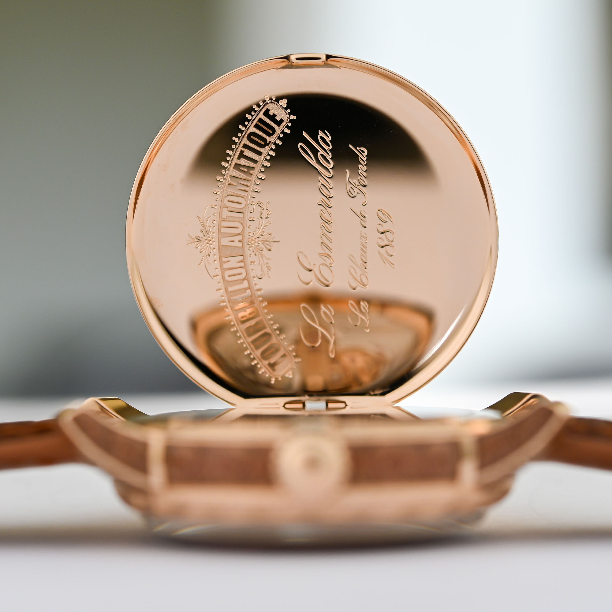 While Girard-Perregaux is currently associated with the sporty Laureato collection, the brand’s first brush with international fame was thanks to a historic watch known as La Esmeralda. Distinguished by its three gold bridges and tourbillon, Constant Girard’s La Esmeralda pocket watch won a gold medal at the 1889 Paris Universal Exhibition. Since then, the three arrow-shaped bridges have become integral to the brand’s identity, appearing in contemporary adaptations and more grandiose editions like the La Esmeralda Tourbillon “A Secret” Eternity Edition. Coinciding with Geneva Watch Days, Girard-Perregaux launches another high-end interpretation of La Esmeralda in a pink gold case with lavish finishings and a secret hinged cover on the caseback.