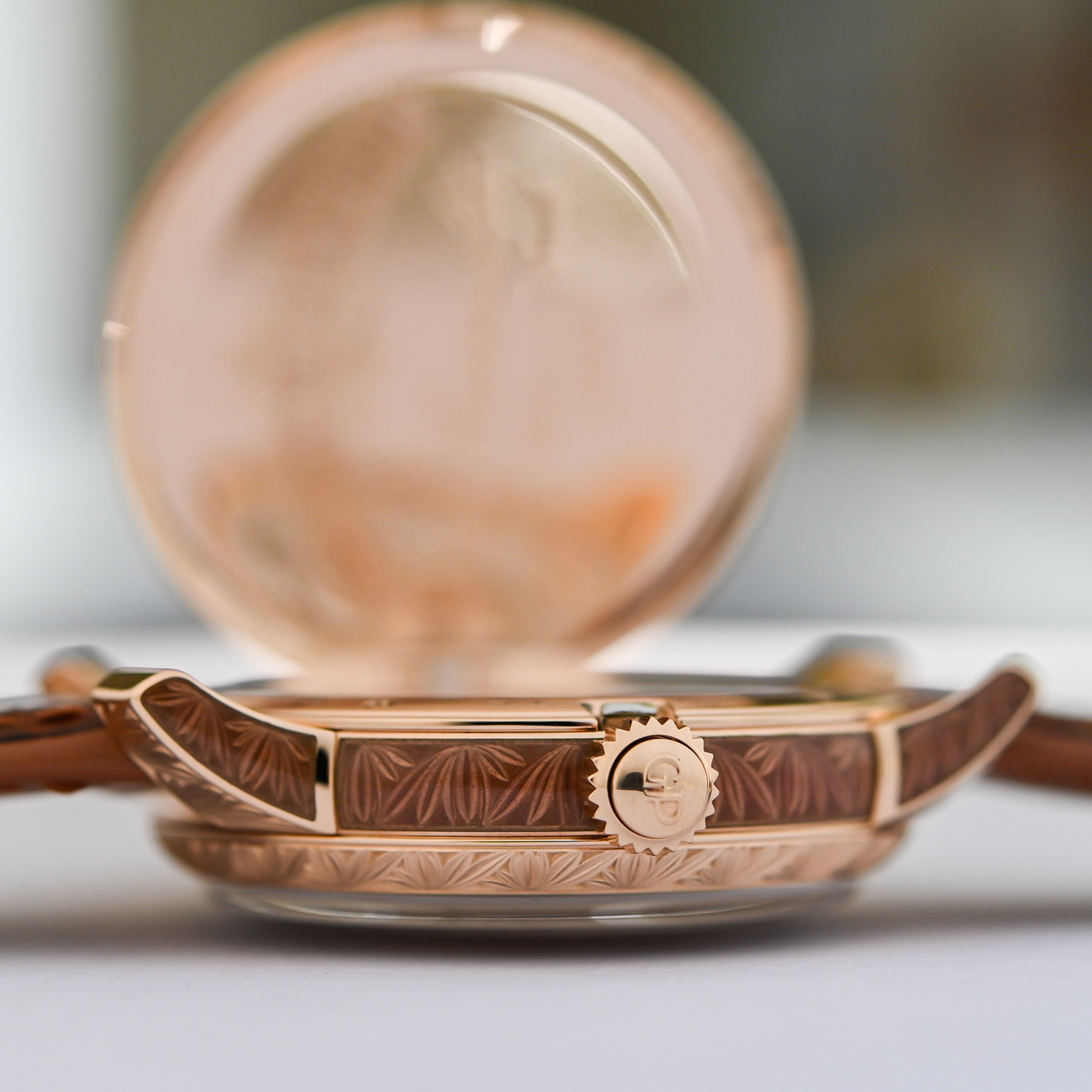 The pink gold caseback is engraved with three horses galloping across a sunray guilloché landscape enhanced with Grand Feu enamel. A pusher releases the secret cover to reveal the in-house automatic GP09600-2083. The pink gold motion-work bridge and marking plate are designed to emulate the shape of the bridges on the dial. Beating at 21,600vph, the movement delivers a minimum power reserve of 50 hours when fully wound. The watch comes on a brown calfskin strap with an engraved pink gold buckle and is delivered with a complimentary black alligator strap.