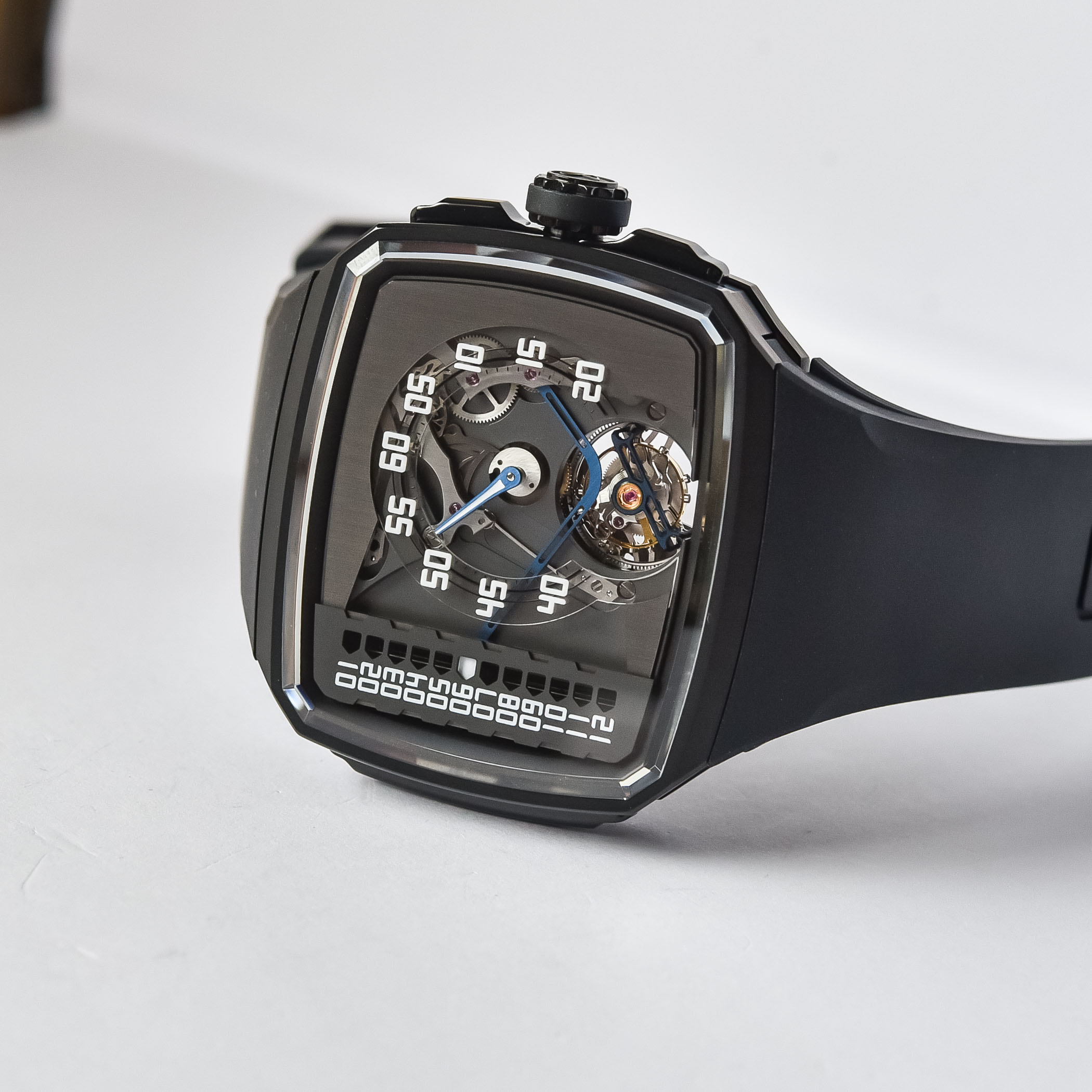 The dial of the Hautlence Linear Series 2, just like last year’s model in steel and blue, is all about depth and layers. Traditionally, Hautlence watches relied on jumping indications and retrograde hands, with full exposure of the mechanism driving these complex displays. This hasn’t changed in the newest collections. The Linear Series 2 combines features a scale on the left side, displaying the hours in a linear way, thanks to an exposed linkage. A small white pointer on the end of the linkage indicates the hour on the vertical scale. Once the 12 numeral is passed, the snail at the centre of the dial disengages the probe to release the accumulated energy. The linkage then jumps and returns to the 1 numeral. Minutes are displayed centrally in a classic way, and read on a sapphire crystal disc with raised white numerals. And of course, the lower part is dominated by the one-minute flying tourbillon under a blue openworked bridge. The dial here follows the theme of the case, with most areas coated in grey or black, with only a few parts in the brand’s signature blue colour.