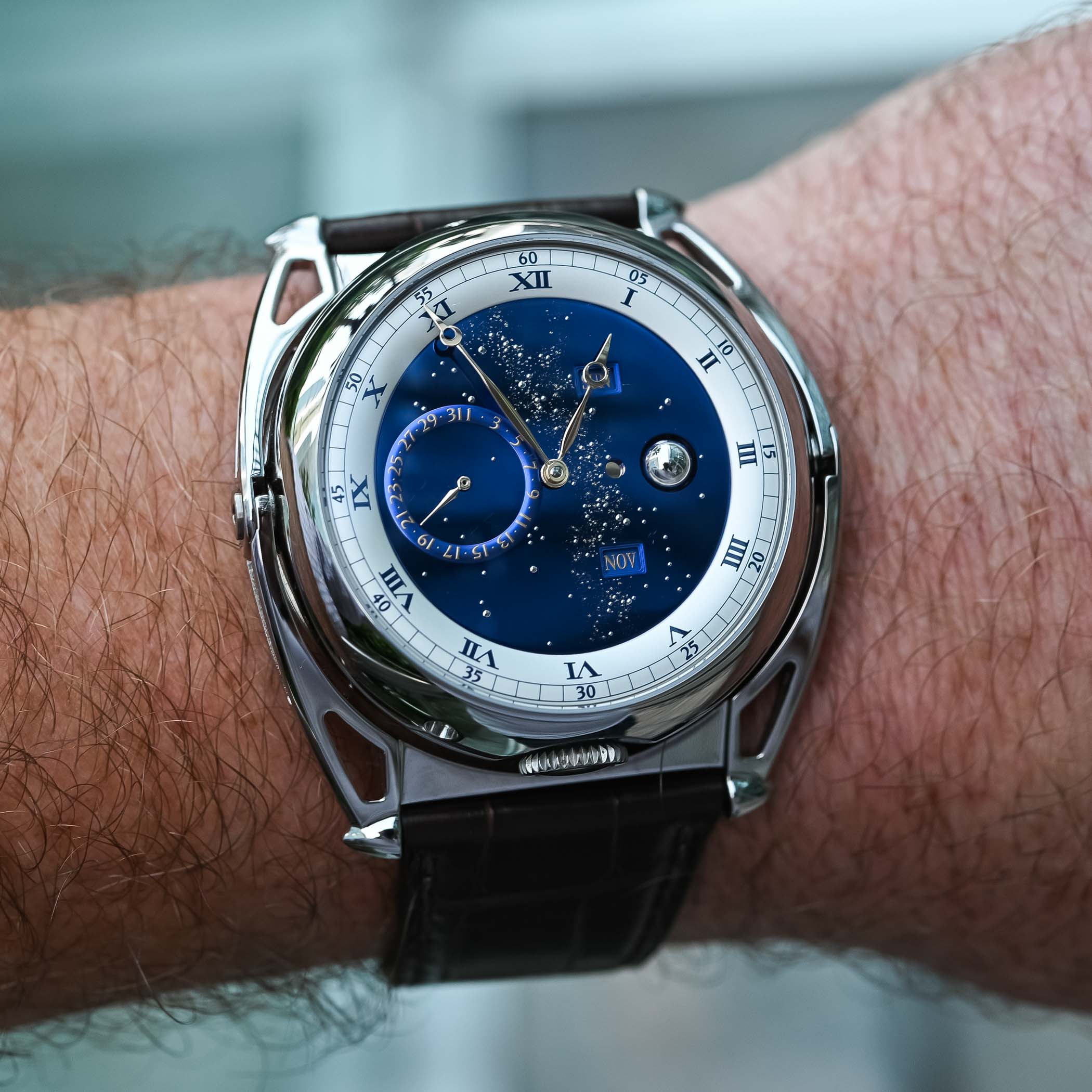 Positioned beneath the deltoid bridge on the right side of the dial is the silver-toned track revealing the age of the Moon, indicated by an arrow-shaped blue indicator that performs a retrograde jump at the end of the month back to the beginning of the cycle. The small aperture at 9 o’clock indicates the end of the power reserve.