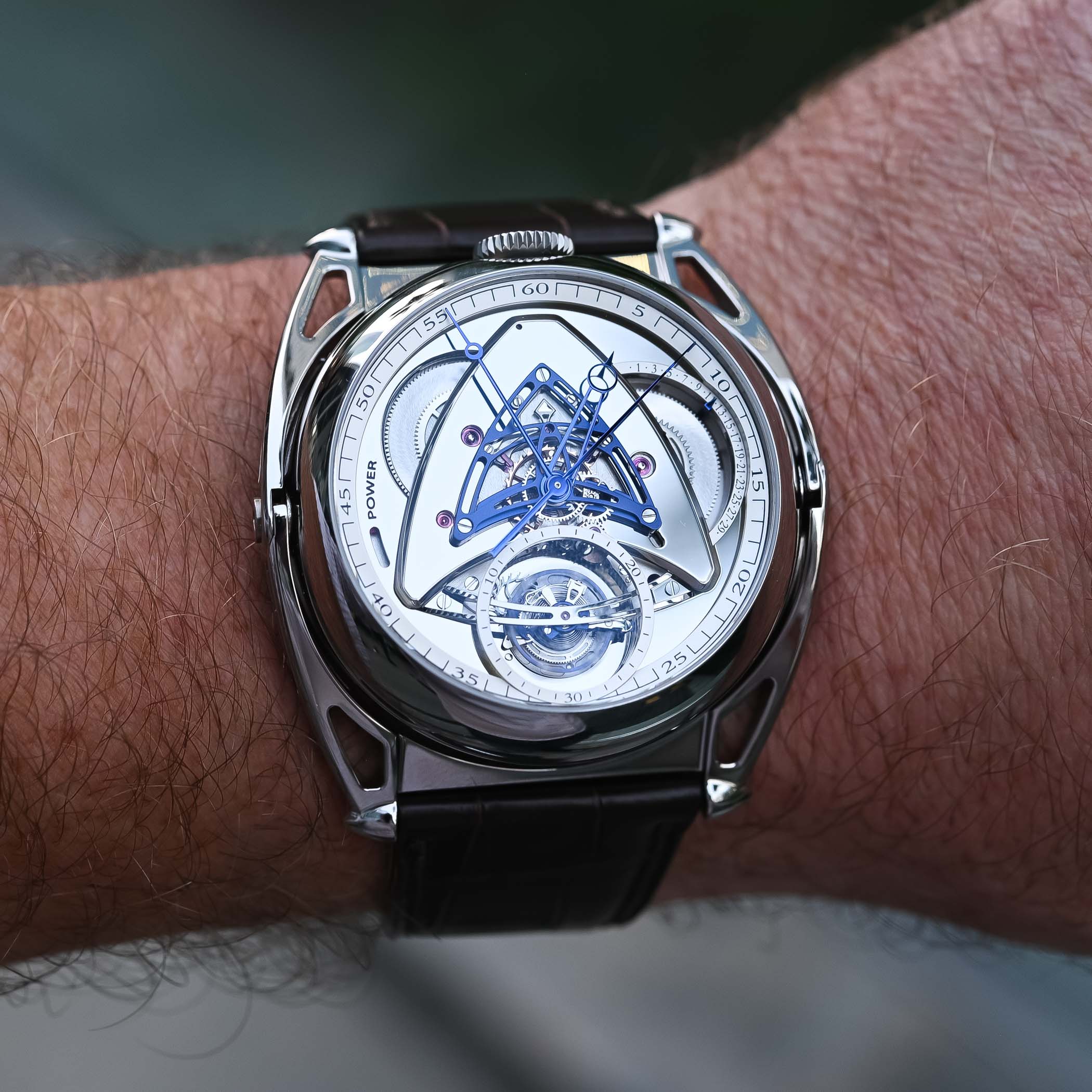 Crafted in polished grade 5 titanium, the double-sided hunter-style case has a diameter of 43.3mm and a thickness of 13.85mm (relatively thin considering the number of complications). The crown is at noon on the front side and at 6 o’clock on the reverse, and the signature floating lugs are equipped with a pivoting system. Operated by a cam indexing system, the case aligns perfectly with the floating lugs that follow the contours of the wrist.