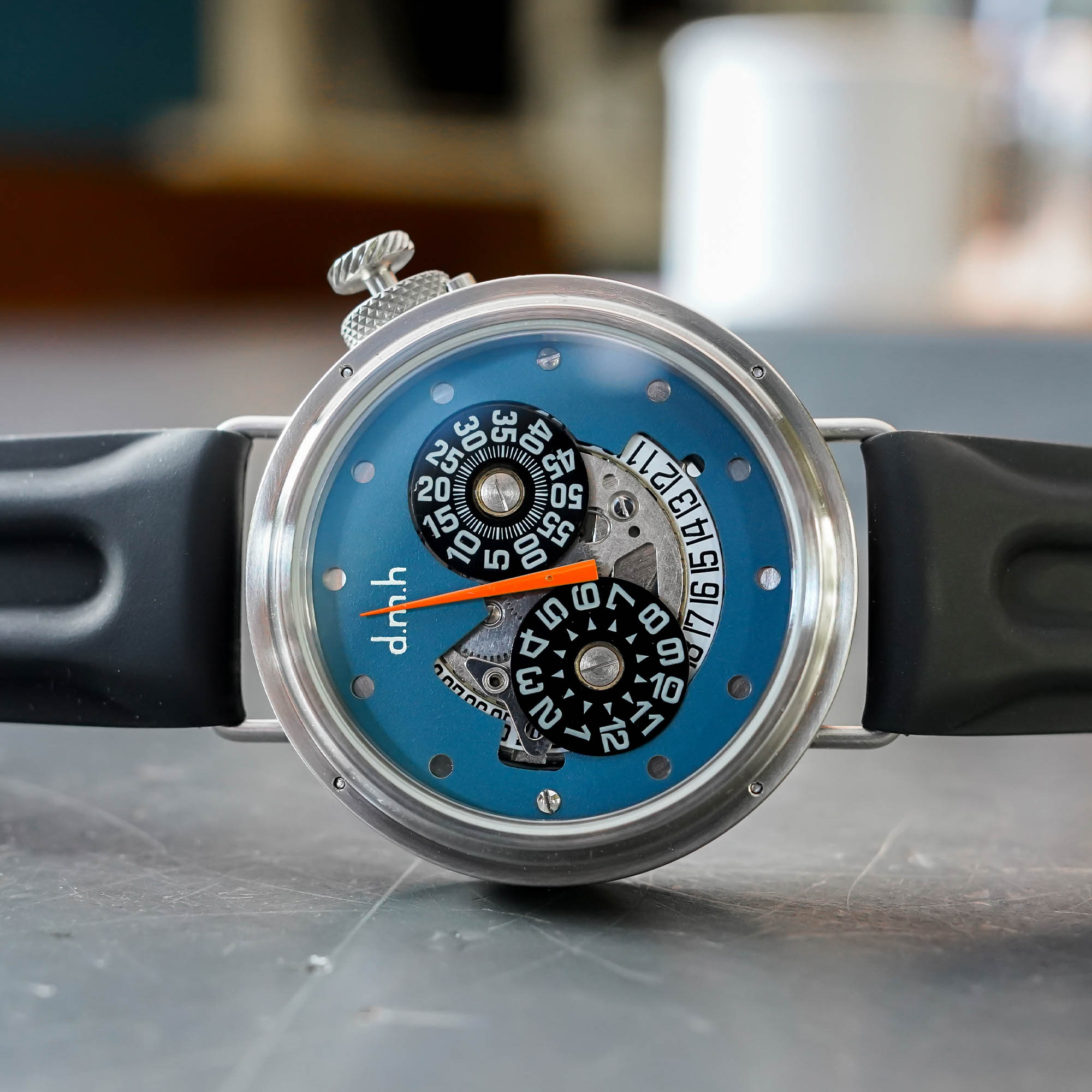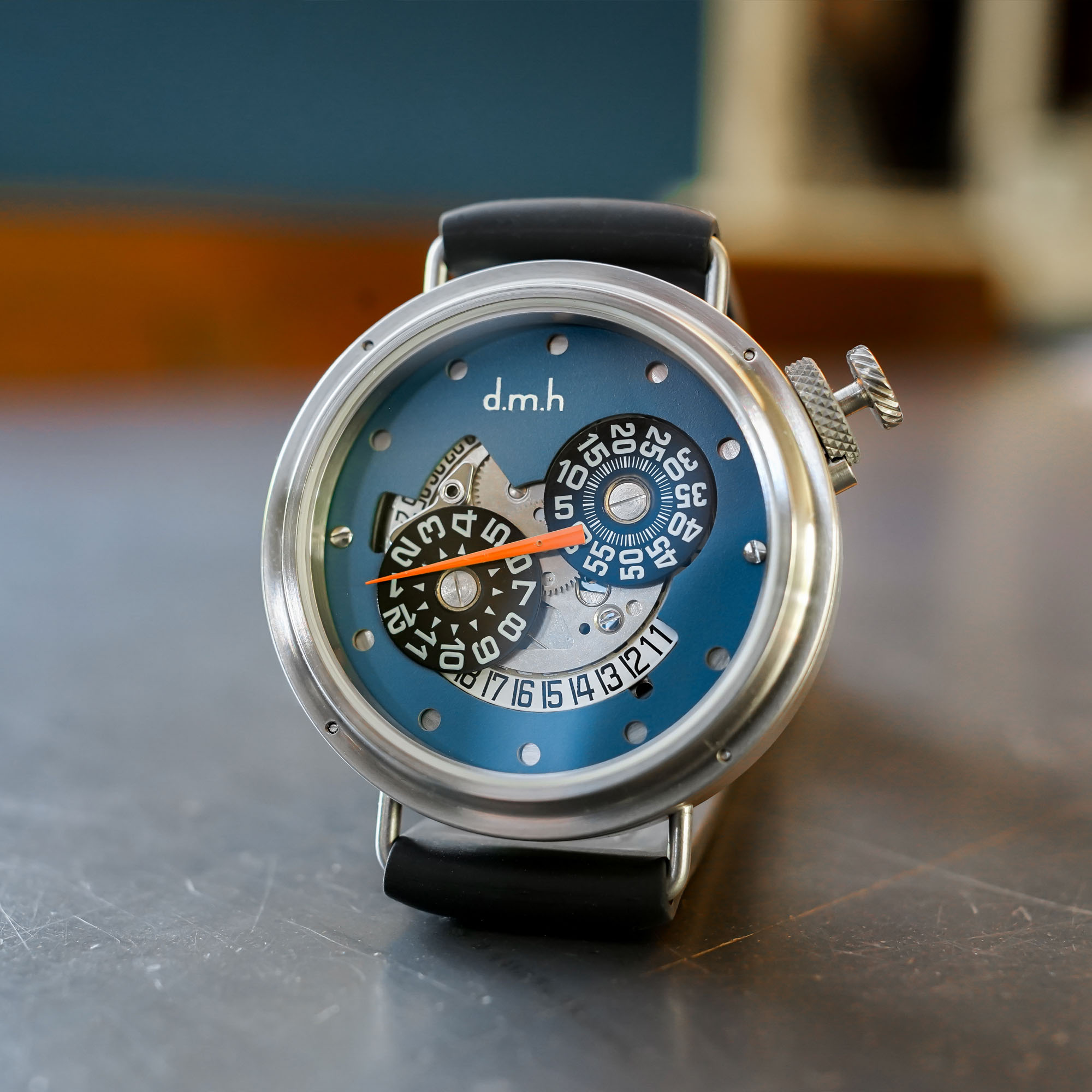 The Jump Hour watch is fitted to a leather or rubber strap and has a base price of EUR 2,795. It can also be ordered with a bronze case, but that affects the price a little. Each watch that leaves the d.m.h. atelier is unique by the way, designed and finished in close contact with the client. The lead time for a watch is a little over a year at the moment, as the watches are made to order, one by one. The wait is well worth it, however, as it’s a watch unlike any other. Plus, you’re dealing directly with the watchmaker himself, which is an extremely rare but satisfying element when purchasing a watch!