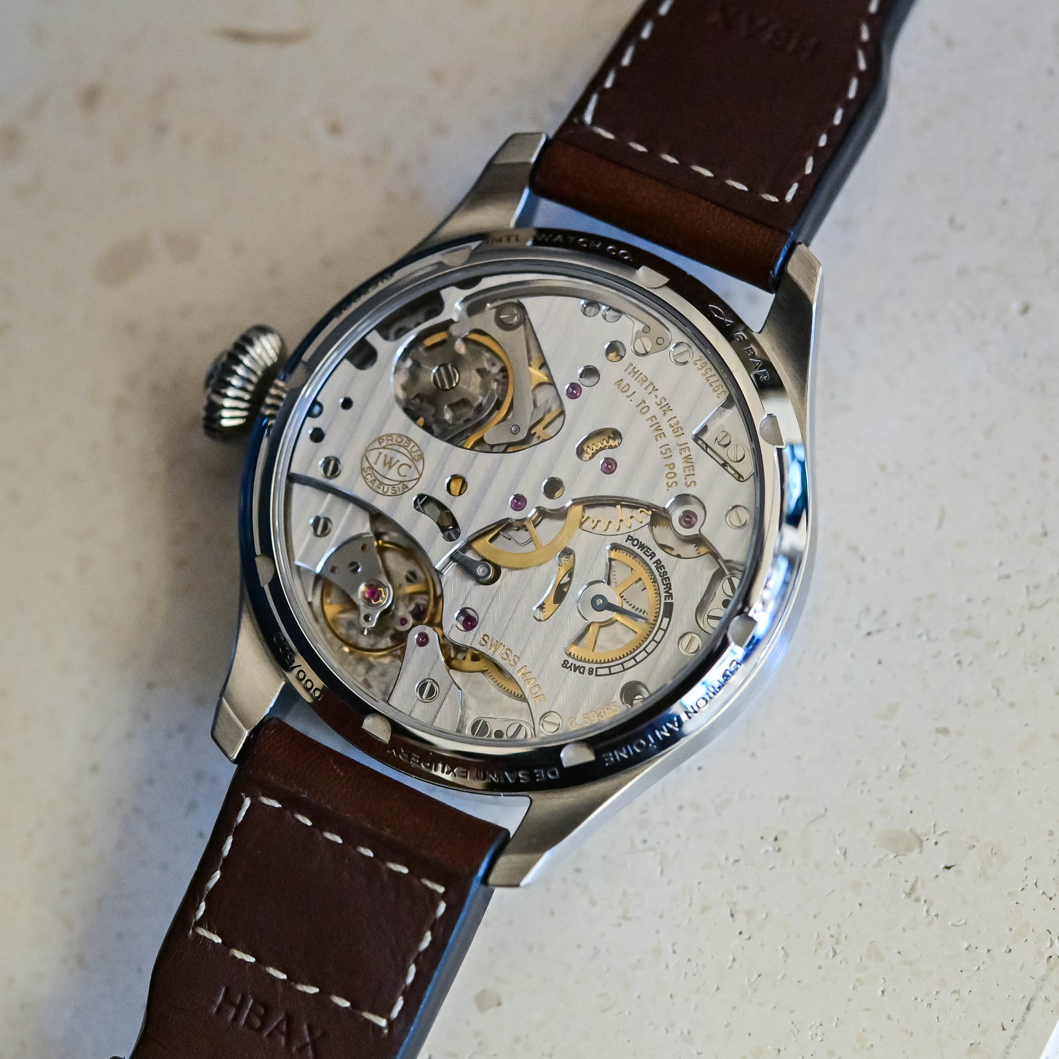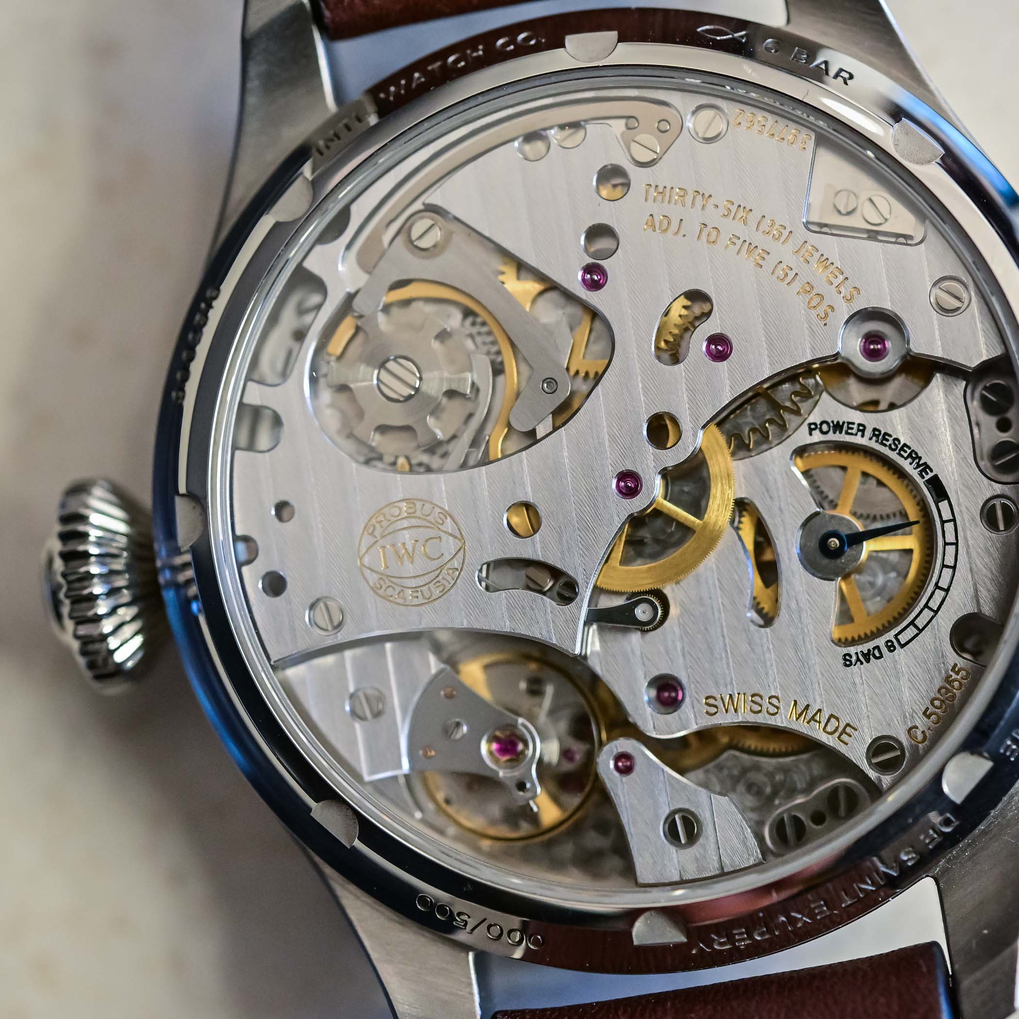 IWC’s in-house manual-winding monopusher chronograph movement with an 8-day power reserve, calibre 59360, made its debut inside the Portofino Monopusher of 2014, followed by the Portugieser Edition “Laureus Sport for Good” in 2020. Marking IWC’s third chronograph developed and manufactured in Schaffhausen – alongside calibres 89000 and 69000 – the monopusher chronograph module is mounted on the back of the base 59000 movement. It also happens to be the brand’s only manual-winding chronograph movement, and 70 turns of the crown are enough to ensure the maximum power reserve of eight days. The monopusher module, which consists of 66 parts, is a masterpiece of precision engineering and specific critical components, like the intermediate wheel, are manufactured using the Liga process. As with other IWC chronographs, it is a column-wheel chronograph, and its large dimensions can be distinguished clearly through the transparent caseback at around 10 o’clock. The power reserve indicator, featured on the dial of the Portofino and Portugieser models, is now displayed on the movement.