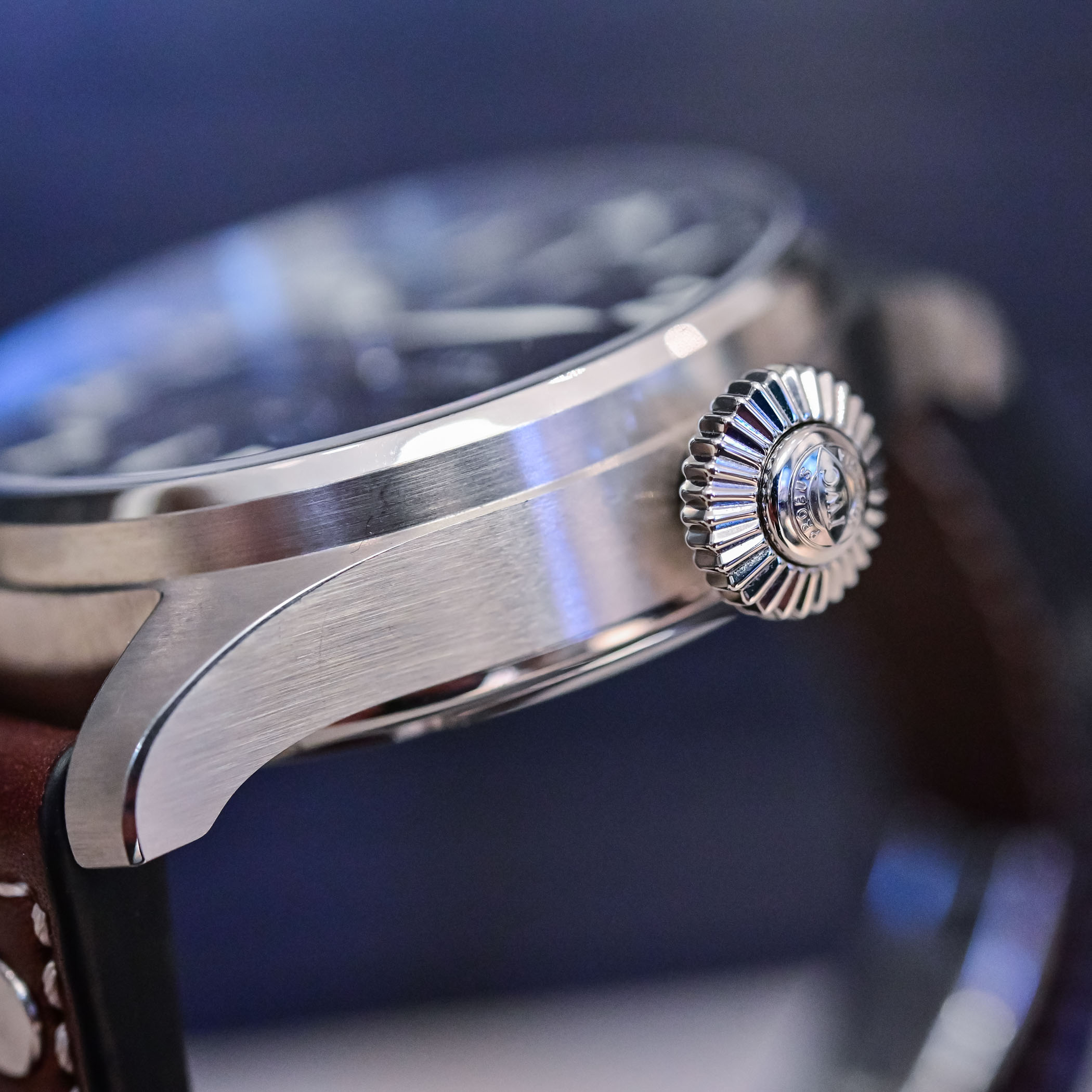 As with all “Le Petit Prince” editions, the dial features the signature deep blue with a sunray-brushed finishing. The vertical layout of the counters is clean and symmetric with a recessed and snailed 60-minute totaliser for the chronograph at 12 and small seconds at 6 o’clock. The large stylised Arabic numerals are applied to the dial and filled with luminescence, as are the propeller-style hands and the triangle and two dots at noon. Substituting the numeral 3 is a date window with a white background.