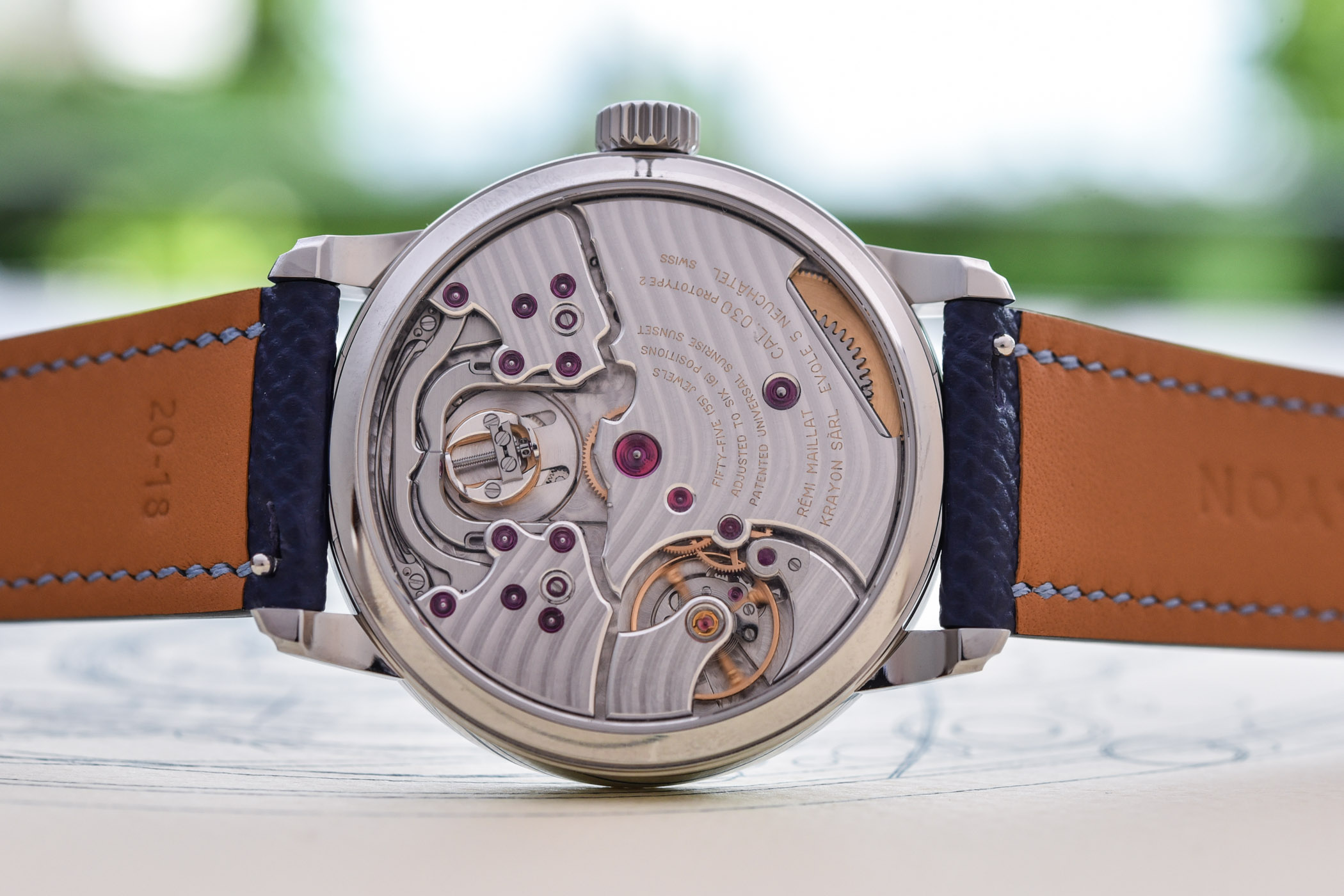 On the occasion of Only Watch 2021, Krayon created a special version of the model. First, this unique piece is equipped with the prototype calibre that enabled the complication’s development and that had been carefully preserved by Rémi Maillat. The 432-part hand-wound movement is beautifully decorated with complex angles, beautiful waves, polished jewel sinks, and more… The prototype caption is engraved on one of the bridges.