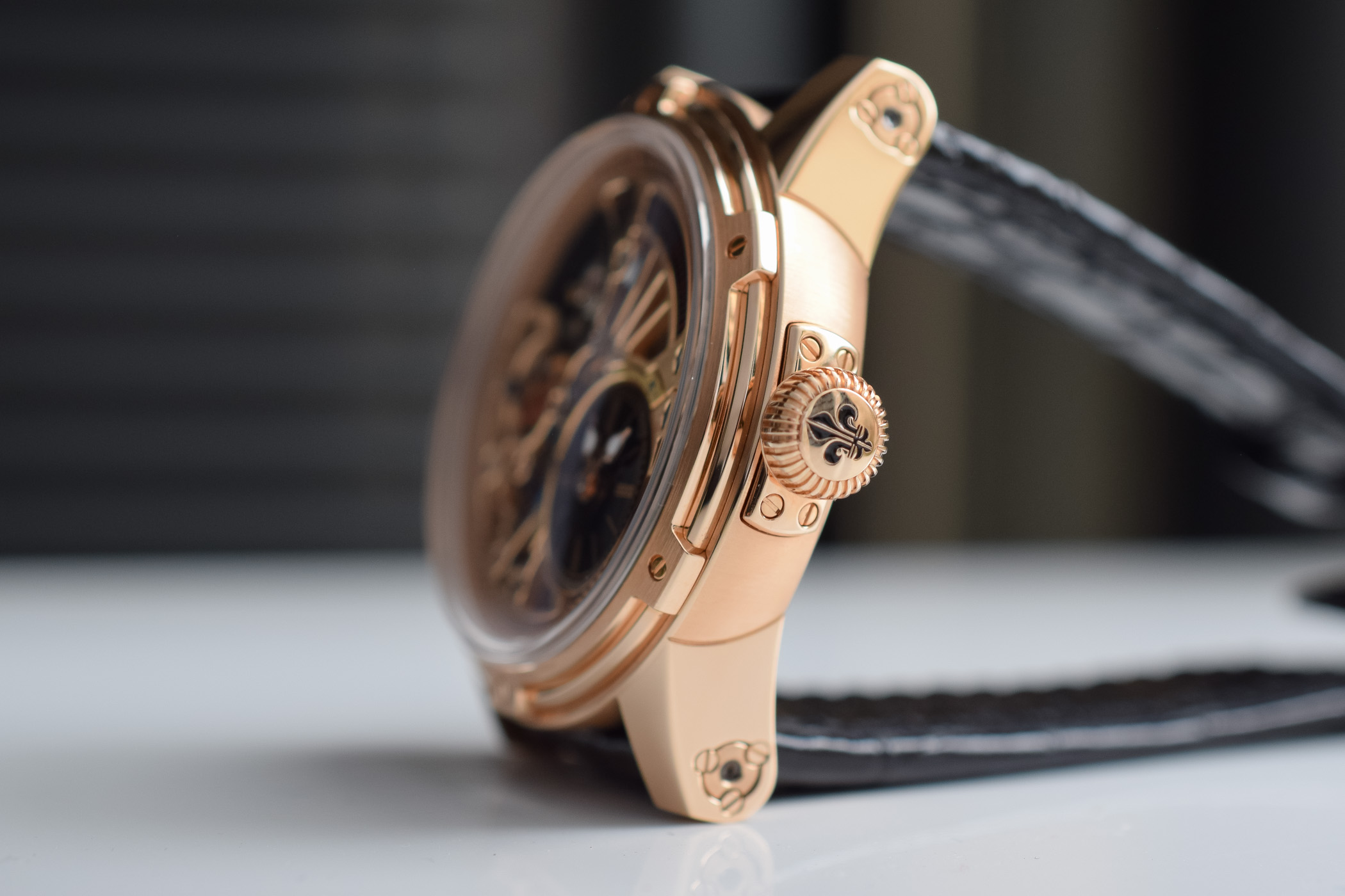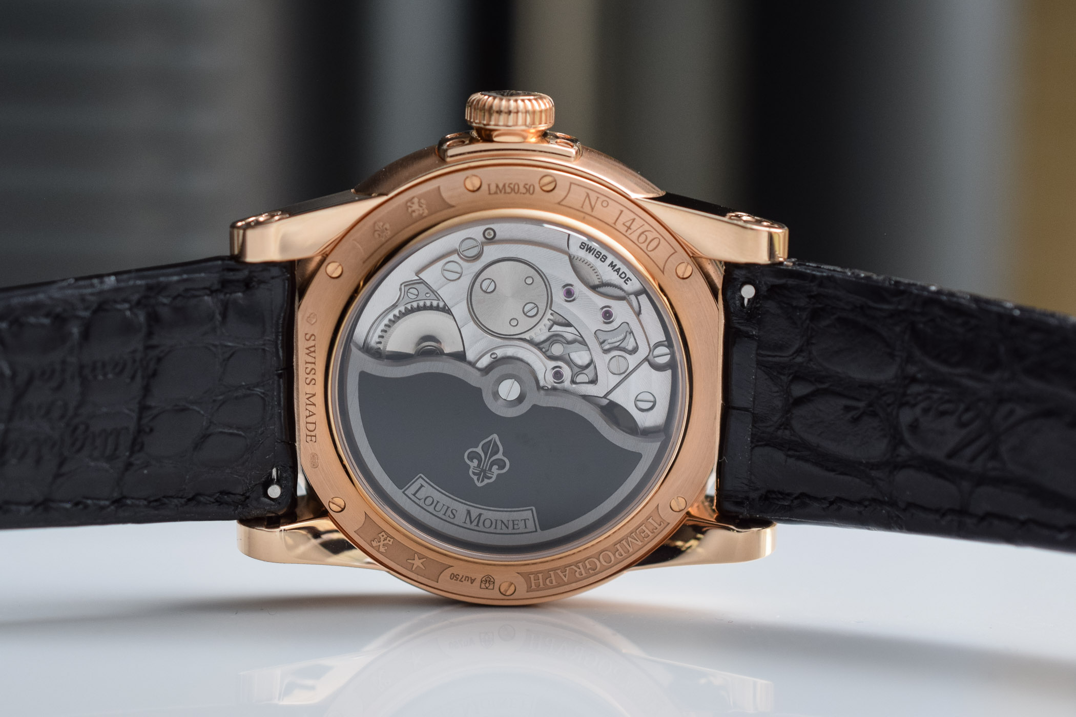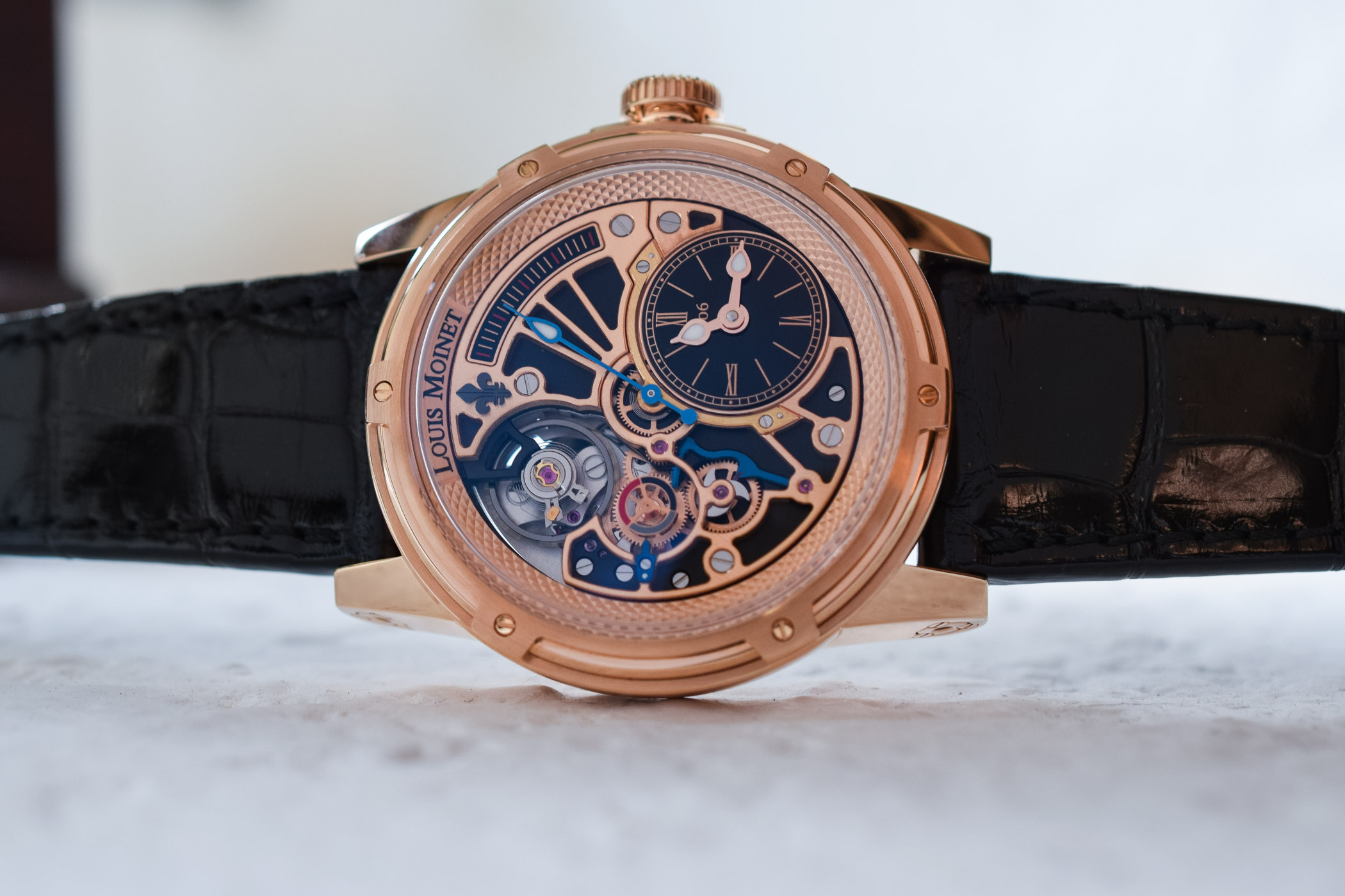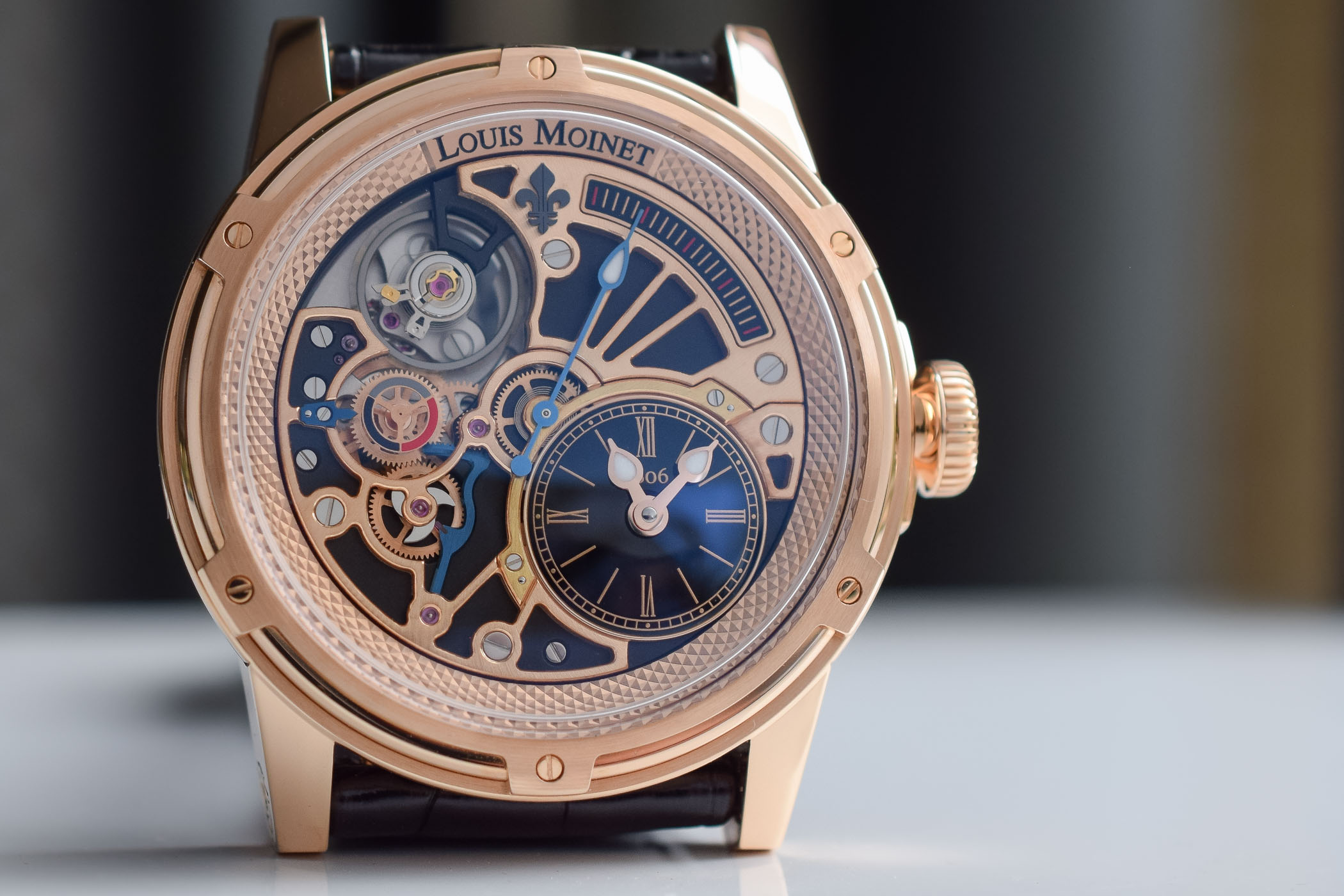 Now 44mm in diameter, the pink gold case features the traditional Louis Moinet style. Its signature six-screw bezel is topped by a slightly domed crystal and frames a flange adorned with a clous de Paris guilloché motif. The knurled crown is emblazoned with a lily. Water resistance is of 5 ATM/50m.