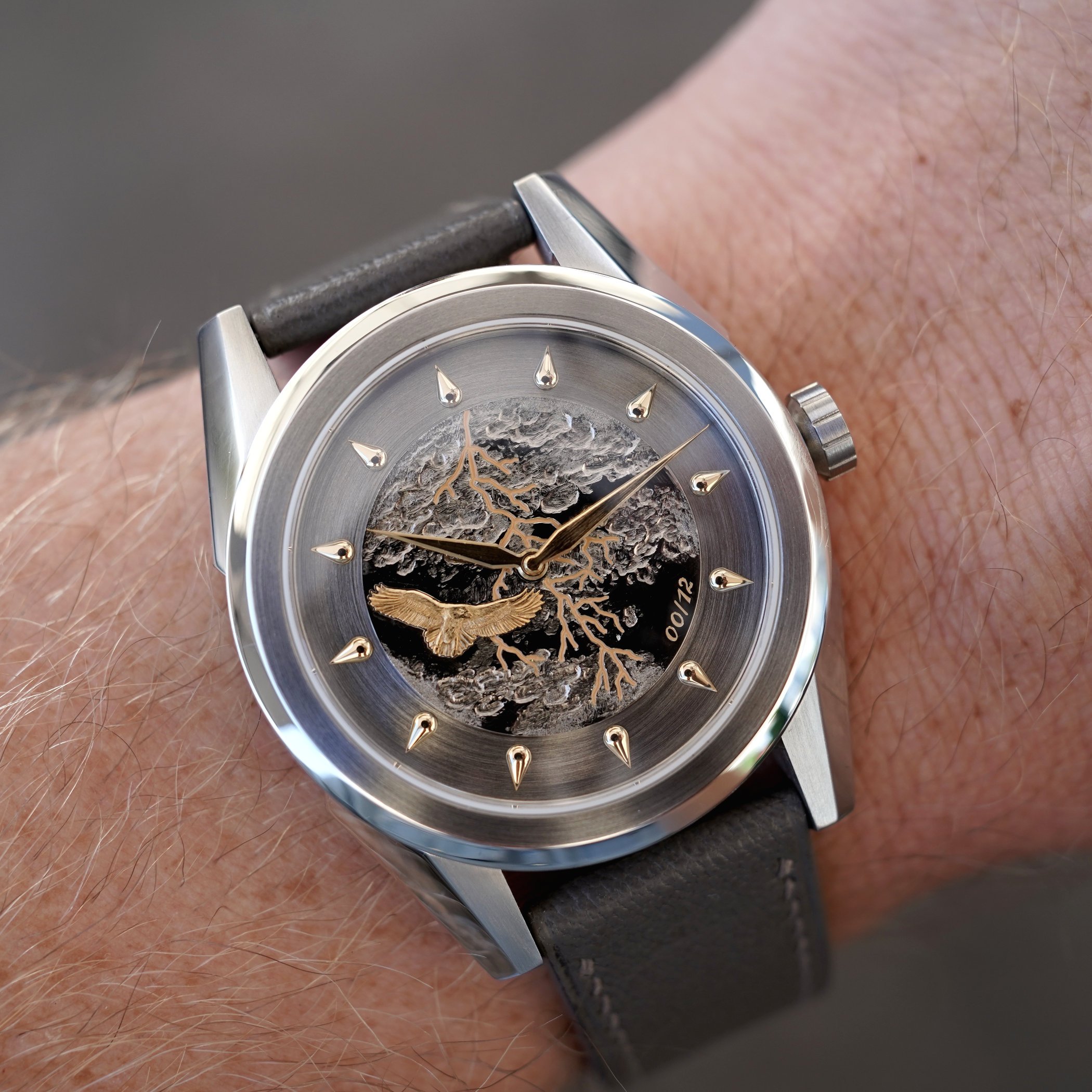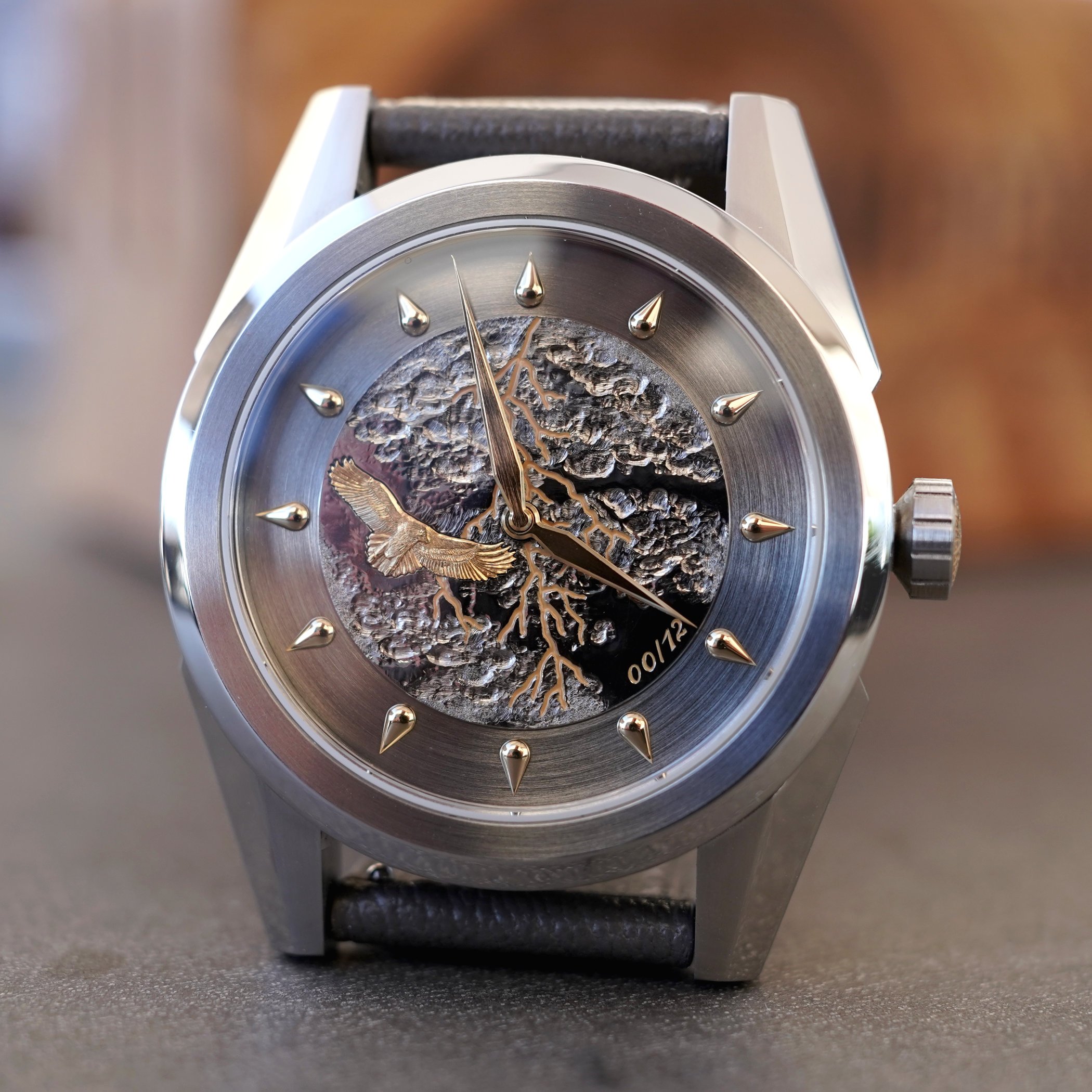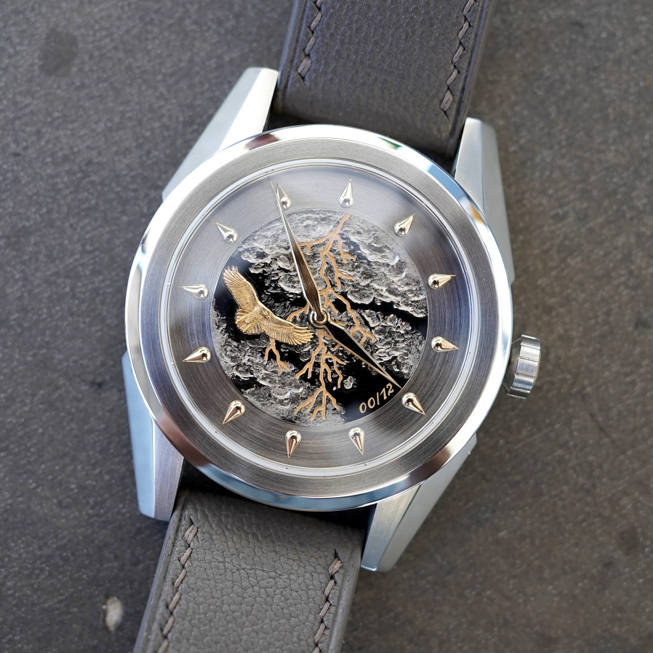 The dial is the literal star of the show, however, as it brings the Zeus theme to life. It starts with a solid gold blank, which is then hand-engraved by a specialist with a very specific image. Representing the Bringer of Storms is a forked lightning bolt coming down from the skies, as if Zeus himself has just thrown it down to earth in anger. Then, there’s the immensely detailed golden eagle, Aetos Dios, with over 200 individual feathers. The rest of the centre has a textured finish to mimic a storm, and is engraved with the individual number out of the run of 12 watches only. The outer ring is finished with a circular brushing and twelve polished, solid gold droplet hour markers falling towards the centre of the dial. It’s all very vivid, but also coherent. Each one will also be unique, as no two strokes of the master engraver will be the same. To add contrast, the base dial is coated in grey.