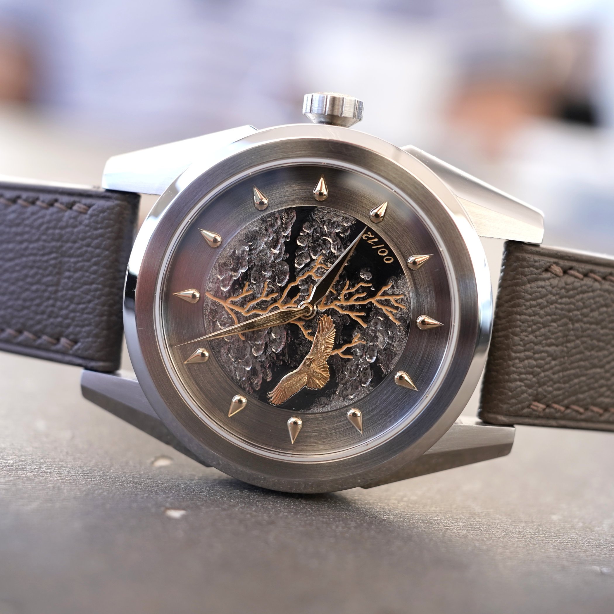 Manteio is the culmination of Alex Goetschi’s love for watches, background in mechanical engineering, and passion for both ornithology and storytelling. Heavily inspired by Greek mythology after reading Stephen Fry’s Mythos, the Zeus captures the divine spirit of the famous deity. Each detail is a homage to Zeus, the sixth child of Rhea and Cronus. Zeus’ father was haunted by a prophecy that his offspring would one day overpower him, and to prevent that, he swallowed each of his children. The exception is Zeus, who was hidden from Cronus on Earth by his mother Rhea. Brought up on the island of Crete by nymphs, the divine goat Amalthea and Melissa the bee, Zeus grew strong enough to confront and overthrow his father, becoming the King of the Gods and therefore fulfilling the prophecy.