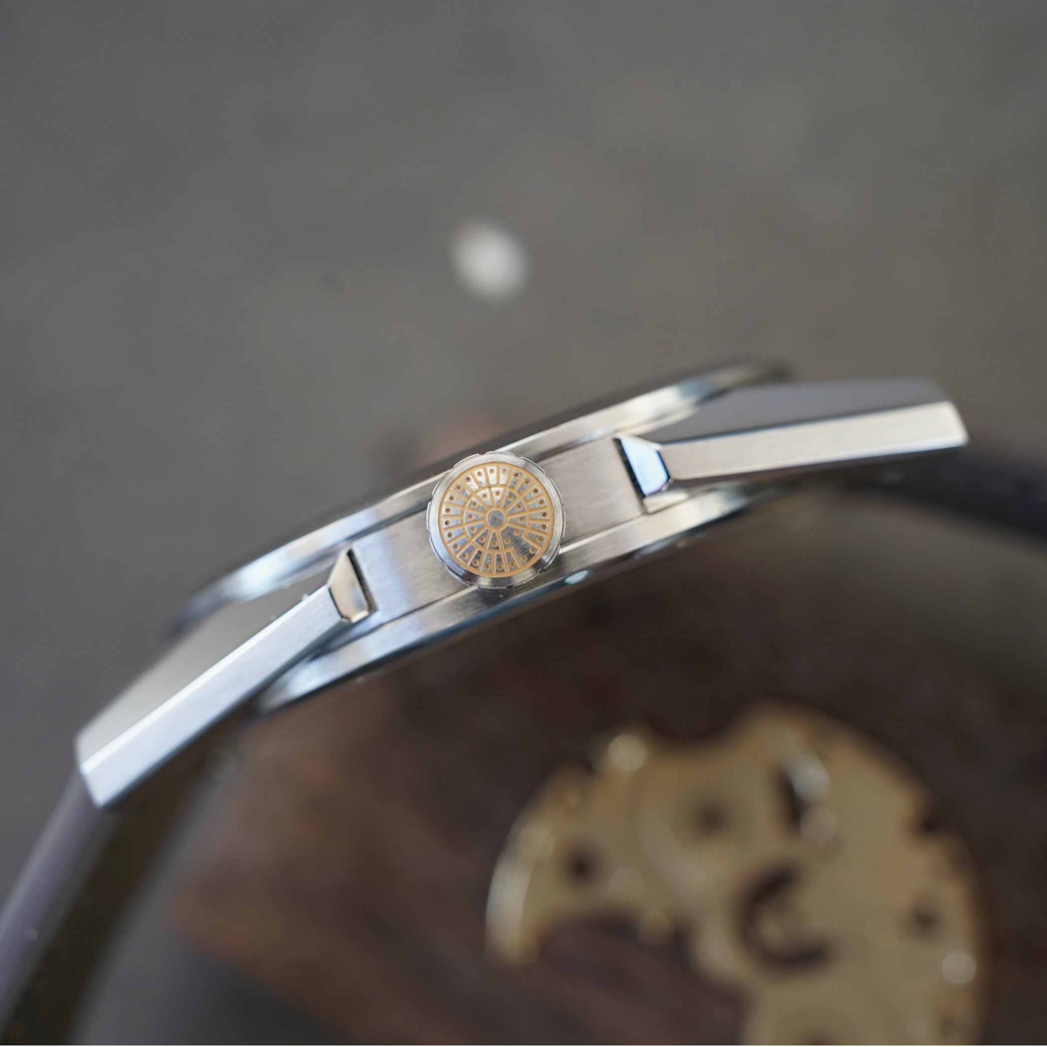 This divine inspiration is found all over the Manteio Zeus, which is the first in a series of Greek mythologically themed watches by Alex, under the Manteio name. The stainless steel case, which measures 39mm in width and 9.7mm in height, is quite striking. The shaped lugs especially catch the eye, as they are modelled after the pediment of a Greek temple. What’s also noticeable, and Alex talked about this previously, is the level of finishing. With a mix of brushed, polished and hand-bevelled edges to accentuate the strong lines, it certainly delivers on drama. The crown is hand-engraved with Manteio’s logo, resembling a Tholos (temples of the oracles) from above. The bezel has a strong slope to it and is polished to perfection. On both the front and the back, there is a sapphire crystal.