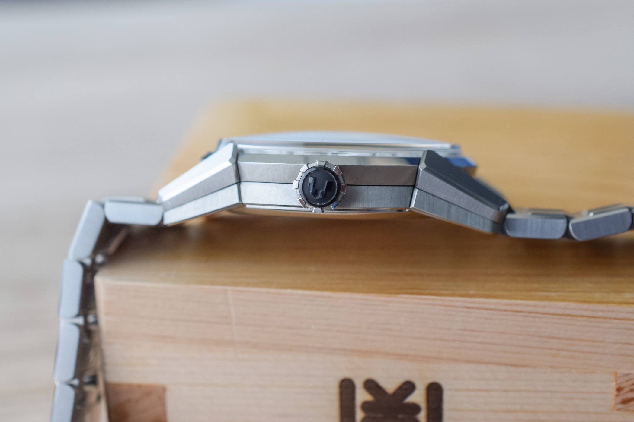 The Minase Divido is worn on a patterned leather strap or a steel bracelet closed by a folding buckle. Just like the case, the architecture and the finishing of the steel bracelet are surprisingly elaborate. There are no pinholes on the side of the bracelet but screws visible underneath. Each segment is screwed individually (and can be disassembled). It is remarkably articulated, hence flexible and comfortable on the wrist.