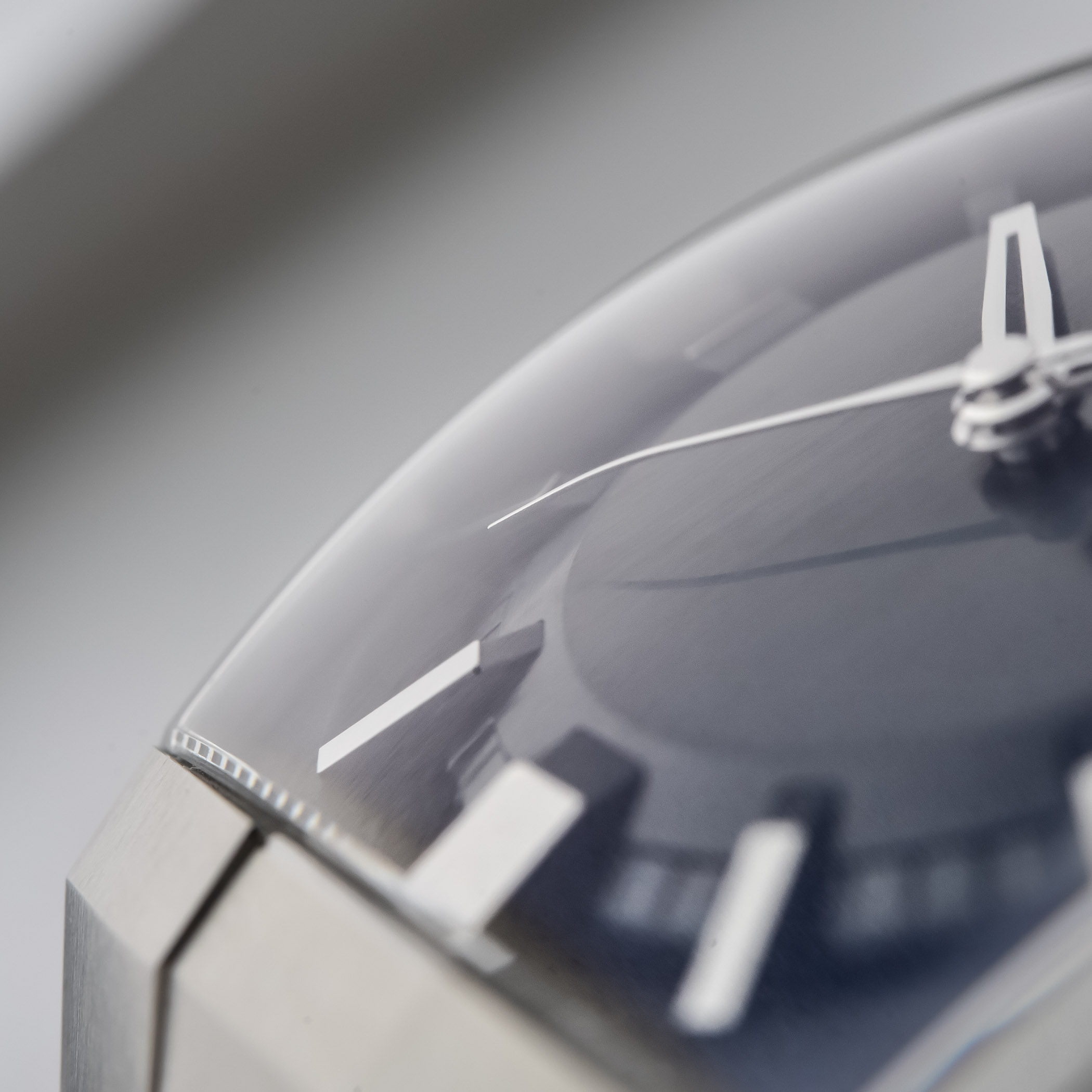 As the name suggests, the singular design of the Horizon watch was inspired by the harmonious, smooth curves of the horizon line – which can be seen with the elegant, soft curve of the double spherical crystal extending the lines of the case and continued with the bracelet. Like all Minase watches, this model’s architecture is based on an unusually high number of parts and original technical solutions. The “case-in-case” structure does not feature a dial in the typical sense. The movement is fitted into a container on top of which the index ring is fitted. Given the domed dial and crystal, the hands are delicately bent at the tip. With this construction, the dial/movement seems to be “floating” inside the case. This suspended structure creates an original sense of depth and the way the light plays within this case-in-case structure is eye-catching.