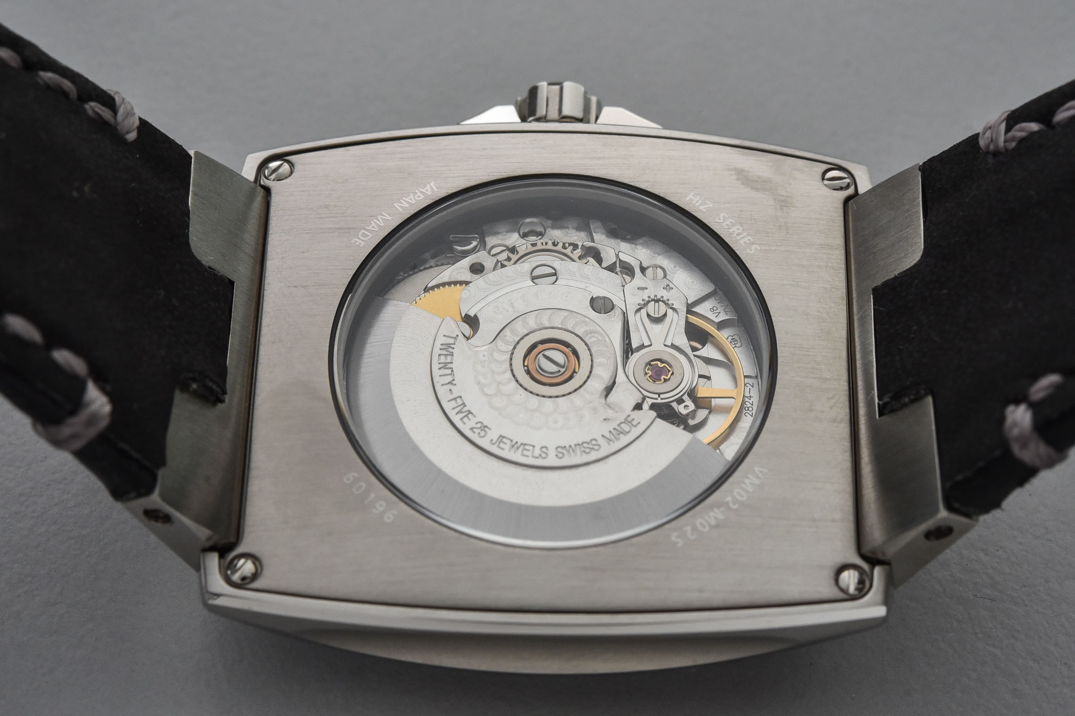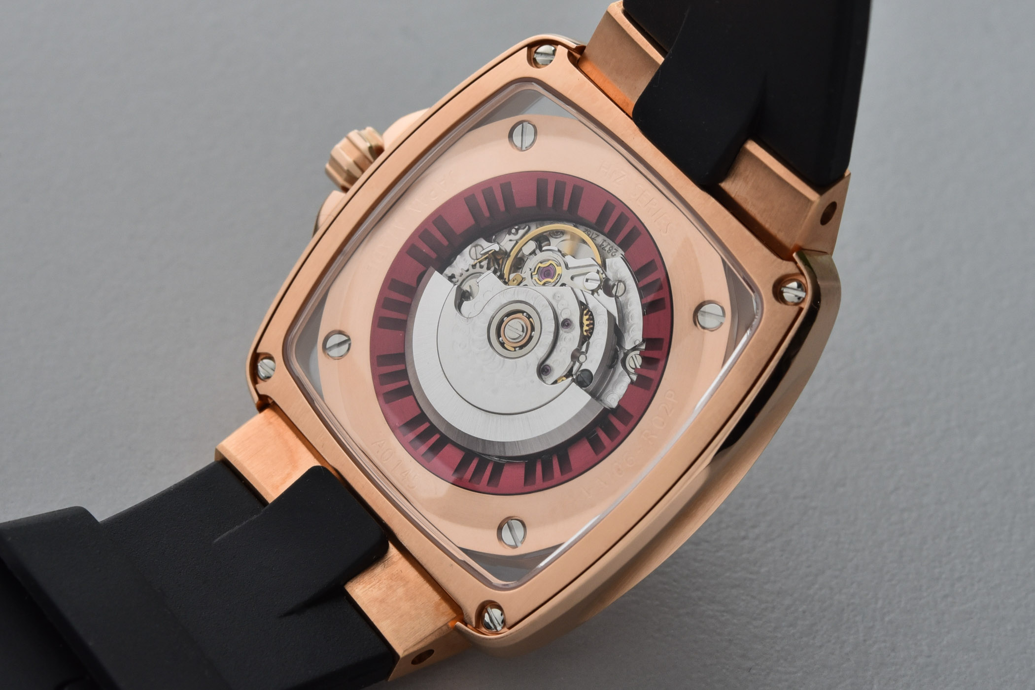 The elongated, ergonomic rectangular case of the Minase Horizon is 38mm x 51mm, with a 12mm thickness. It features soft curves except for the angular “lugs” and strap attachment. The Horizon is also available in a mid-size version that is 32mm x 40mm x 12mm. Besides the smaller proportions, the shape features more of a squarish design with a “TV-screen” opening. The model is available either in 316L steel or in black or gold-coloured PVD.