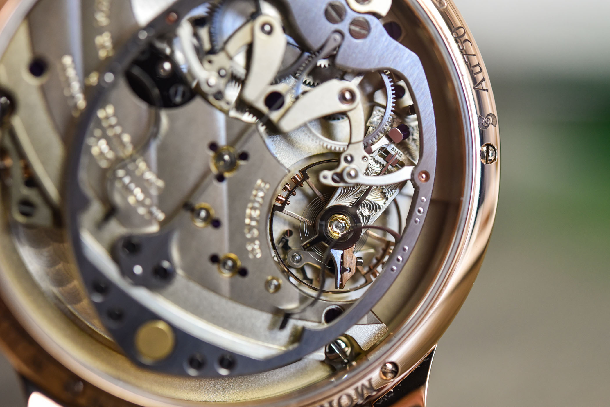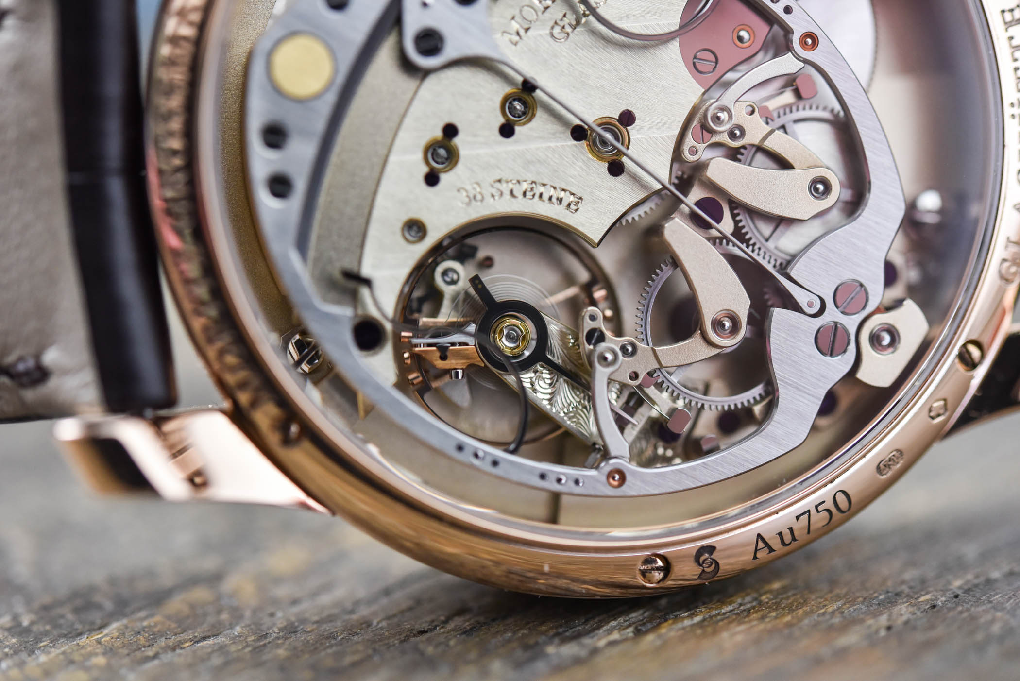 As you can see from the images, the finishing is also of the highest level. The broad Glashütte ribbing on the plates, the hand-engraved balance cock, the gold chatons with brown-violet annealed screws, hand-applied anglage, polished screw heads… It’s all typical Moritz Grossmann. The movement runs at a frequency of 21,600vph and has an in-house made Grossmann balance with 4 inertia and 2 poising screws to ensure it runs as smoothly as can be. Despite the complexity of the movement, the barrel stores a healthy 72 hours of power reserve when fully wound.