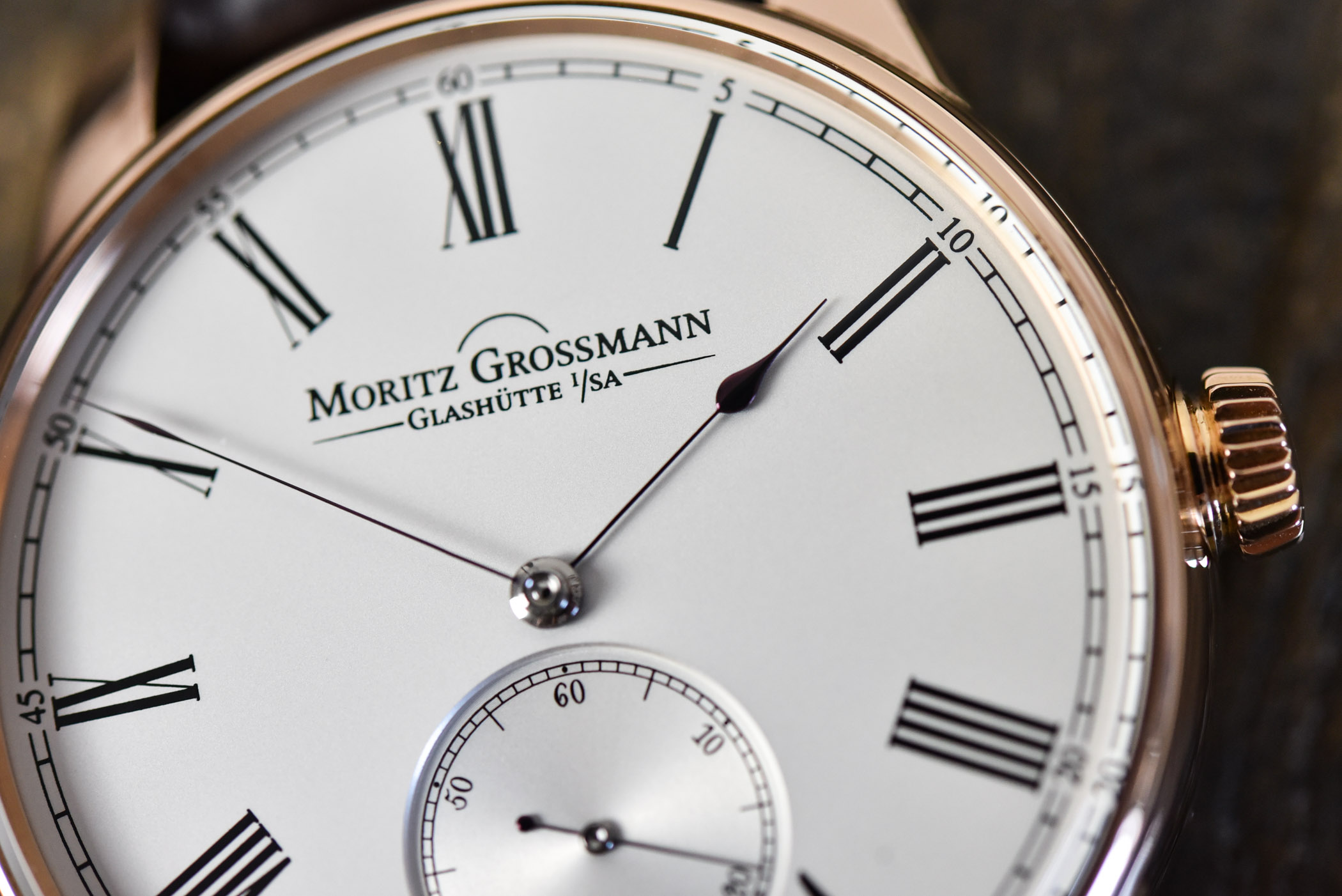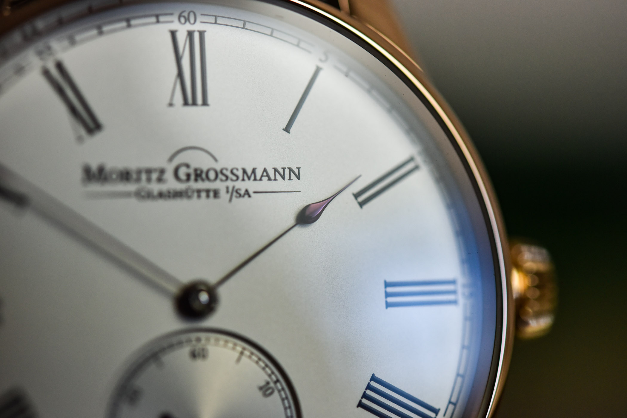 The design of the solid silver dial in opaline white is very classical, with elongated printed Roman numerals and a fine railroad-style minute track around the outer edge. Again, it’s a lesson in pure, elegant watchmaking, showing only the essentials. The large recessed sub-dial for the small seconds continues in the same vein, with a pad-printed one-minute scale in black. The top half of the dial shows the Moritz Grossmann logo with the designation ‘Glashütte I/SA’, meaning ‘Glashütte, In Saxony’. The rest of the dial is free of any decoration, apart from the ‘Made in Germany’ on the bottom curve of the minute track, proudly stating where it’s made.