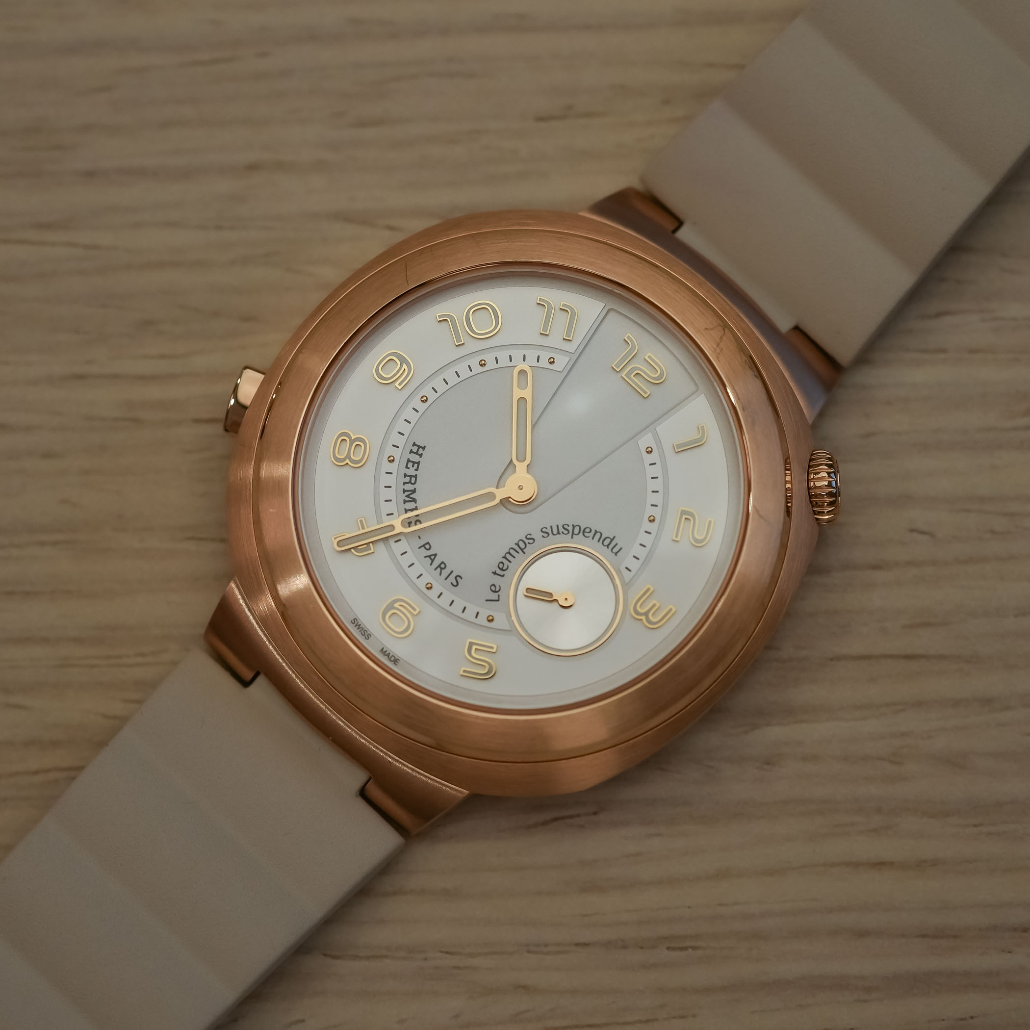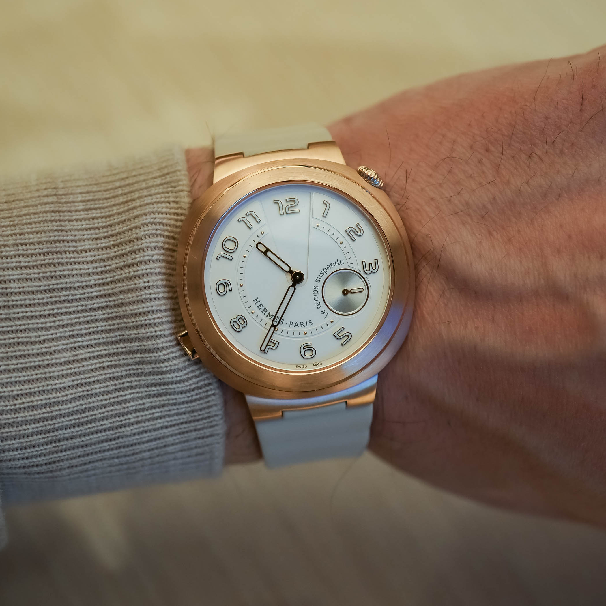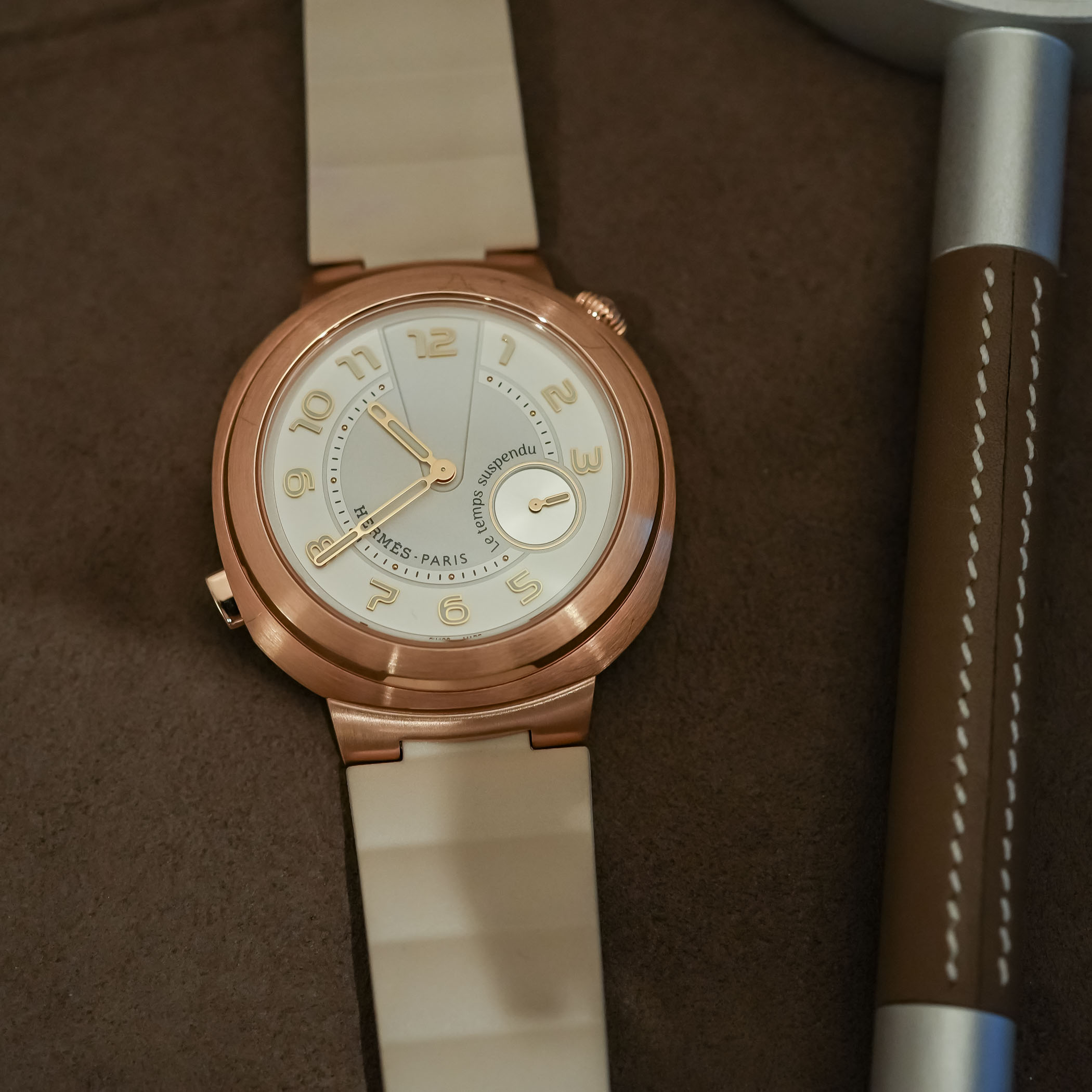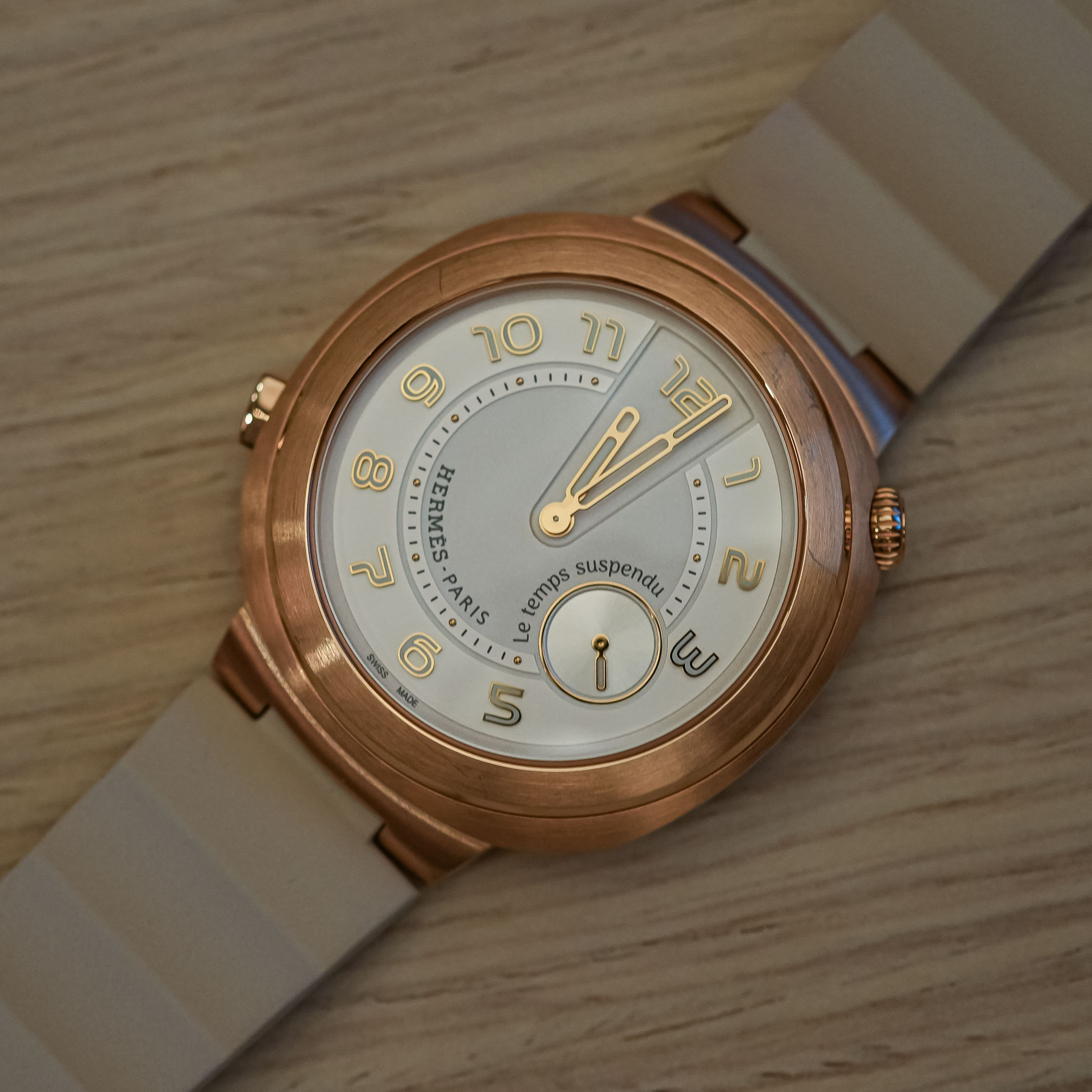 The 39mm case is limited to 750 5N rose gold with no steel option, and the crown is again between 1 and 2 o’clock. The mid-case also has a more tonneau shape for an interesting contrast of forms that Hermès calls a circle within a round shape. The brushed pattern of the case sides is interrupted by long polished sections, and a triangular button to suspend time sits at 8 o’clock. The bezel is smooth; the opaline silver-toned dial variant can also be ordered with 60 diamonds set in the bezel. An anti-reflective coated sapphire crystal protects the dial, there’s a sapphire exhibition caseback and water resistance is rated at 100 metres.
