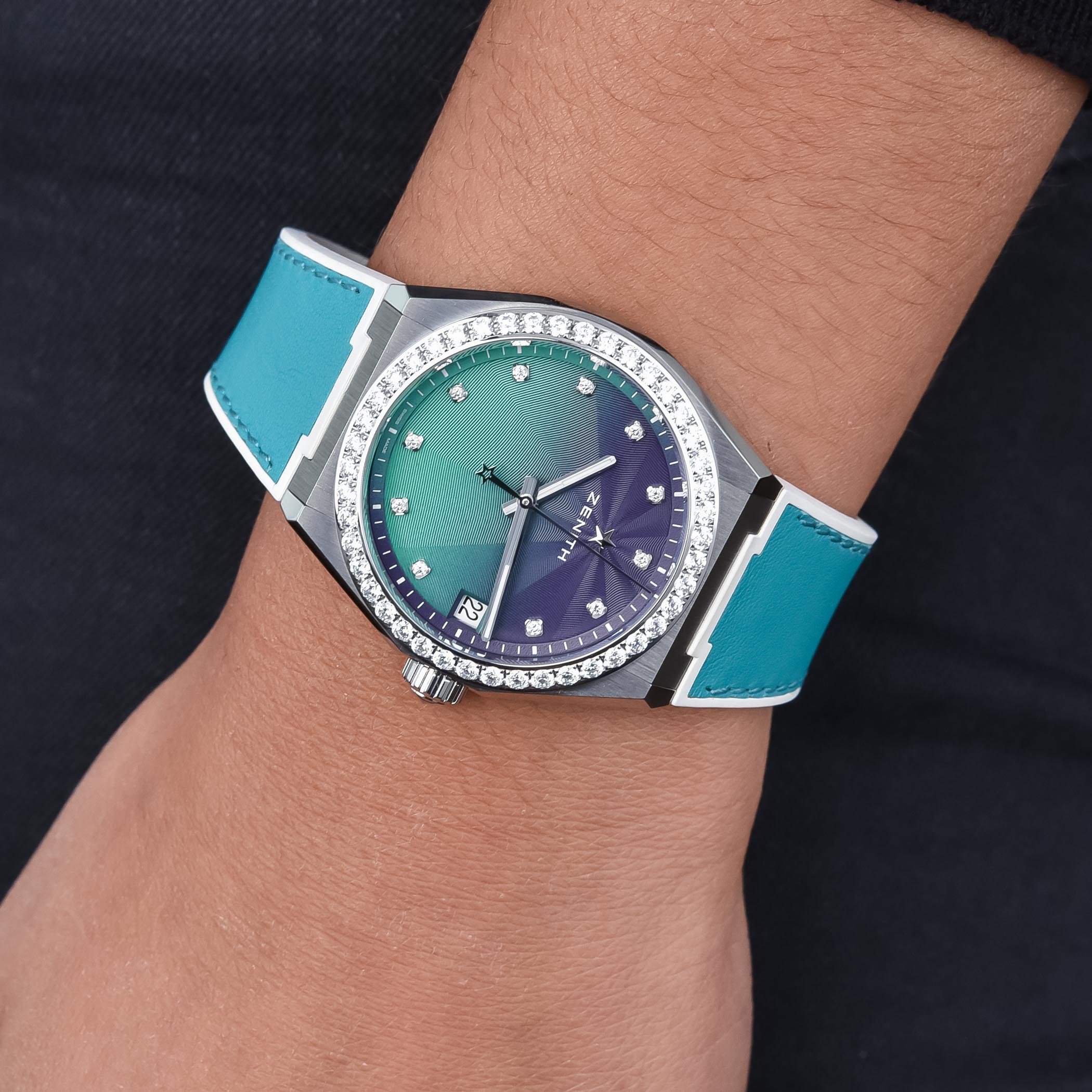 During the 2020 edition of the LVMH Watch Week, Zenith presented the Defy Midnight, a trio of watches made especially for women with a 36mm steel case, a gradient dial, diamond hour markers and interchangeable straps. As a member of the more avant-garde Defy collection for men, the Defy Midnight borrows the sporty tonneau-shaped case and round bezel of the family but tones down the size and dresses it up with feminine touches. The latest Defy Midnight models unveiled during the 2022 edition of the LVHM Watch Week are the Midnight Sunset and Midnight Borealis, two women’s watches designed to capture the colours of the sunset and the phenomenon of an aurora borealis.