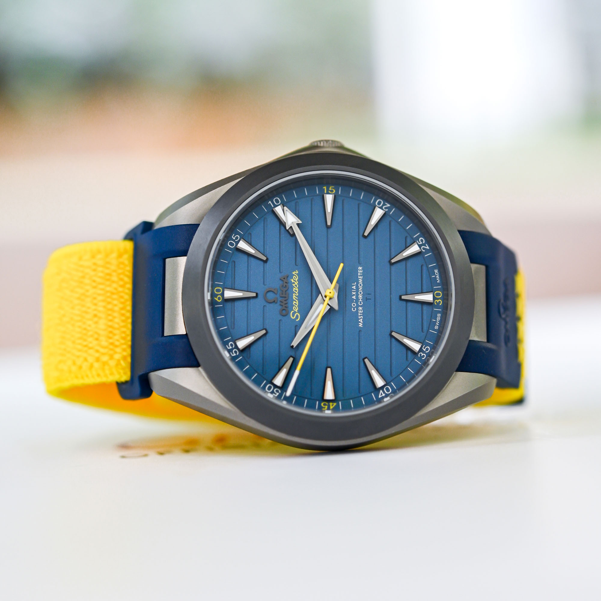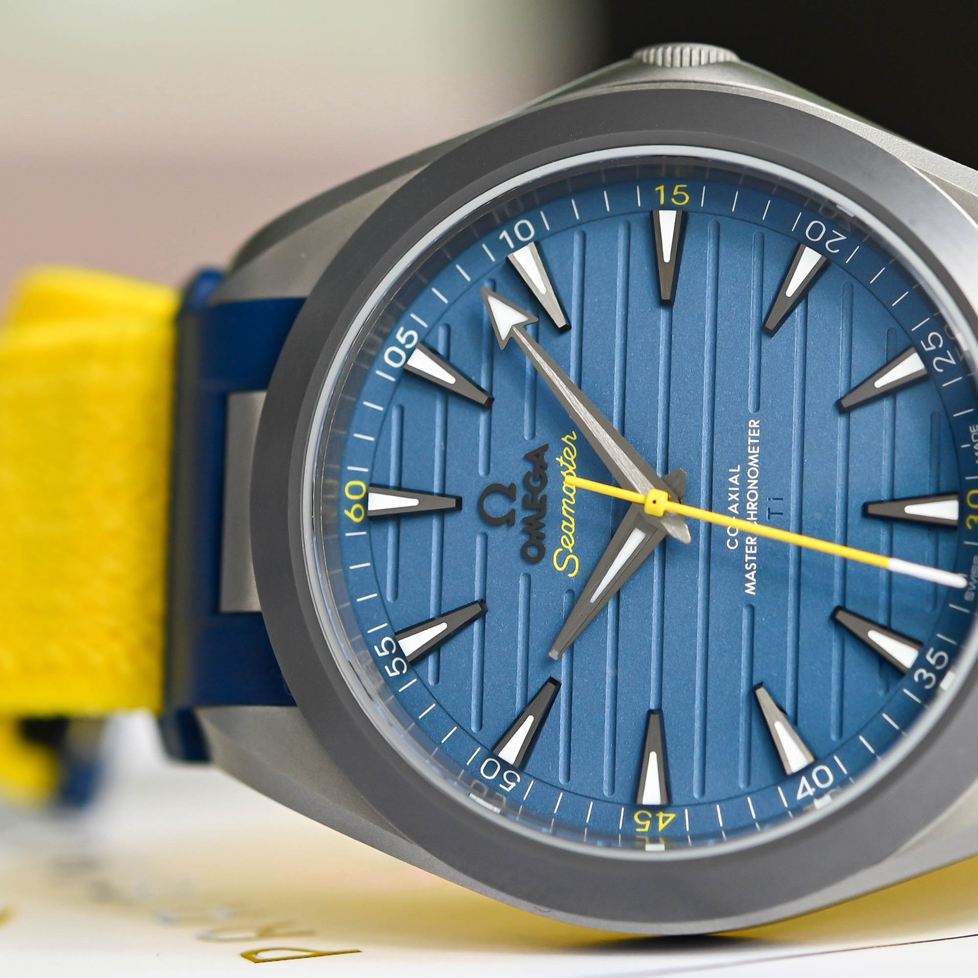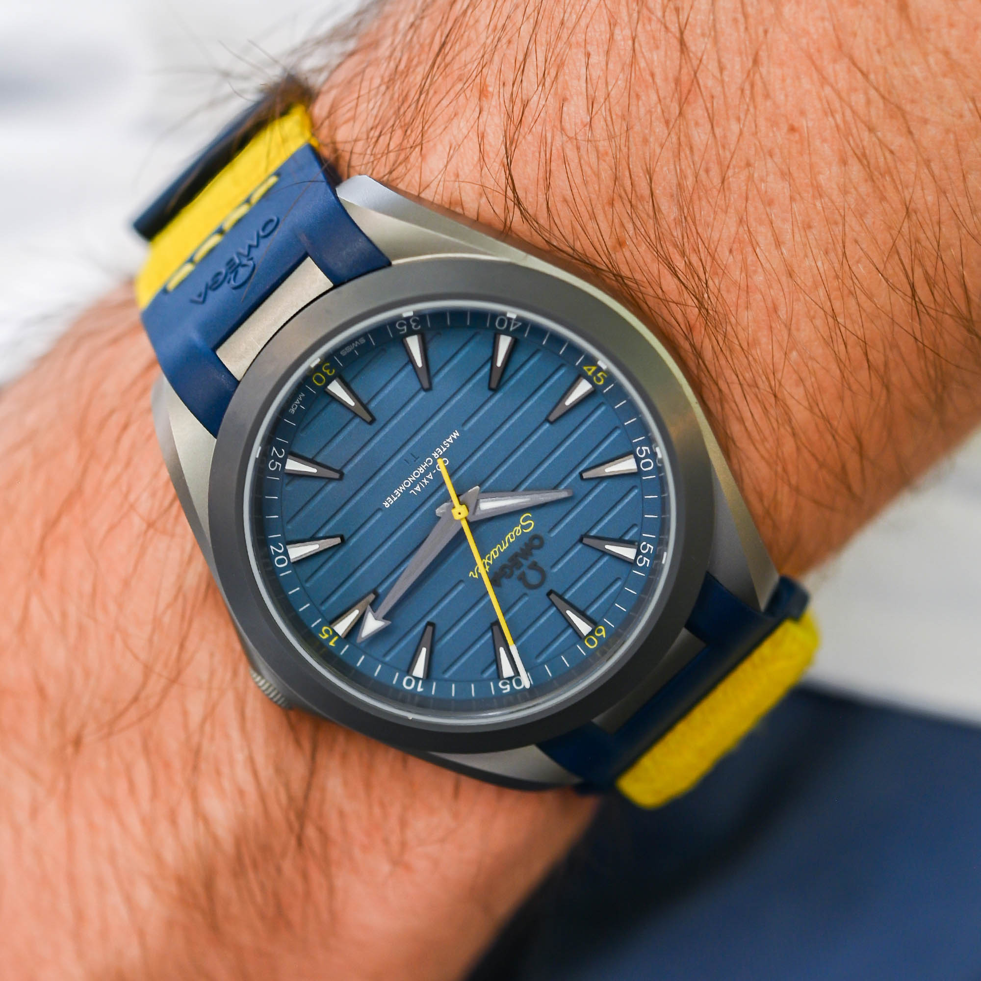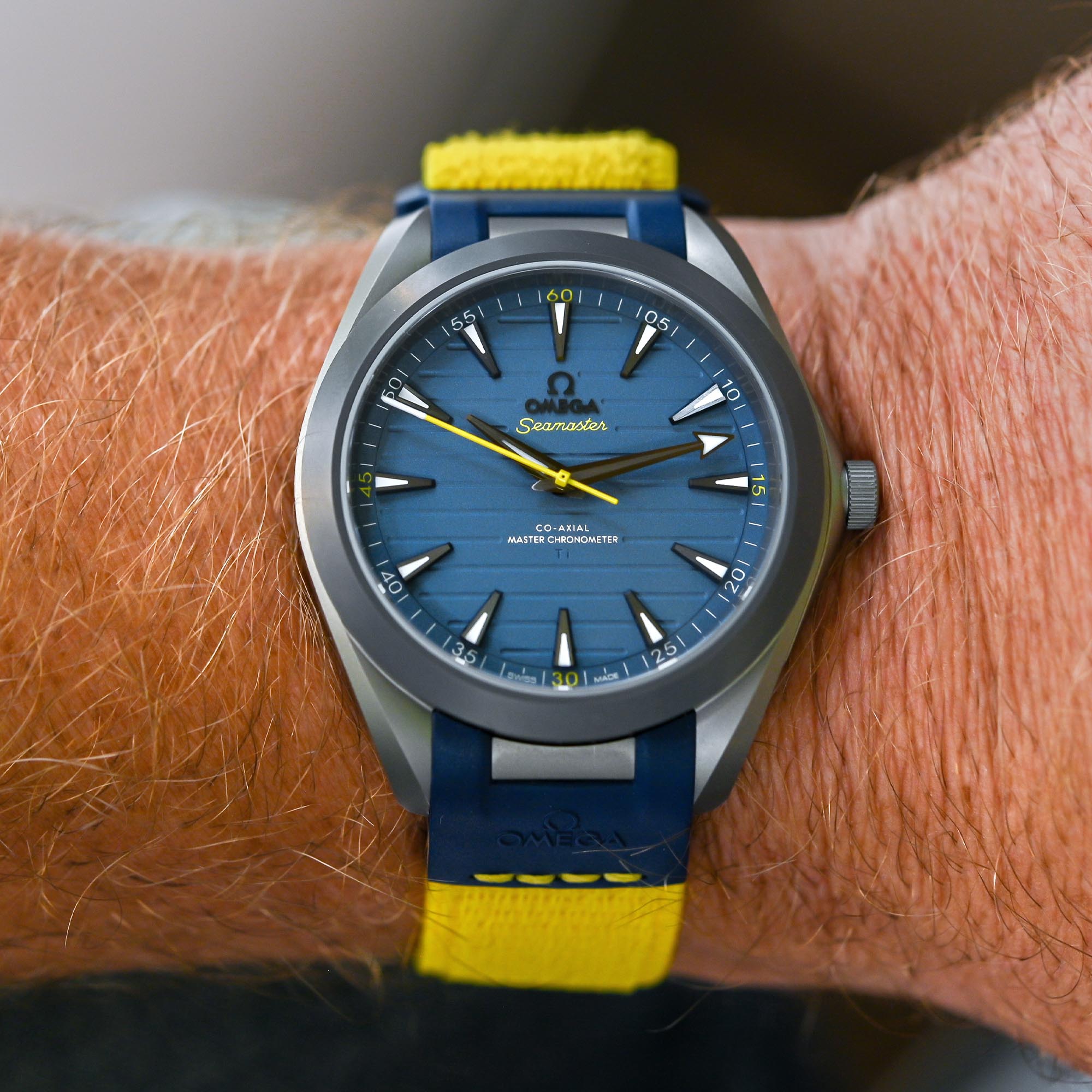 The design of the Omega Seamaster Aqua Terra 150M Titanium “Armand Duplantis” is dominated by Duplantis’ home country’s yellow and blue colours. The blue anodized titanium dial, featuring horizontal grooves, is accented with several yellow highlights. The most striking of these is the cylindrical central seconds hand, finished in bright yellow varnish with a white tip inspired by Duplantis’ pole vault. The Seamaster logo and the minute markers at 15, 30, 45, and 60 are also in yellow, consistent with the design of the stainless steel Aqua Terra 150M edition inspired by Duplantis.