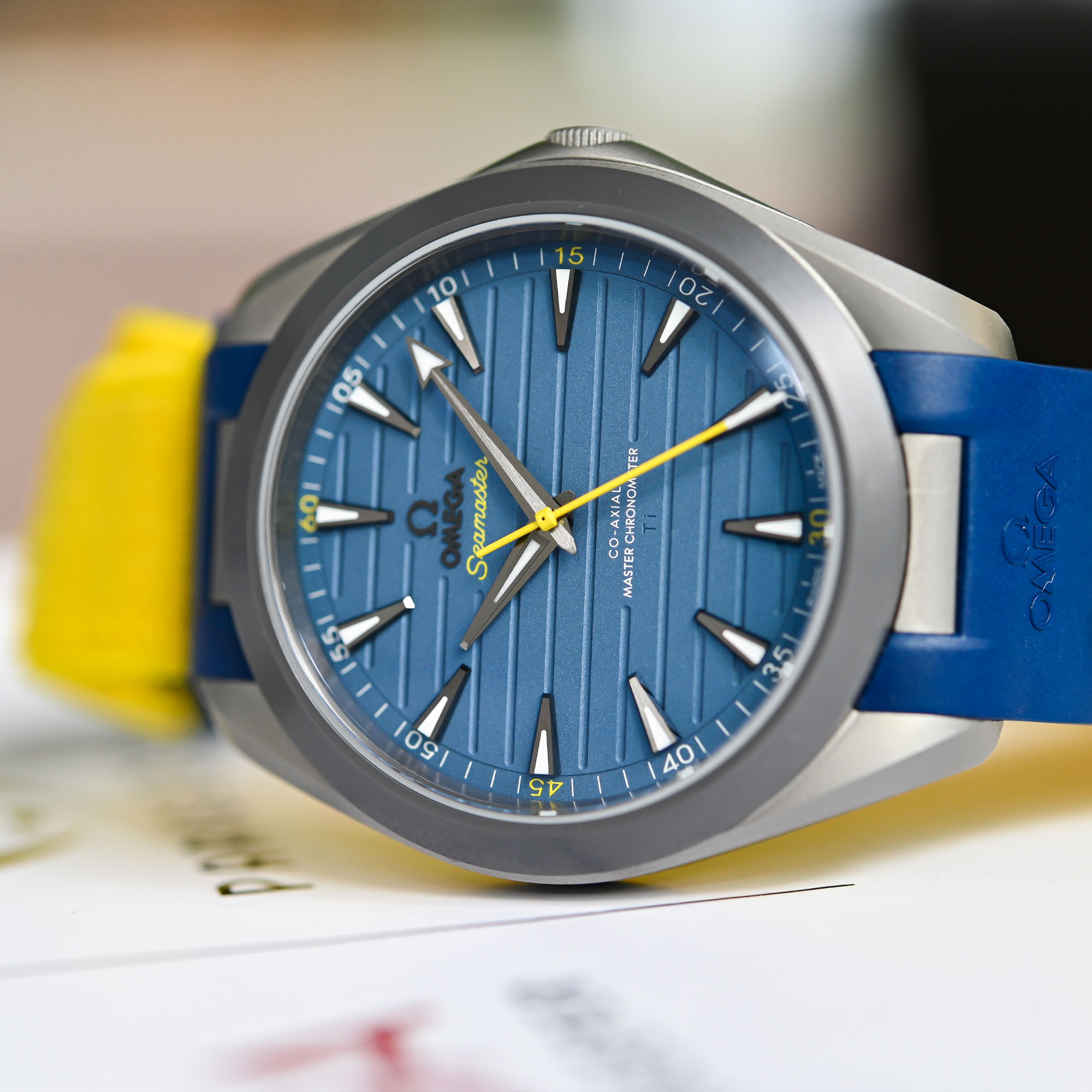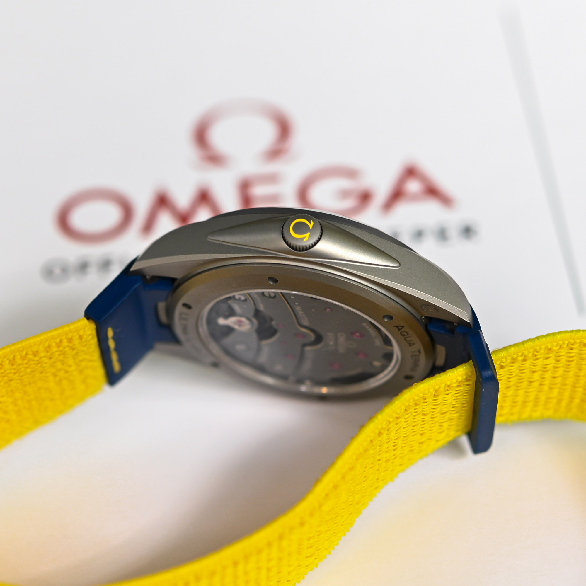 At less than 60 grams (approx. 57), the Omega Seamaster Aqua Terra 150M Titanium “Armand Duplantis” is impressively lightweight. The 41mm case is crafted from Gamma Titanium, an alloy harder and lighter than the Grade 5 Titanium commonly used in the industry. The case, caseback, and almost fully recessed crown adorned with a yellow logo all feature a matte sandblasted finish, which complements the titanium just as effectively as the satin and polished surfaces seen on the June-released stainless steel Aqua Terra 150M model associated with the champion. The watch offers exceptional wrist comfort with a thickness of 13.5mm and a lug-to-lug measurement of slightly over 49mm. This is due not only to its minimal weight but also to the special yellow and blue rubber strap, which integrates seamlessly into the original lug design and enhances the overall experience of the timepiece.