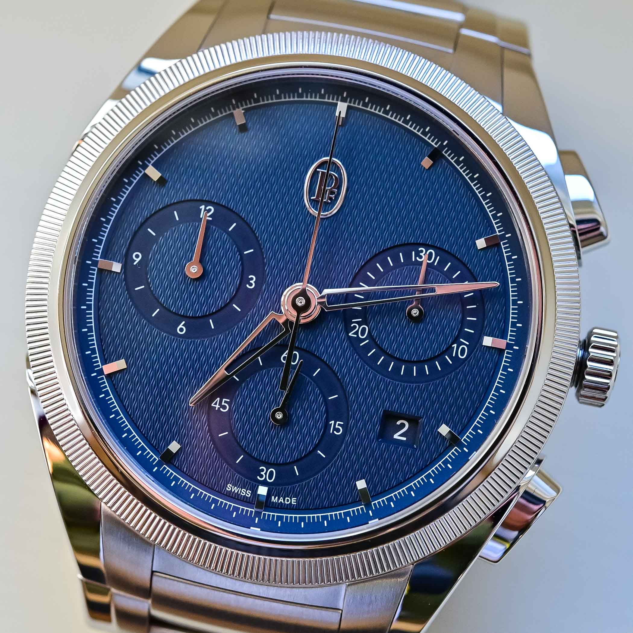 Also available in 22k rose gold, we spent some time with the steel model. The case, which measures 42mm across and has a height of 12.4mm, is executed in stainless steel with a platinum bezel. The screw-down crown for water resistance is flanked by two PF teardrop-shaped chronograph pushers that echo the signature PF teardrop lugs. Since this watch is all about refined details, the case displays a mix of polished and satin-finished surfaces. The casebands and the internal links of the integrated bracelet are finely satin-finished, and looking closely, you can see the thin lines in the metal. The crown, pushers, and the surface of the bracelet’s external links are brightly polished. It might not be easy to appreciate, but the raised, stepped bezel, with its hand-knurled and hand-polished platinum periphery and polished interior, emits a whiter, more radiant shine than steel. Those of you familiar with the brand will recognise the hand-knurled bezel that is also featured on other Tonda and Toric models.