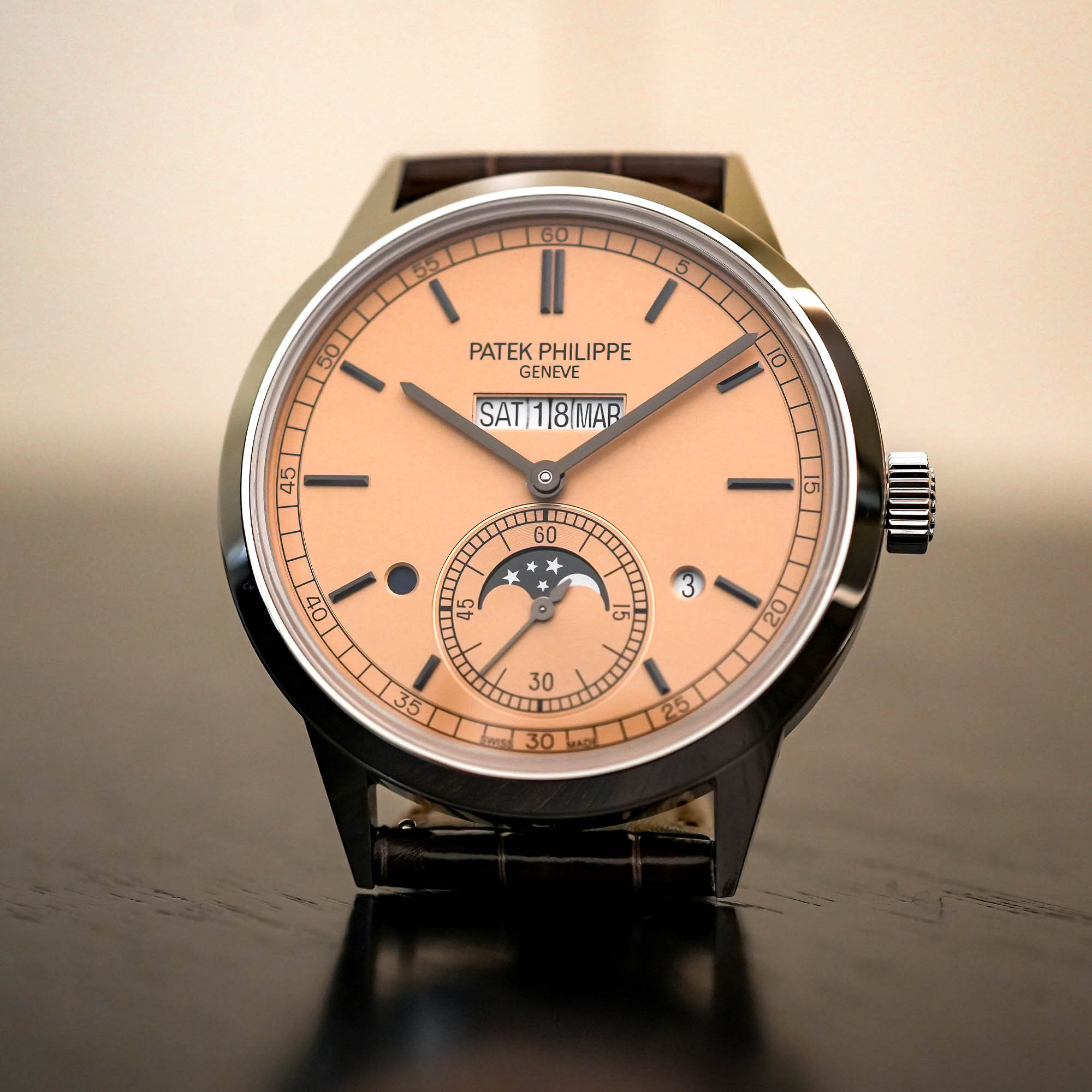 The Patek Philippe 5236P-010 In-line Perpetual Calendar with a salmon dial we handled was secured on the wrist with a shiny chocolate brown alligator leather strap, closed with a platinum fold-over clasp. The price is CHF 120,000, and 5236P-010 is part of the permanent collection.