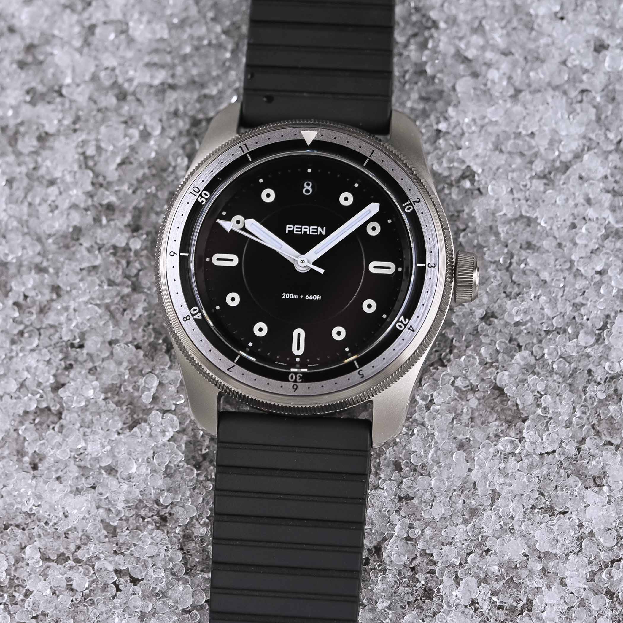 There are two different versions of this watch, the standard Peren Regia and Regia X, separated by their aluminum bezel inserts. The Regia has a two-tone (black and white) 60-minute scale that’s functional yet simple with no Arabic numerals. The Regia X, which is illustrating this article, has two scales with more detail – an outer silver 12-hour scale and inner black 60-minute scale. This allows for a 12-hour GMT function. Both bezels have 12 o’clock markers with Super-LumiNova. A flat AR sapphire crystal protects the dial and each edition is limited to 300 pieces, again numbered on the case back. The watch comes standard with a comfortable 20mm black FKM vulcanized rubber strap, but a black fabric strap or a stainless steel bracelet are available at the time of order.