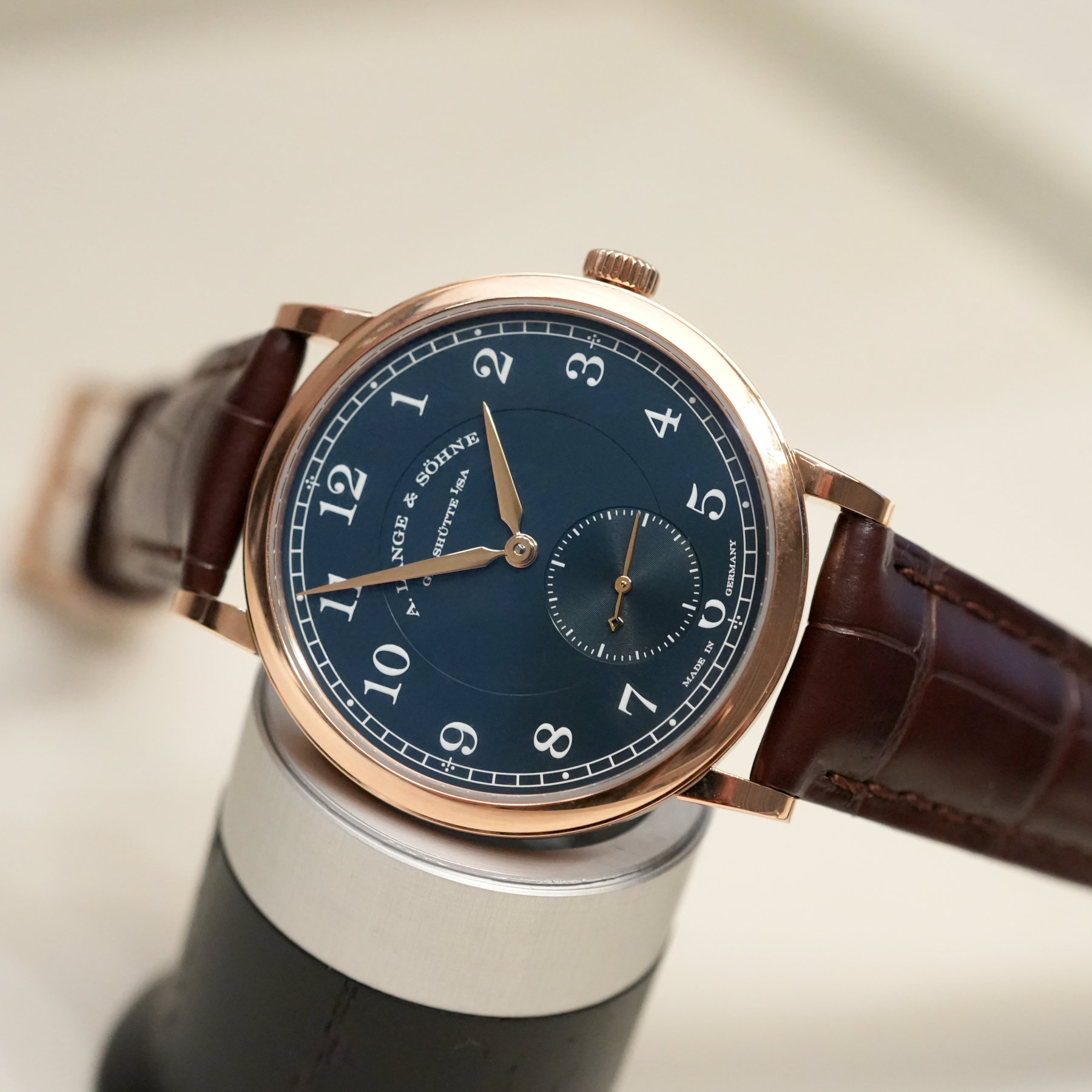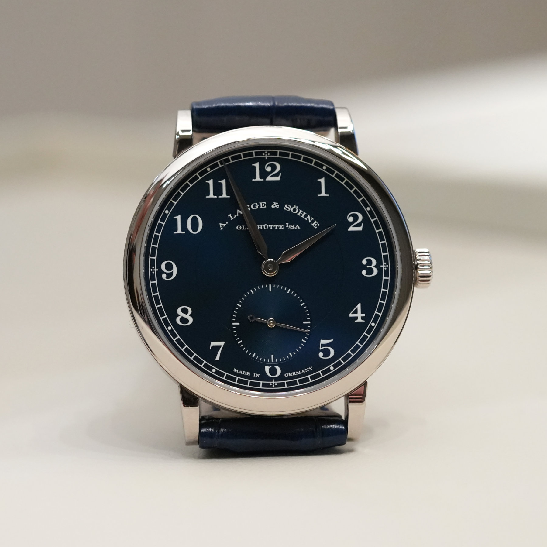 The dial is made of solid 925 silver and features a blue finish, a colour usually reserved for limited editions. Subtly layered, the centre is recessed, and the small seconds counter is decorated with snailing. Like historical Lange pocket watches, the numerals are Arabic, the subsidiary seconds counter is placed at 6 o’clock, and the minutes are indicated in a railway-track scale. Charming details of the 1815 include the white dots placed inside the peripheral minutes track with three dots and a line marking 12, 3, 6 and 9 o’clock. There is always a risk in smaller watches for the minute hand to be shortened, making it harder to tell the two apart. The elegant lance-shaped hands, which are a hallmark feature of the 1815 family, are clearly differentiated, and the elongated minutes hand reaches all the way to the edge of the dial.