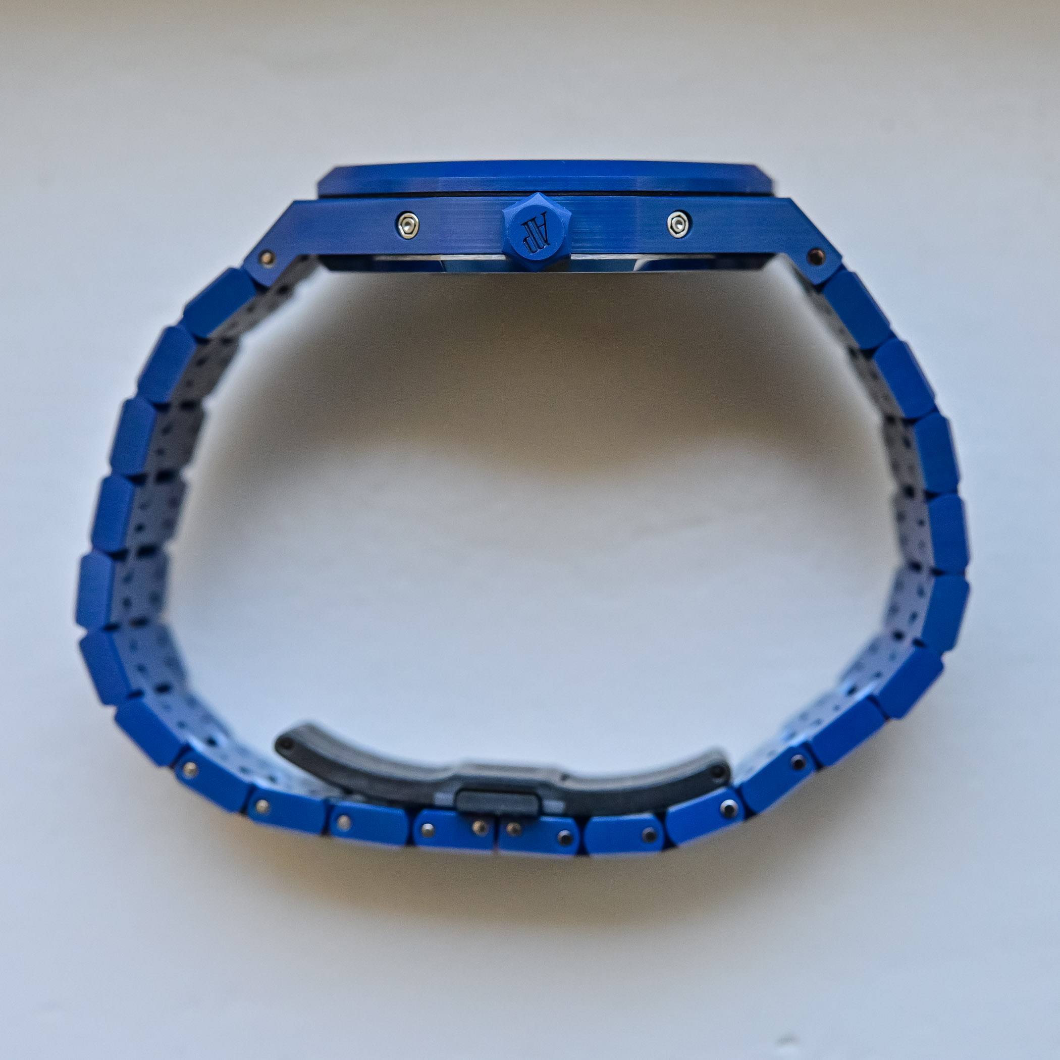 Before I move to my personal feelings, let’s dive into the technical details. This new full-blue ceramic is basically the same watch we’ve come to know in white or black ceramic. Its 41mm case – with the signature design of the Royal Oak collection, as well as its unmistakable bracelet – is now entirely crafted from blue-coloured ceramic. Lightweight and highly resistant to scratches, it’s obtained from Zirconium Oxide (ZrO2) powder, modified to obtain a blue pigmentation once baked, and mixed with a dedicated binder content before being transformed into ceramic through a complex industrial flow requiring different stages of high-precision machining. The components achieve their final colour only once they have been sintered at more than 1,400°C. Reaching a homogeneous colour represents an additional challenge.