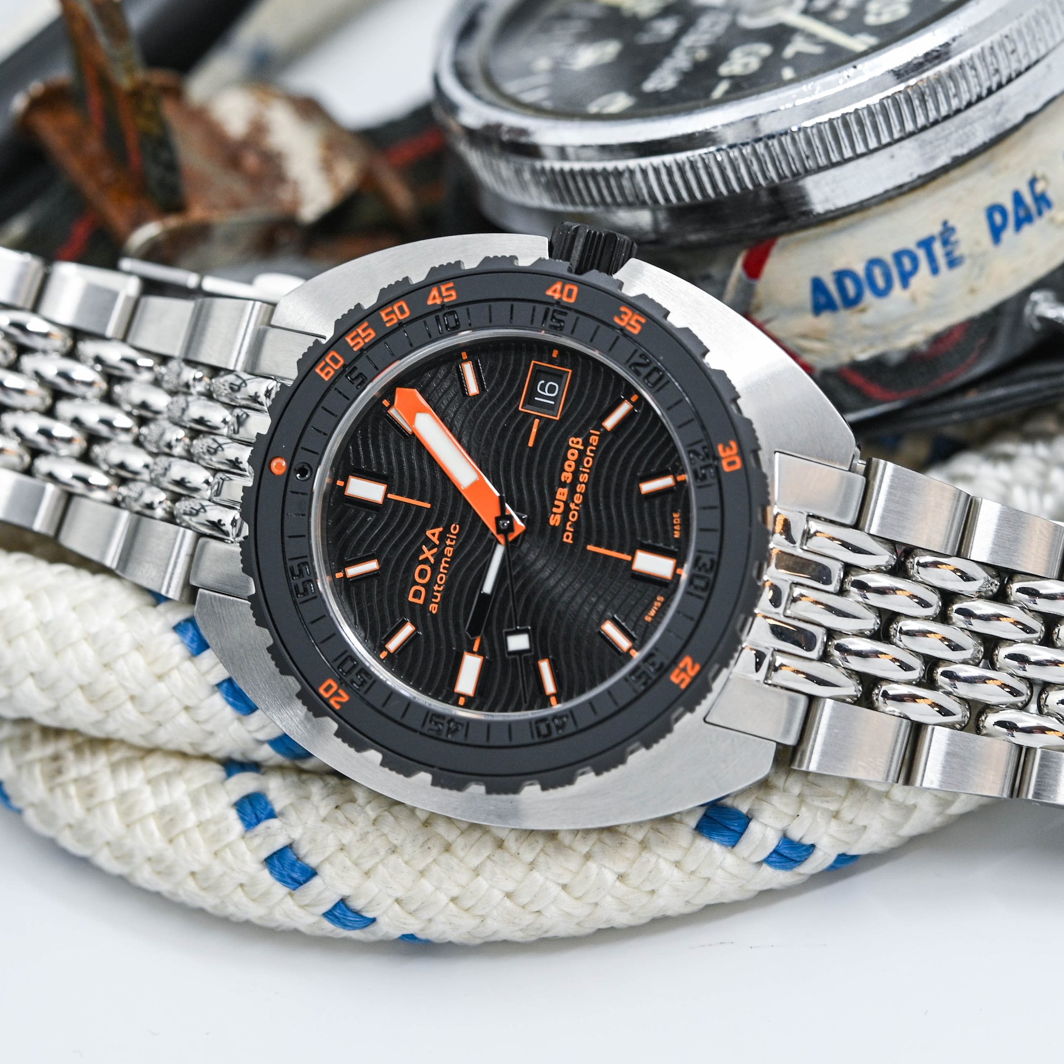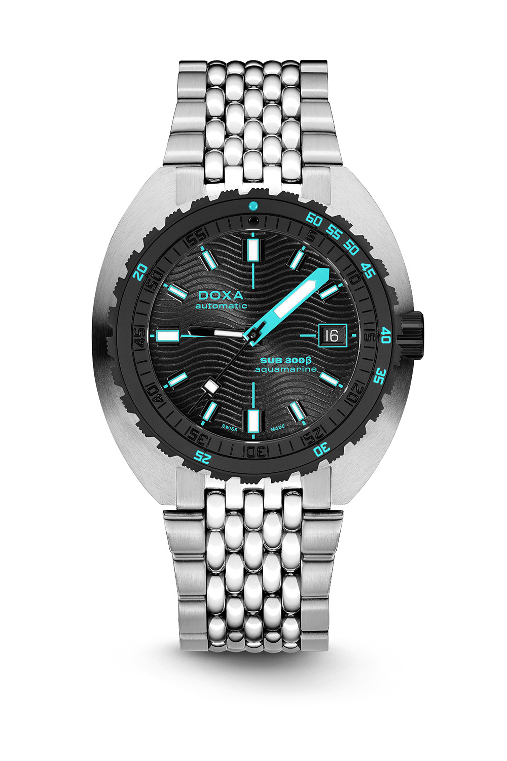 In the same direction, the dial feels typically Doxa, yet with some evolutions – sleeker, not as focused on the function, with more decoration… The base now has a sunray-brushed finish as well as a wave pattern, adding more depth and reflections depending on the ambient light. What hasn’t, however, are the block hour markers and the oversized, coloured minute hand, both allowing for a quick reading of the time underwater. The date has been retained too, which makes sense on a watch with a less instrumental vocation. Overall, the dial is still highly functional but also has more playfulness and refinement.