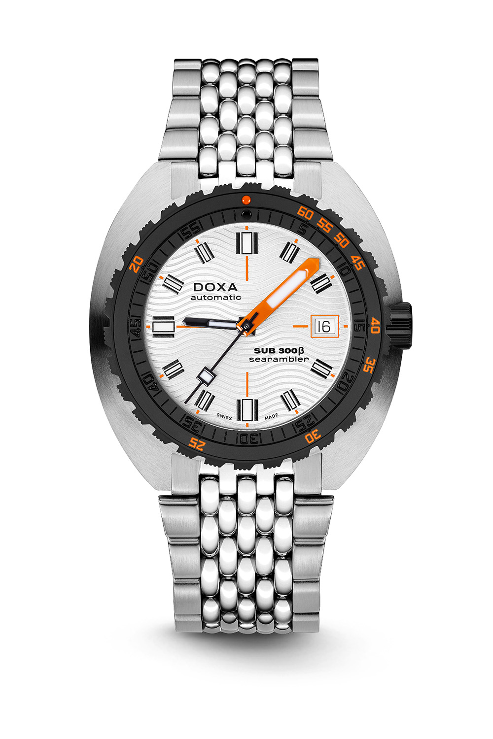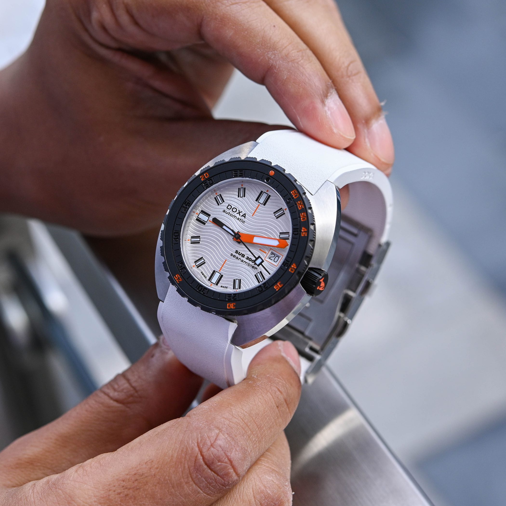 As for the specs, the SUB 300? retains all the necessary features, such as a flat, anti-reflective sapphire crystal, a screwed back, a screw-down crown and a helium escape valve at 9 o’clock. And, as you’ve guessed from its name, it is 300m water-resistant. Despite the evolution, it remains a pretty robust dive watch. What has changed? Obviously, the bezel, which is now made of ceramic, with the crown made of the same material. No worries, it retains the classic Doxa double-scale, the saw-tooth profile and it is unidirectional. The result is, however, a great visual difference from a traditional SUB 300, with strong contrast – this is even truer on the Searambler model, the only one with a light-toned dial. Depending on the edition, the outer depth scale features orange, yellow or turquoise accents.