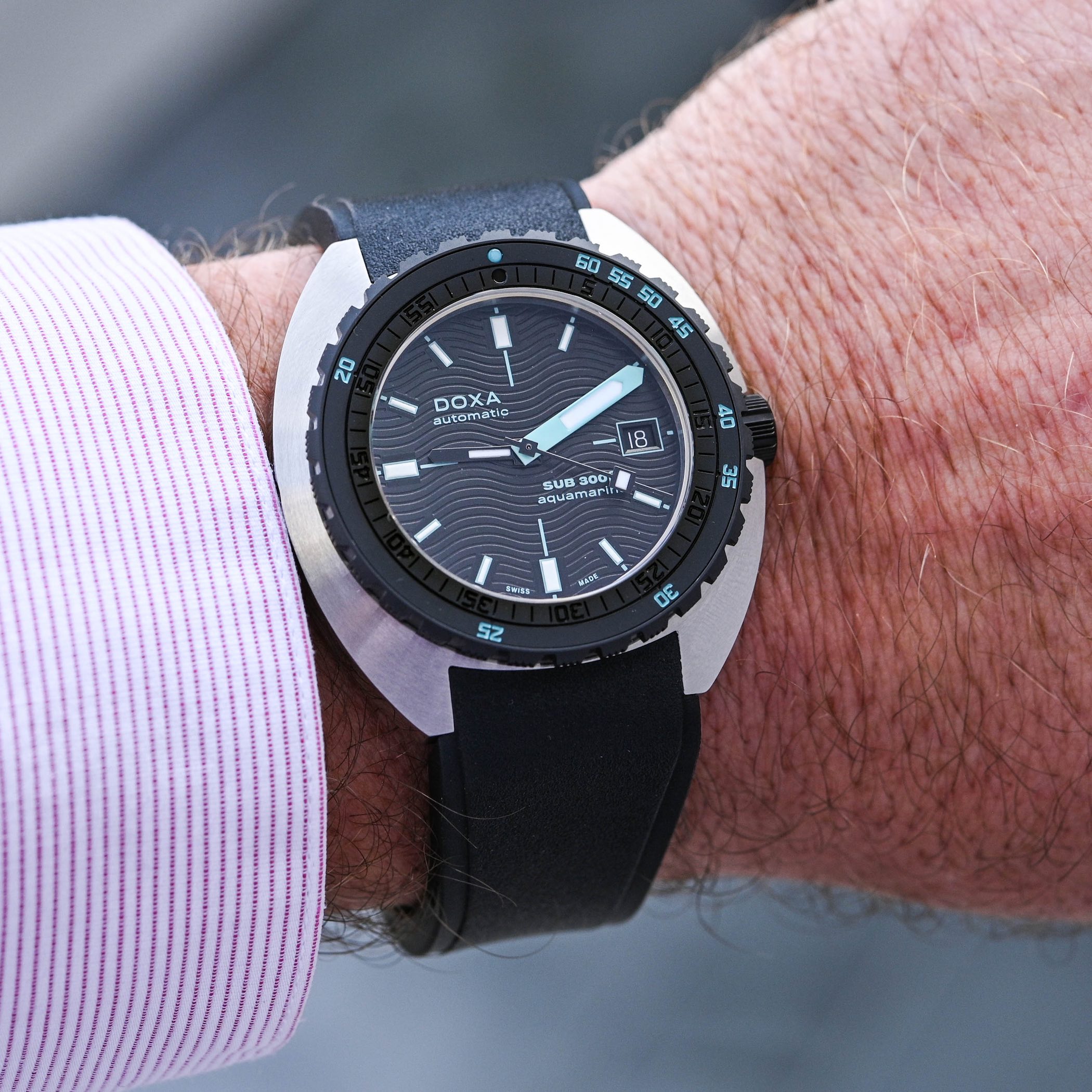 But what matters most is yet another watch, the surprising gold-and-ceramic Doxa SUB 300? Sharkhunter. The first watch to bear the ? mention in its name, it opened the door to new territories, to new materials, to a more urban approach and to dive watches that are not solely designed to dive. It has become a sports watch that should work in every life scenario, and not only underwater – at least, this is what the brand claims. The SUB 300? Sharkhunter was a polarizing model, something radically different from what we’ve come to expect from Doxa. But the new steel-and-ceramic SUB 300? Collection, while taking some liberties compared to the original concept of the 300, feels more like an evolution than a deep revolution. For the best, should we agree?