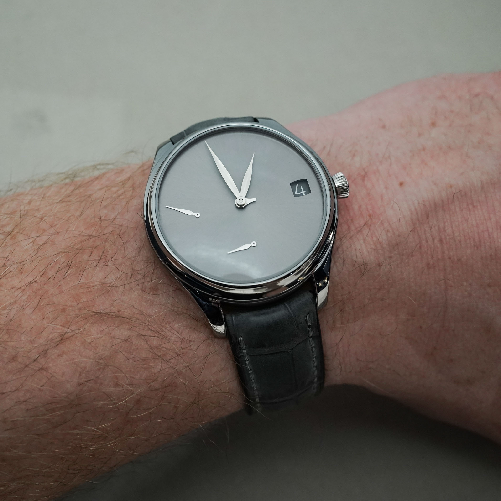 The shape and proportion of the Endeavour case are carefully thought out by Moser as well. It’s not just a simple round case, but one full of details, lines and contrasts. The concave bezel lures you in to follow the caseband and discover the scalloped areas and alternating types of finishing. The shape of the lugs with a touch of negative space underneath is another highlight. The crown sits perfectly in the middle, so it doesn’t cut into your wrist, and the brushed section around is just a lovely touch.