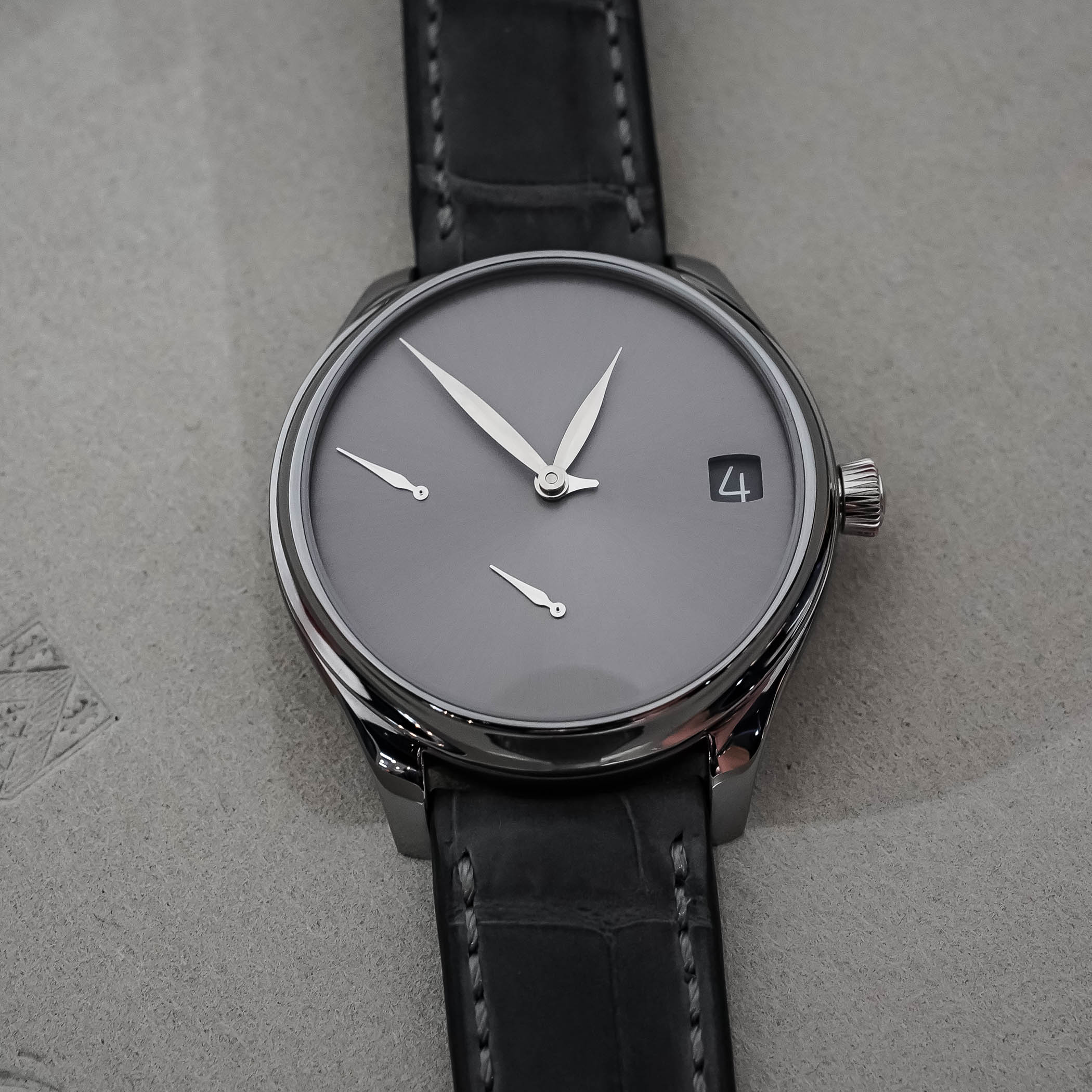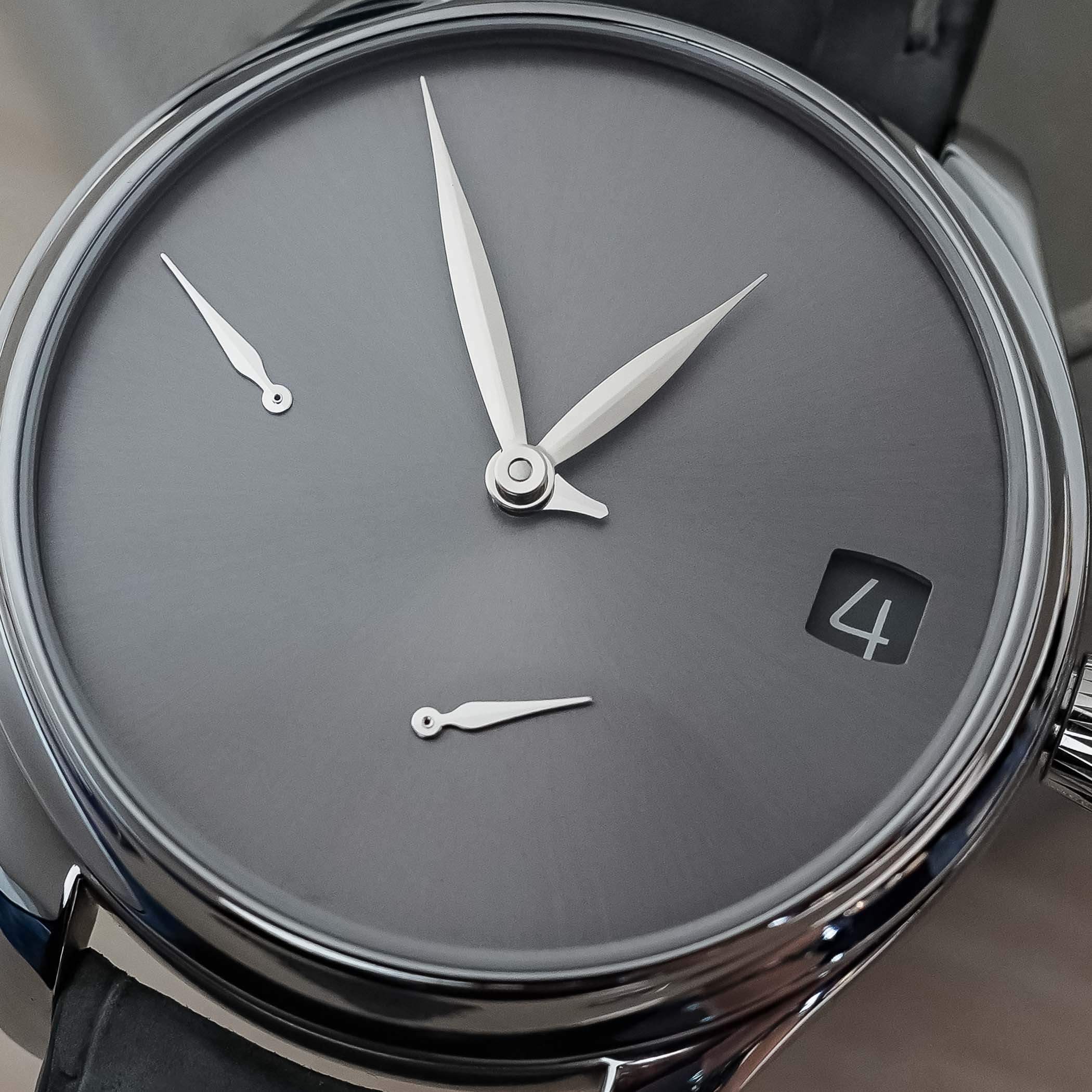 If you then combine this with the minimalist display of Moser’s perpetual calendar models, and add in a monochromatic (there’s a reason for our name) sunray-brushed tantalum dial, things are very much falling into place for me. Moser’s Concept dials, regardless of what collection they’re in, also bring things down to the essentials even more, as they are void of hour markers, logos, scales or any other “intrusive” details. Yet from afar, you instantly know what it is and who makes it.