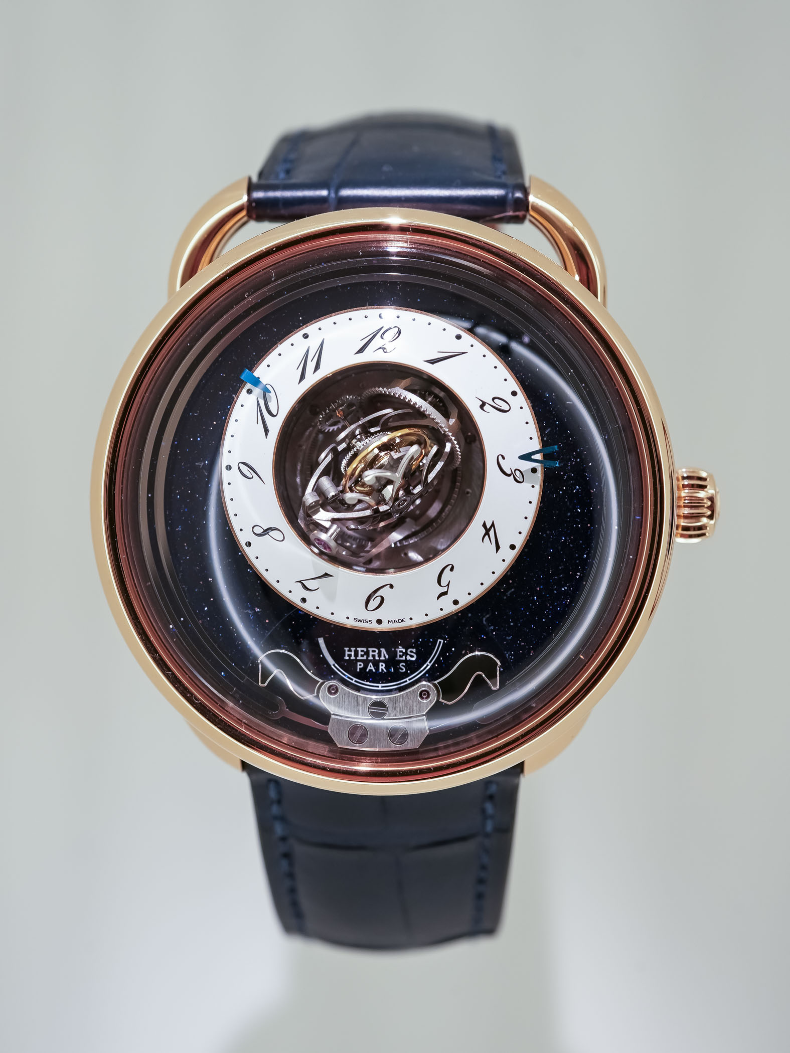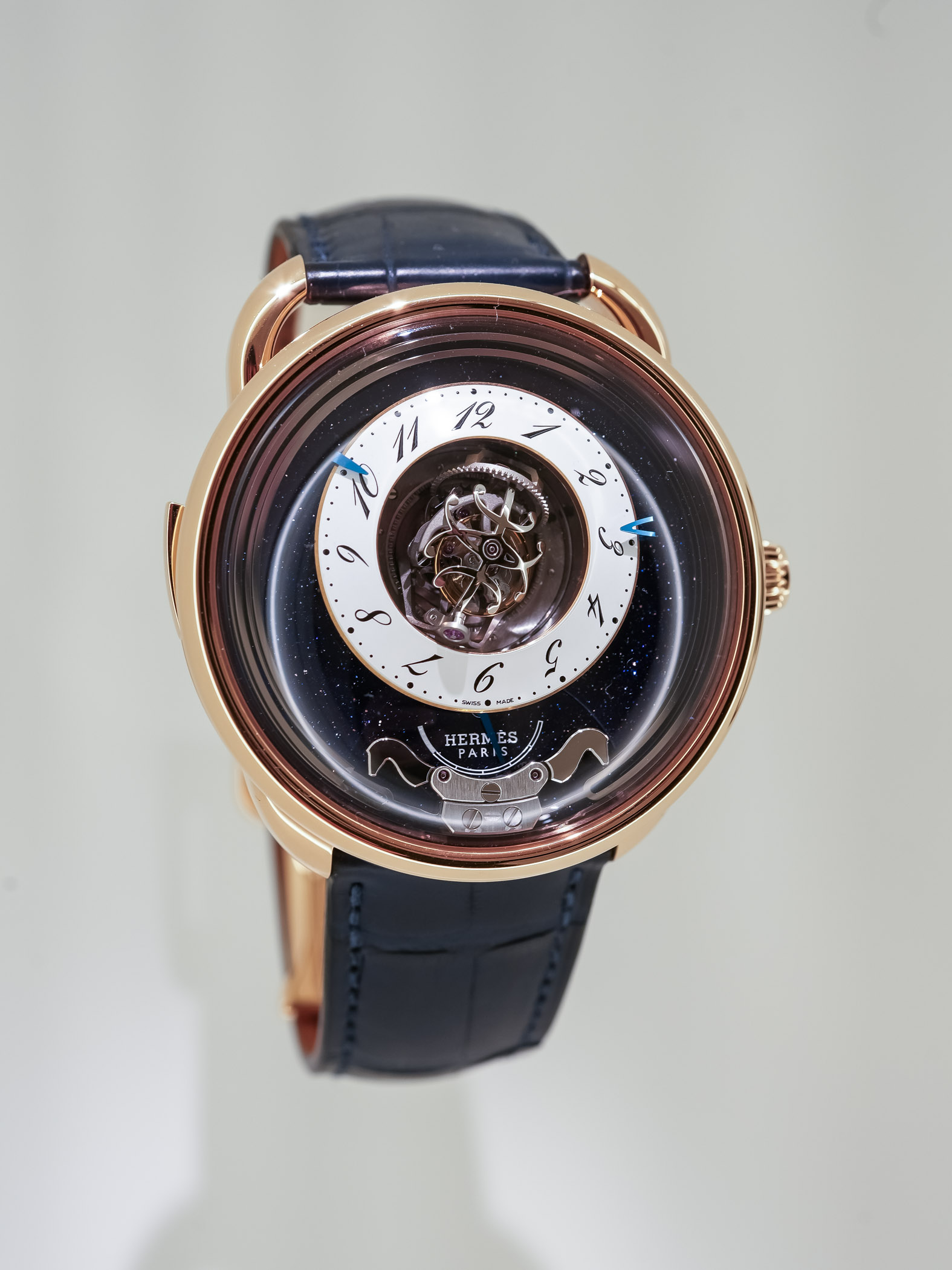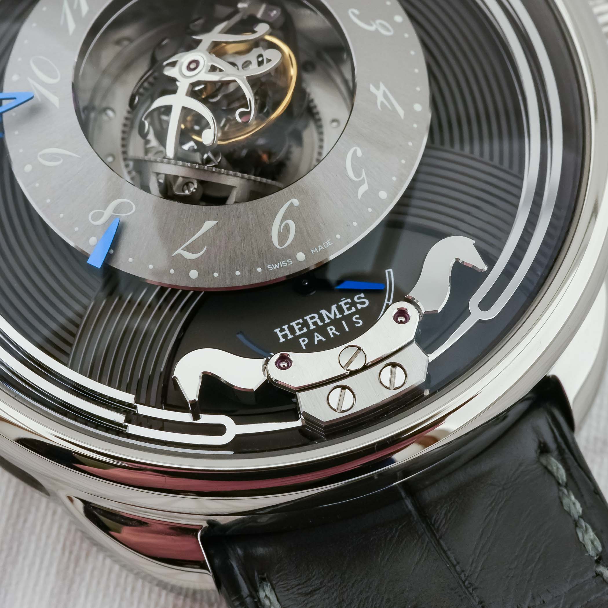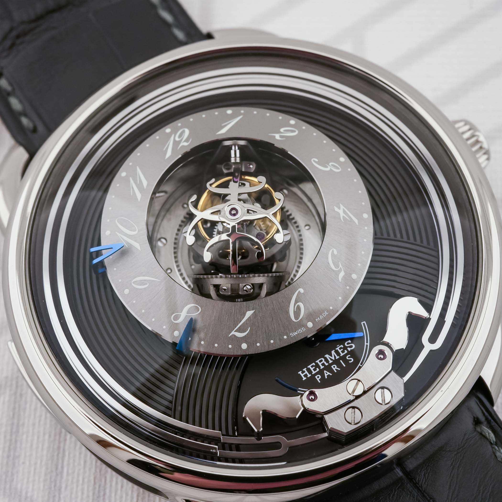 This Duc Attelé, with its central high-frequency triple-axis tourbillon and a minute repeater, is an unmistakably Hermès timepiece.