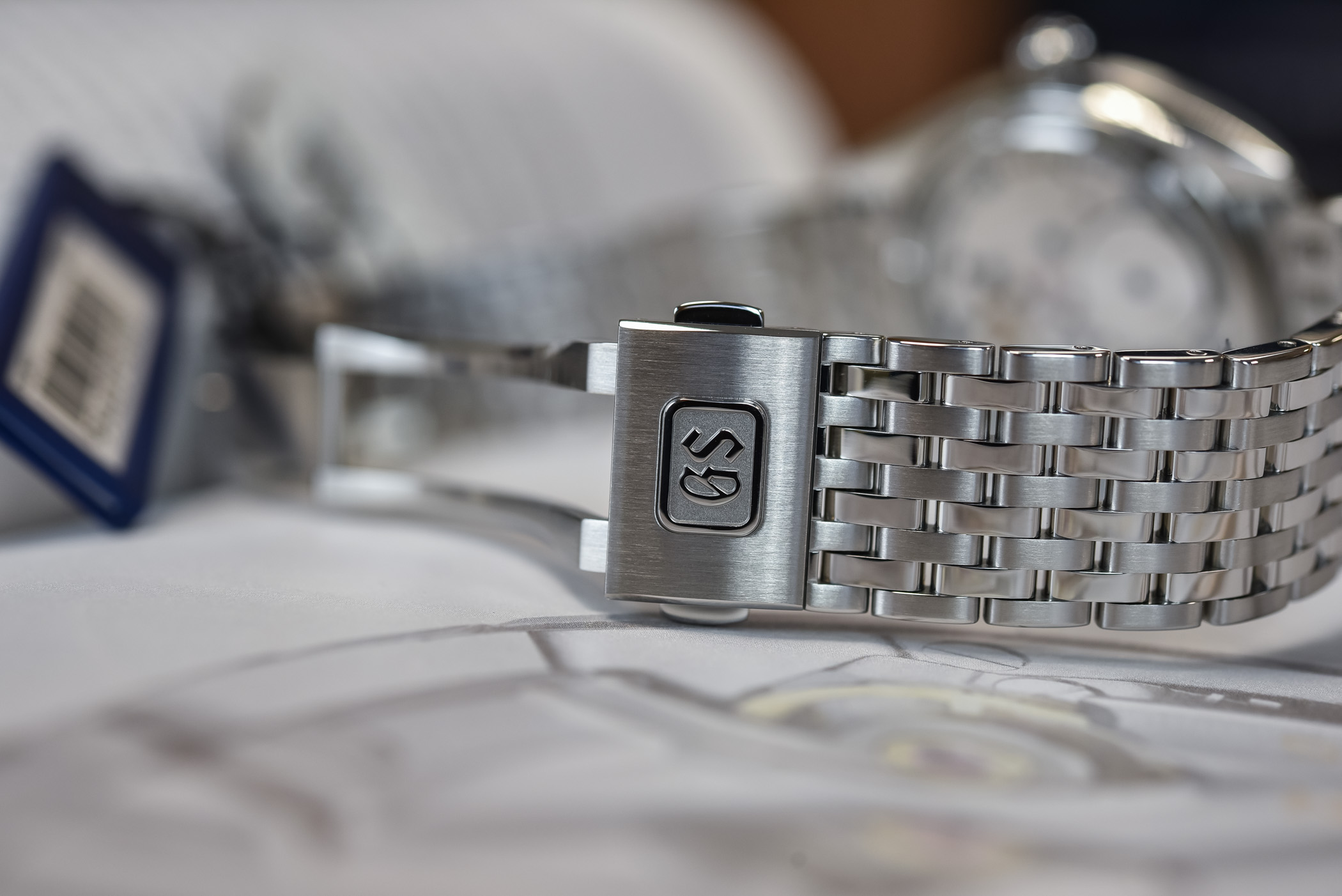 The Grand Seiko Omiwatari SBGY013, as previously mentioned, is distinguished not only by the new dial colour. It also comes on a stainless steel bracelet. The nine links are alternatingly polished and brushed for a touch of contrast. The folding clasp has release buttons and is engraved with a GS. The bracelet is said to be adaptable to SBGY007 and SBGY003 models if this is of any interest to you.