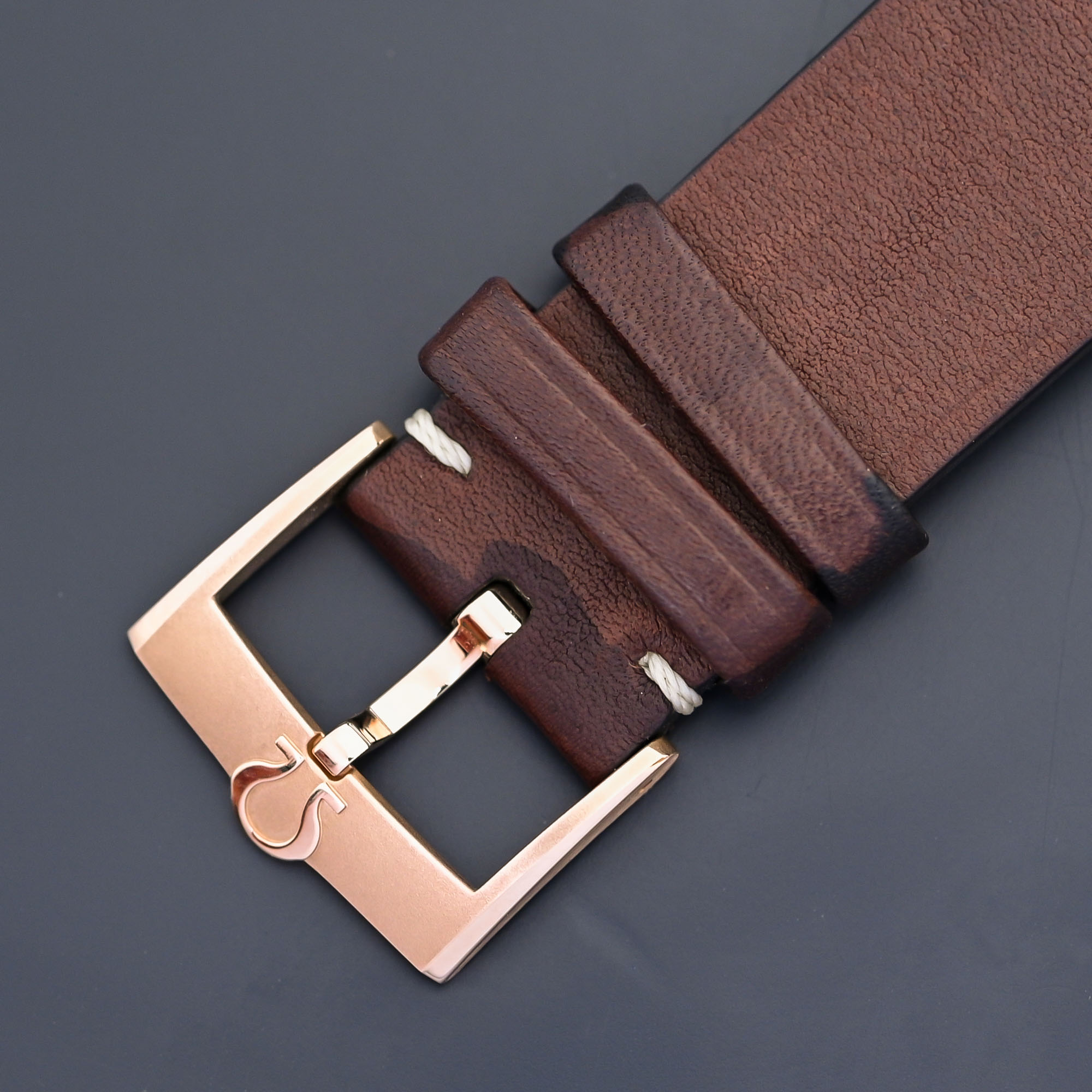 Framed by the circular brushed scales, the centre of the dial features another French speciality and is decorated with a Clous de Paris pattern, repeated inside the recessed small seconds counter at 6 o’clock. The Art Deco Arabic numerals at 12, 3 and 9 o’clock and the historical Omega logo are applied to the central area of the dial, consolidating the watch’s retro spirit. Crafted in 18k Sedna Gold with a Bronze Gold coating, the time is read with slender sword-shaped hands.