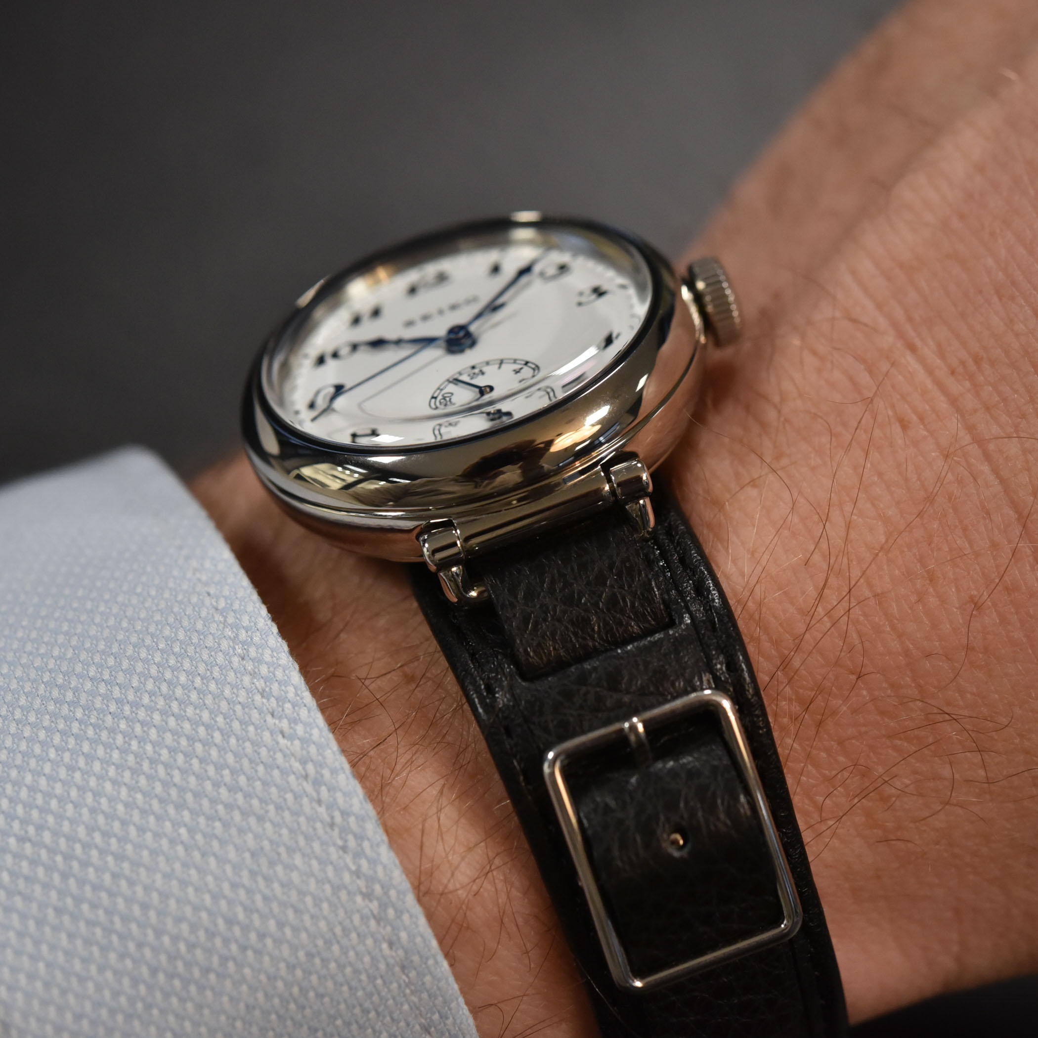 The dial, which is made of glossy white enamel, is also an evocation of the past. Not entirely faithful to the original model, this Seiko Presage Kintaro Hattori SPB441 features a modern display with central seconds and a 24-hour indicator replacing the small seconds of the original watch. Still, the blued hands, the Breguet-styled numerals and the font used in this additional counter are creating the illusion. And, of course, the Seiko letters at the 12 o’clock position are modelled after what was used in the 1924 watch.