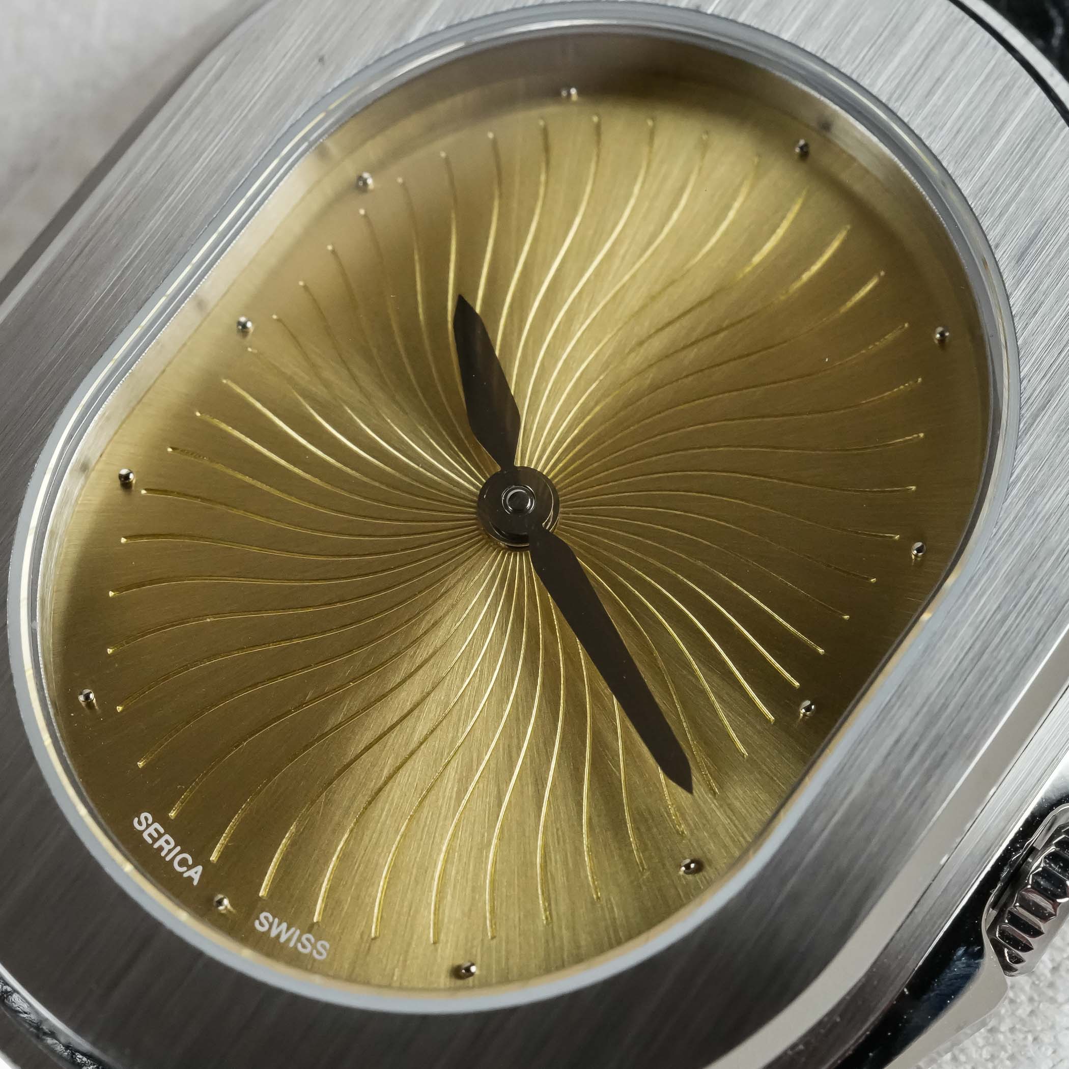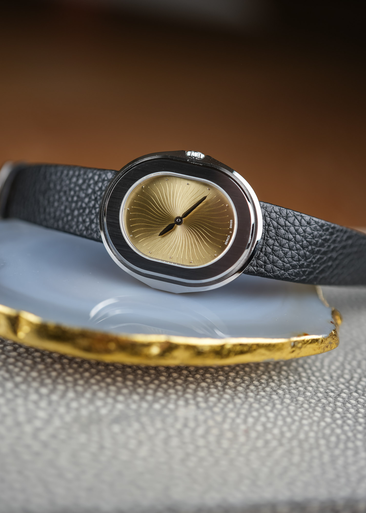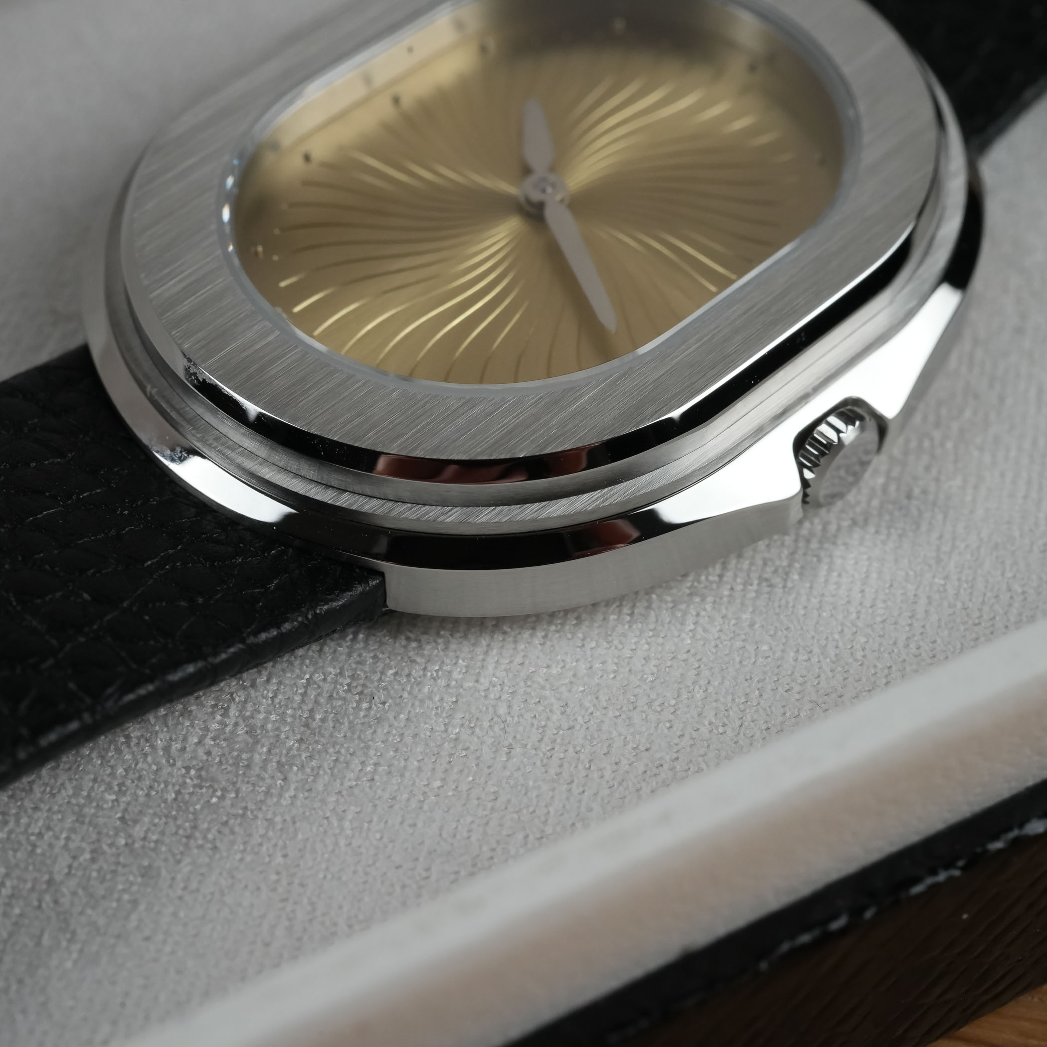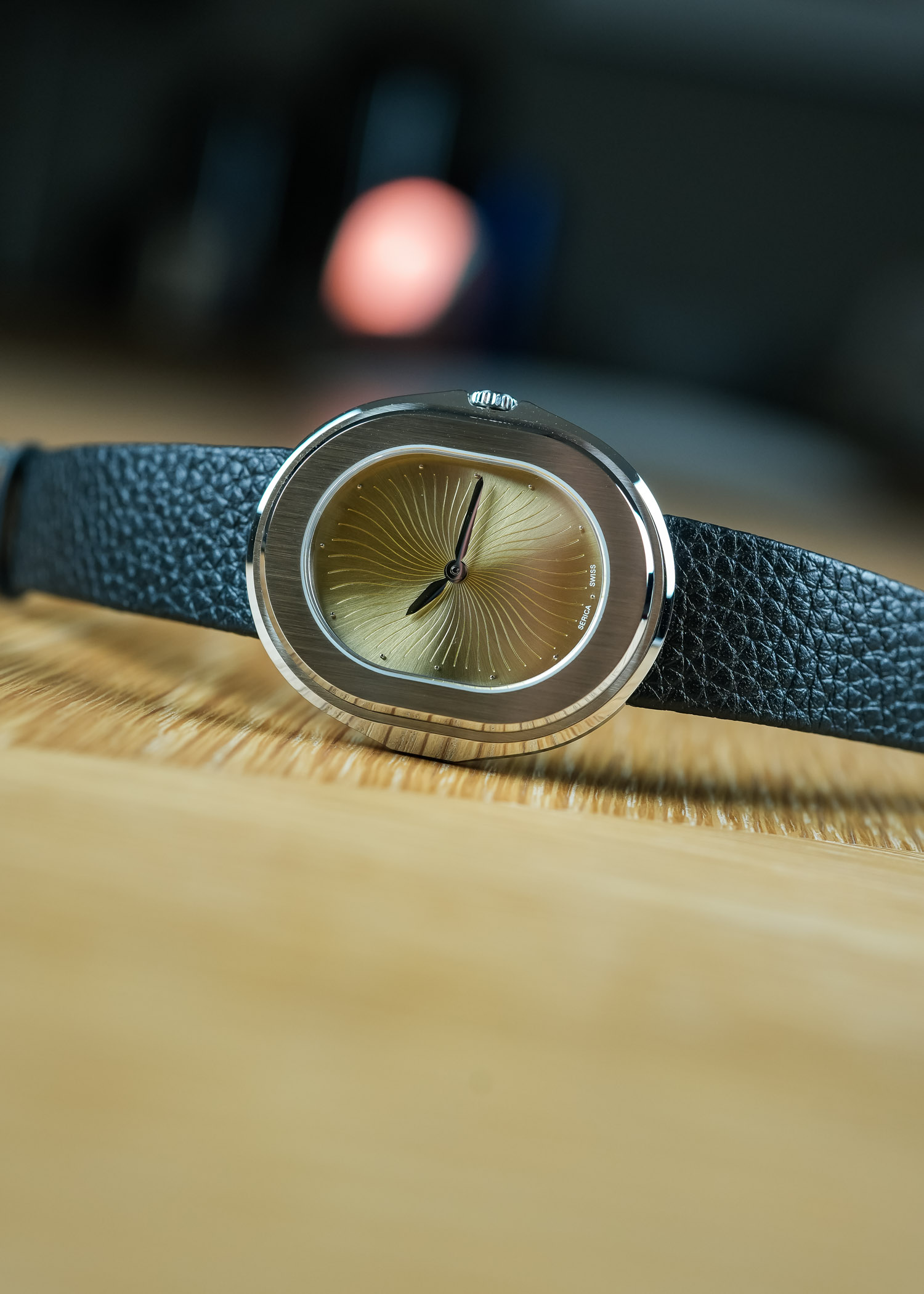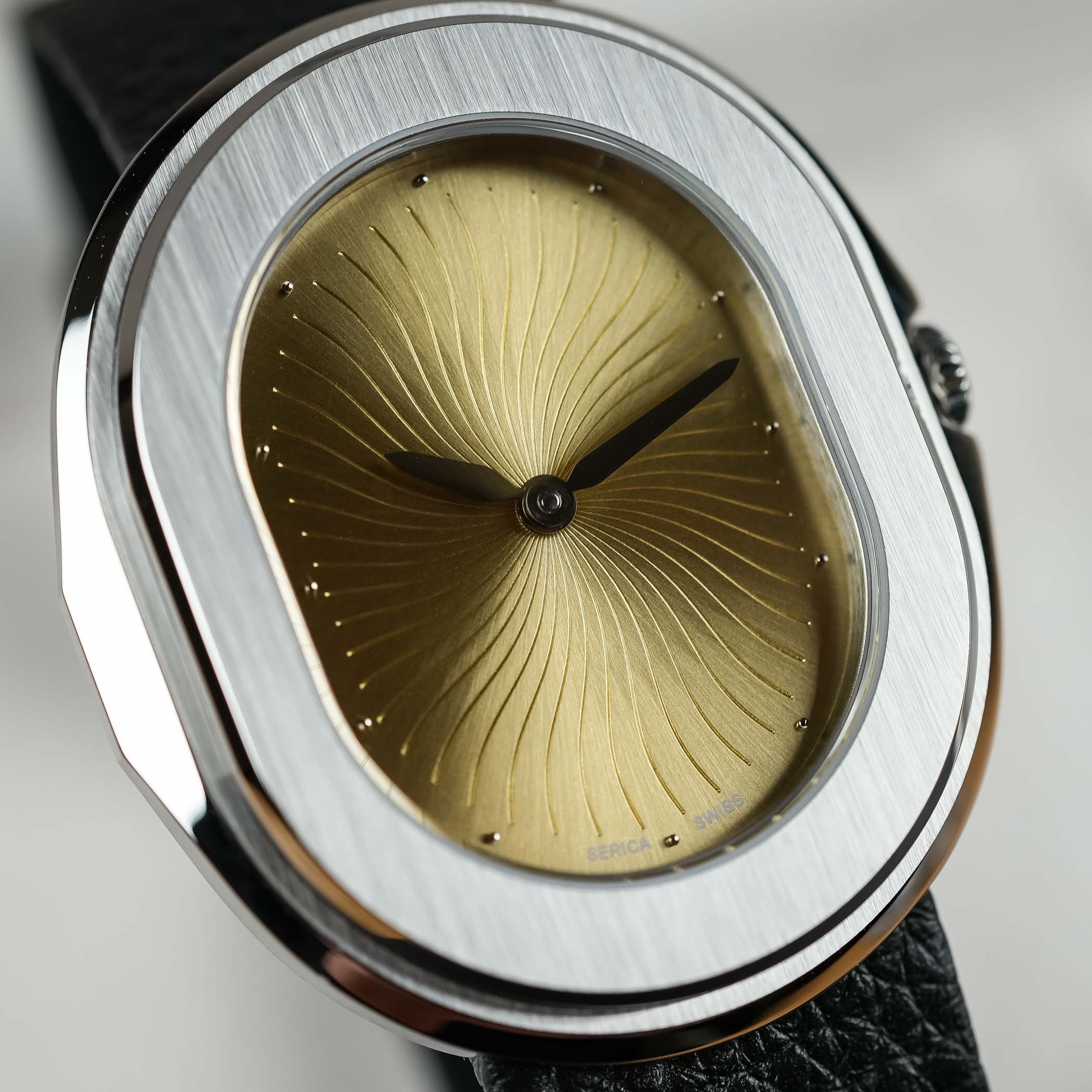 Speaking of which, the dial – available in this brass-gold tone but also a more classic black version – is sleek yet detailed. The Serica Parade keeps things relaxed and quiet, with a time-only display (hours and minutes) – and a deliberate choice of not displaying the seconds, as befits a dress watch. The base of the dial is engraved with S-shaped curved lines, again adding a discreet dynamism to the watch. The domed polished hands are paired with fine spherical hour markers. The combination of these lines with the sunray-brushed finish of the dial is also rather appealing, playing a lot with ambient light.