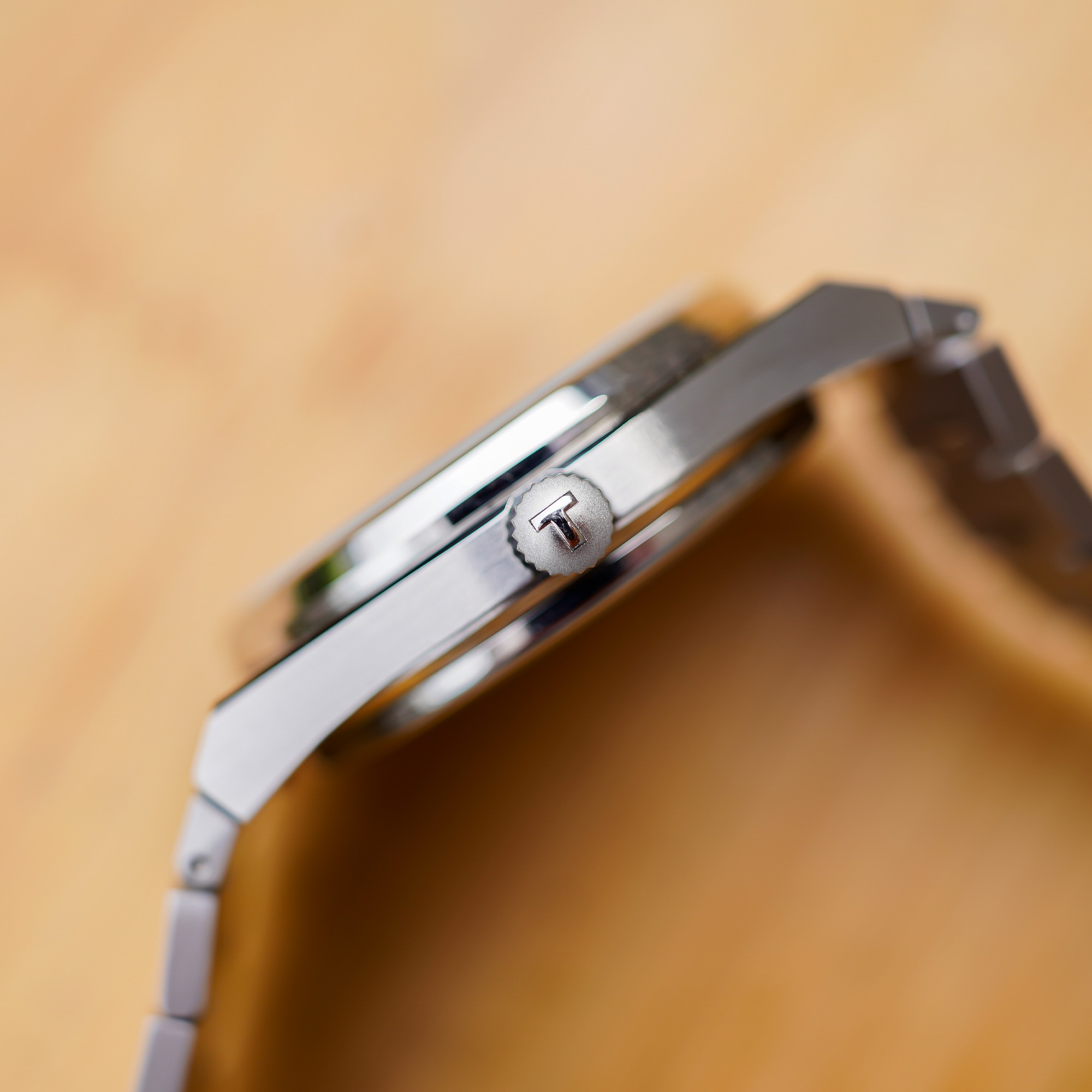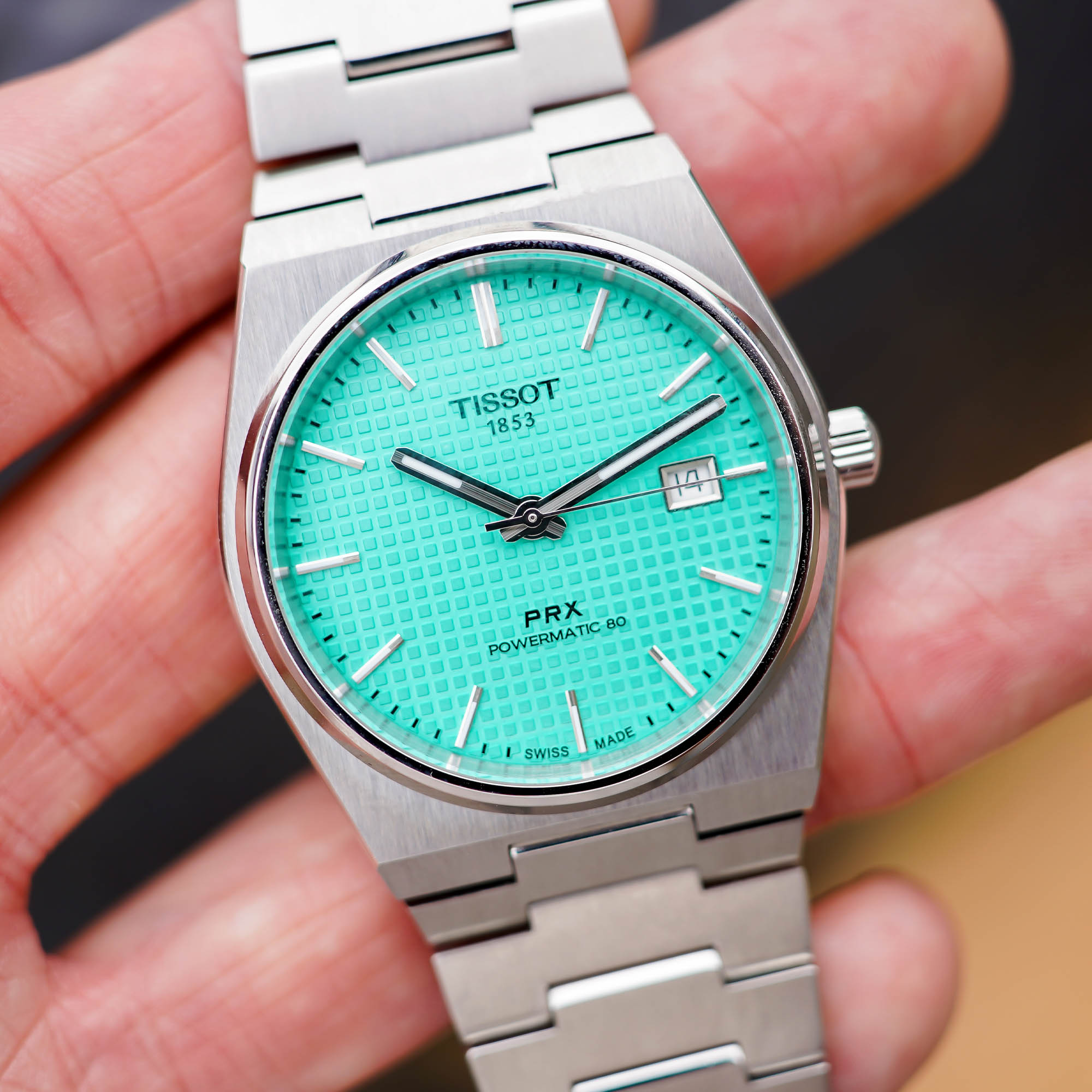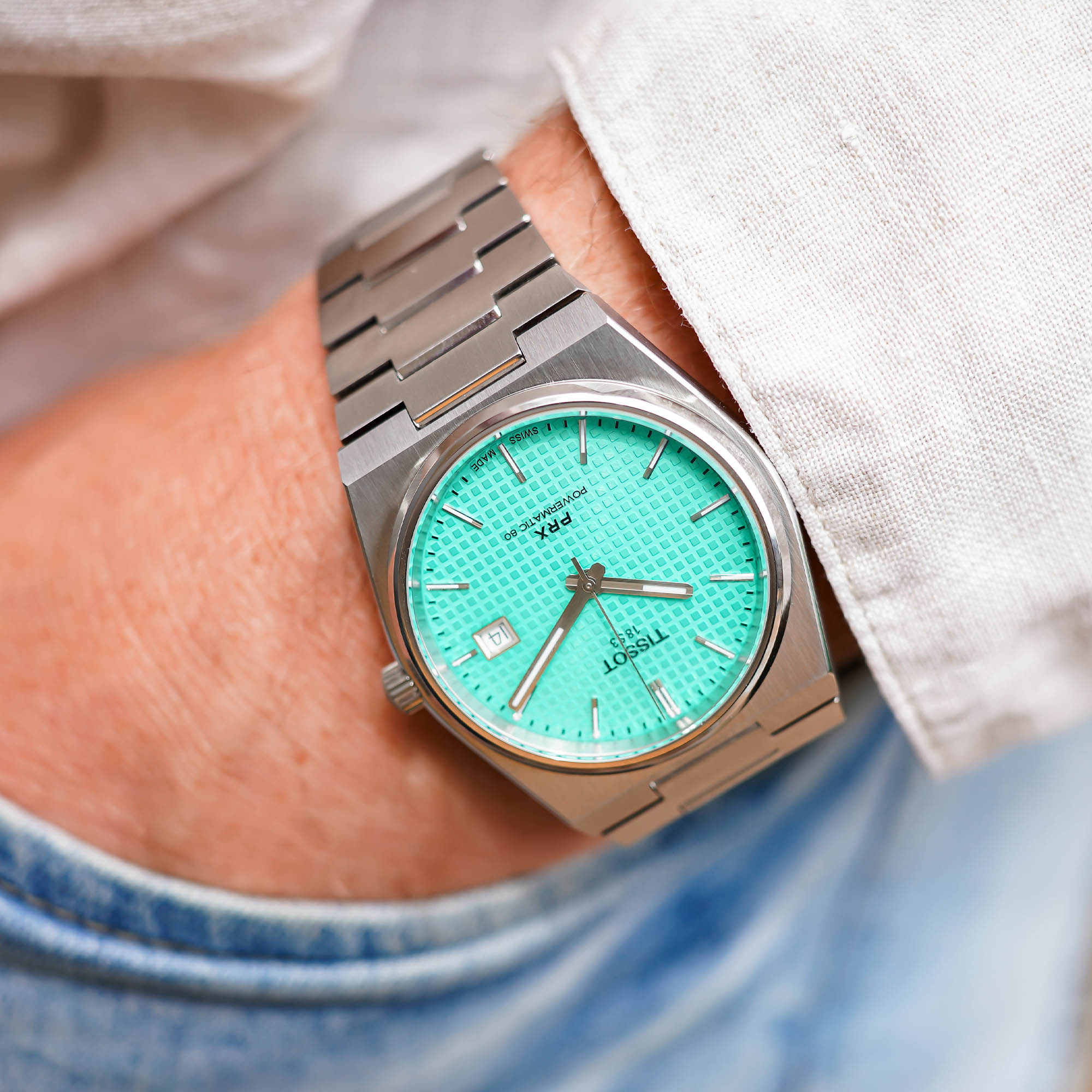 In 2021, Tissot introduced the PRX collection, a lineup that perfectly captured the essence of its 1970s inspiration with a barrel-shaped case, integrated bracelet, and quartz movement. A few months later, the design was reissued, featuring the Powermatic 80 movement. It quickly became clear that the series was perfectly in tune with the growing trend of integrated sports watches, and the Tissot PRX emerged as one of the Swatch Group brand’s biggest successes in recent years. Three years later, the collection continues to expand and now includes 35 and 40-mm models powered by quartz and Powermatic 80 automatic movements and 42-mm automatic chronographs, with a variety of dial colours that make the PRX such a compelling offer. This year, the mint green hue that previously adorned the quartz-powered PRX references made it to the PRX Powermatic 80 line in both 35mm and 40mm. We gladly share our impressions of the 40mm reference, which captures the summer vibes ideally – like the 2023 PRX with the ice-blue dial.