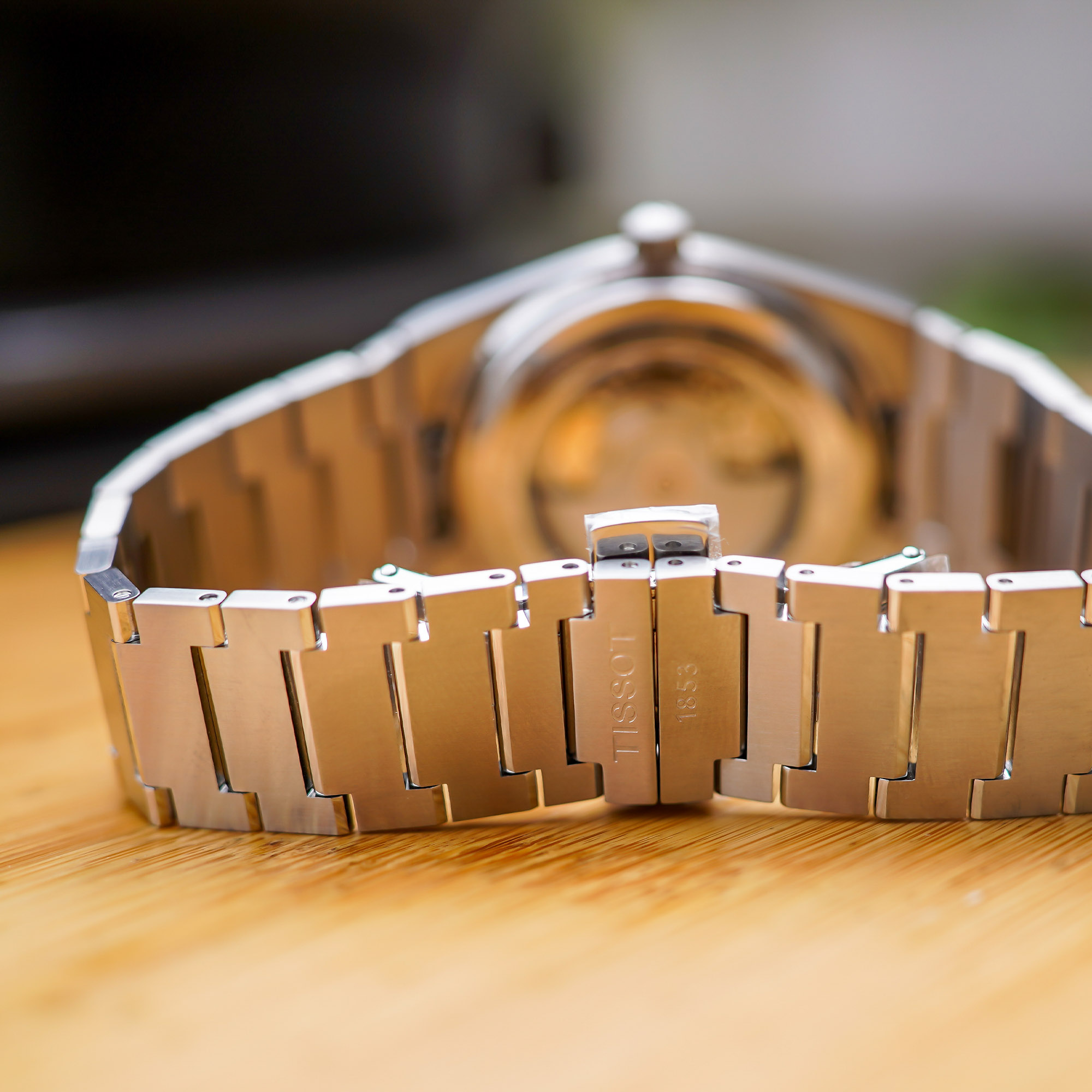 The Tissot PRX Powermatic 80 40mm Mint Green retains the exact specifications as the other 40mm models in the collection, featuring the signature barrel-shaped brushed stainless steel case and a perfectly round, bright polished bezel that provides a striking contrast, fitting seamlessly into the sports watch genre. The watch has a sleek profile, with a case height of just 10.9mm, making it very comfortable on the wrist. The bracelet enhances this comfort, which offers excellent articulation, with the end links curving downwards to follow the wrist’s natural shape. The bracelet, finished with the same brushed texture as the case, includes an easy-change feature, allowing you to swap it for a strap, although PRX Mint Green truly shines with the metal-on-metal look, both in appearance and feel—a refined, well-constructed watch. The flat sapphire crystal has an anti-reflective coating, the screw-down caseback is transparent, and the watch is water-resistant to 100 meters.