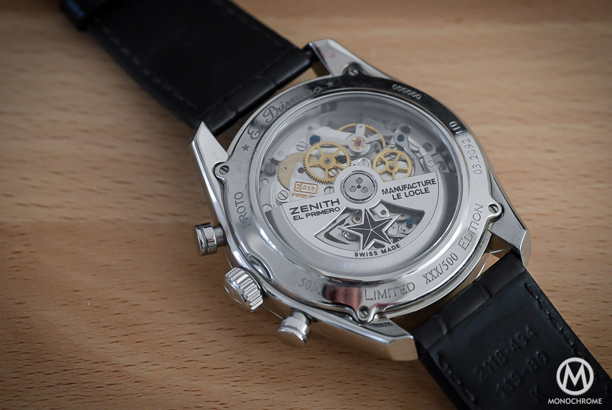 Then cames the idea of mixing this movement with a complete calendar complication. This concept had been developed as a prototype in the late 1960s / early 1970s with a very limited production of approximately 25 pieces. Then, Zenith introduced several watches with this same movement, including the Triple Date display – watches like this Chronomaster. However, this complication has never been seen in the classical case of the El Primero (the watch, not the movement) until 2013. For the story, one of the 25 prototype watches had been sold in May 2012 by Christies for 37.500 Swiss Francs and bought by Zenith themselves. The goal of this acquisition: creating a new watch based on the El Primero and including this triple calendar. The result was first a limited edition of 500 watches launched in 2013, with a slate grey dial and two stars on the dial besides the day and month apertures – just like the vintage edition. Considering the great success of this limited edition, Zenith decided to give its chance to the 410 movement and to launch it in a regular edition, the one you can see here.