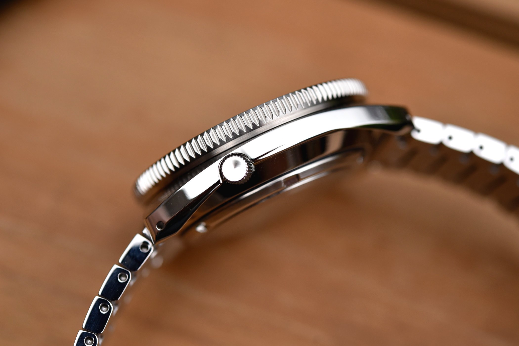 As any good re-edition should, the case is virtually an exact copy of the one introduced in 1968 in terms of shape, proportions and finishing. Of course, material quality has improved over the years but it still has that iconic tonneau-shaped design with shrouded lugs, a bidirectional bezel and a hidden crown. Design elements such as the polished half-moon scallops at 12′ and 6′ are all there, resulting in the same charm as it did 55 years ago. With a diameter of 39.5mm and a height of 12.5mm it is quite compact and the lug-to-lug size of 43.1mm makes it looks and feels very good on the wrist. The drilled lugs add a nice vintage touch too and allow you to easily swap out the bracelet for a strap if you want. With 100m of water resistance, you also don’t have to worry about a heavy shower of rain or a jump in the pool or ocean.