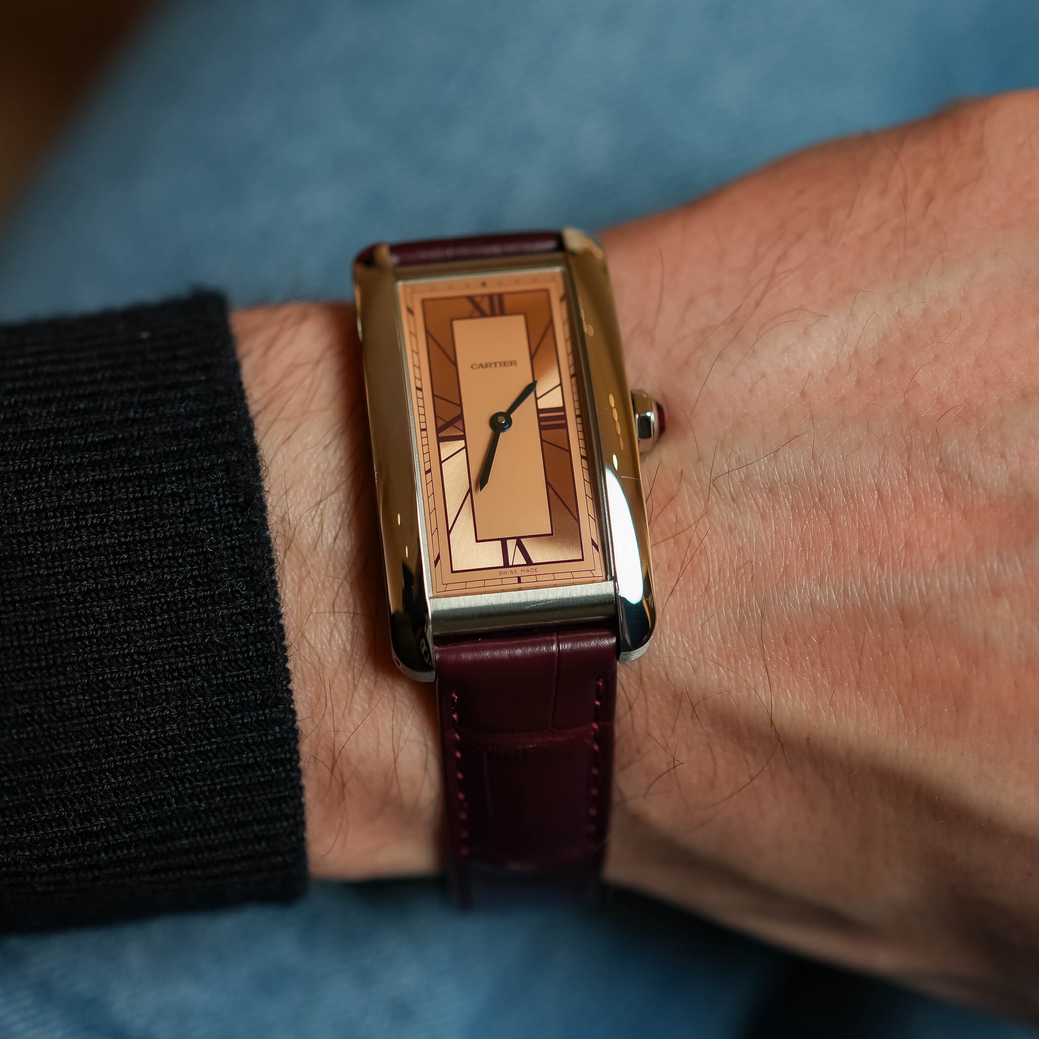 The name Tank at Cartier means far more than just a watch… It’s an entire range of watches, all distinguished by some design elements first defined by the so-called Tank Normale of 1917. From there, the collection expanded to dozens of designs, such as the Tank Louis Cartier, the Cintrée, the Française and the Asymétrique, just to name a few. In 2023, Cartier relaunched the Tank Américaine, a Tank watch with an elongated and curved rectangular case, first introduced in 1989. The return was made with ultra-classic versions in steel or gold, with white dials. But some months ago, without making much noise about it, the brand unveiled a pair of precious versions with Art-Deco sector dials, including this handsome platinum-salmon version.