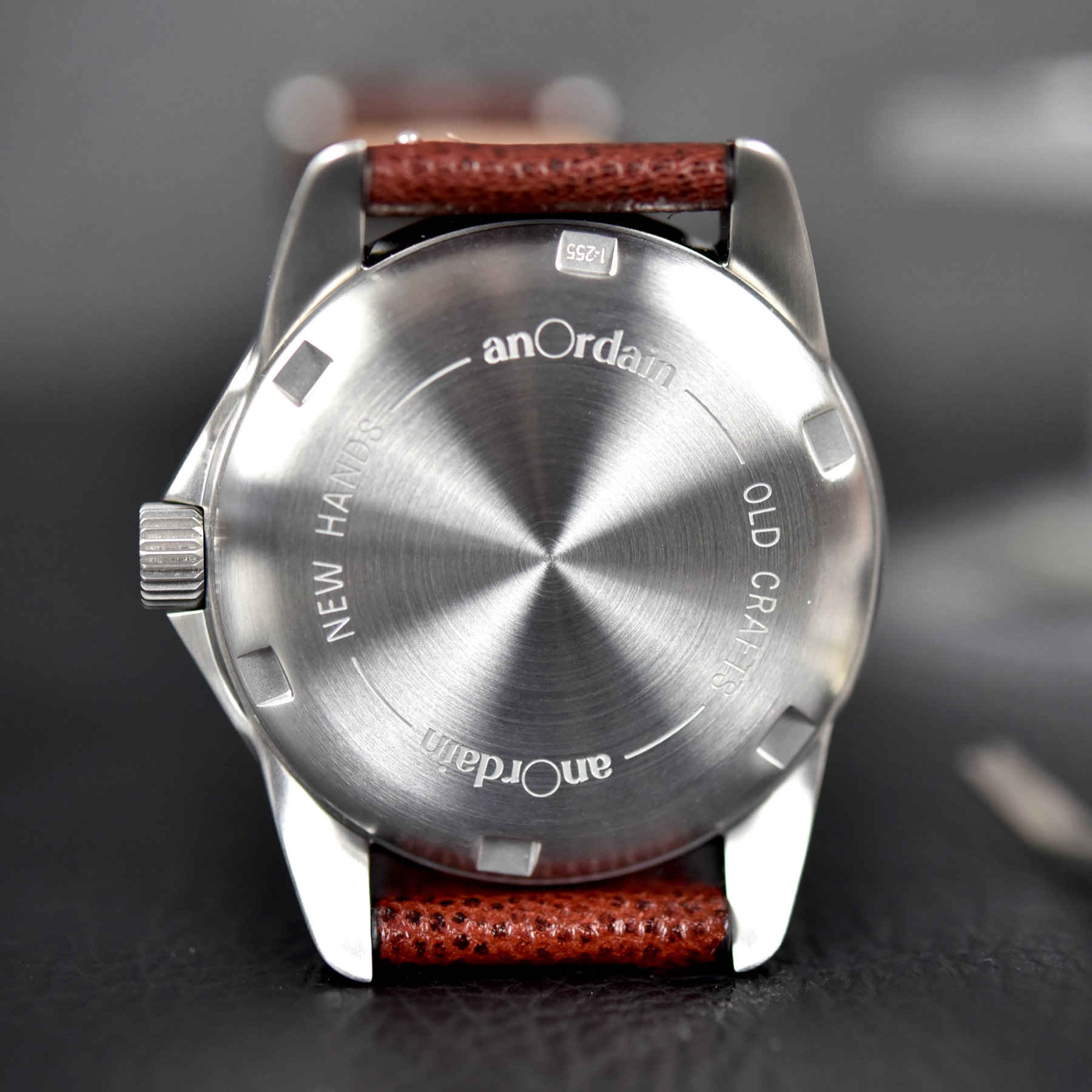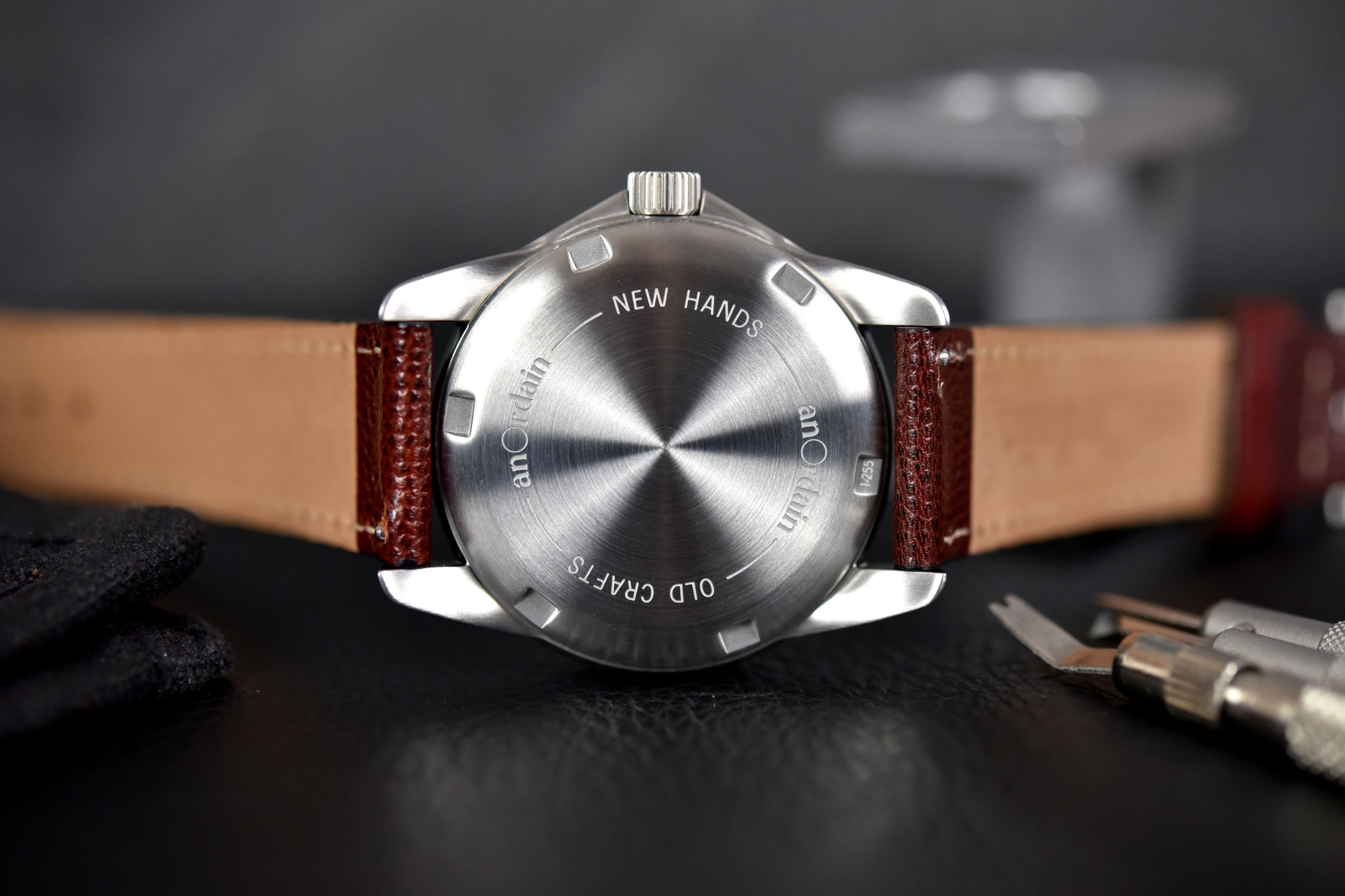 Like pretty much all watches made anOrdain, you have a bit of freedom of choice when it comes down to the straps. The Model 2 MKII Racing Green comes on a very nice and comfortable reddish-brown, grained leather strap, but you can opt for suede, Shell Cordovan or Russian hatch bovine leather straps instead. Depending on the size of the Model 2 MKII, medium or large, the strap is 18mm or 20mm in width and fitted with a brushed steel pin buckle.