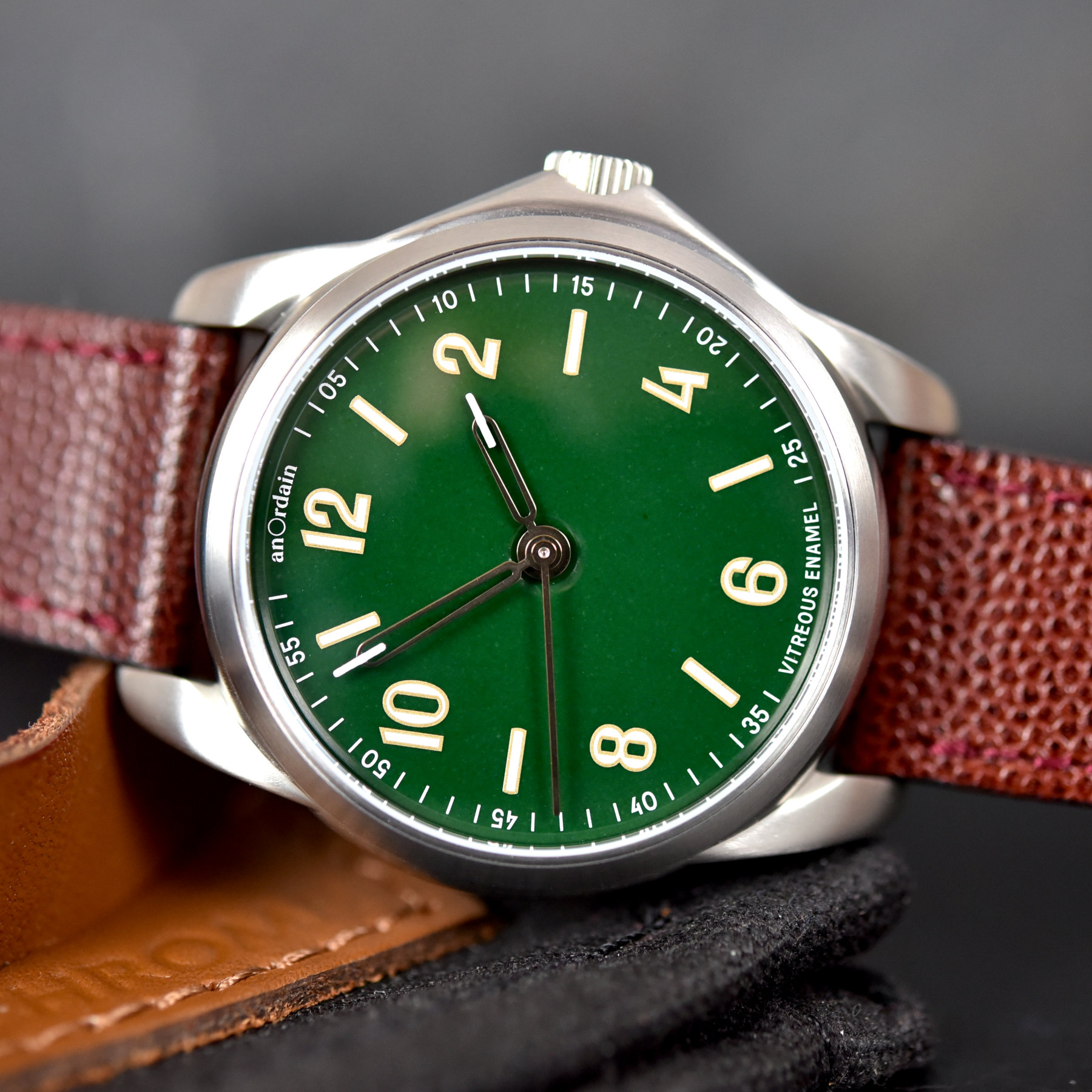When the Model 2 MKII was introduced a couple of months ago, a quartet of colours were announced: White, Grey Haar, Flax and Racing Green. While each looks good on its own, the Racing Green stood out to me when I visited anOrdain and got to see it in person for the first time. Part of the appeal of this particular colour is my love of cars and motorsports, often expressed through our Petrolhead Corner stories. The colour is very rich and deep and shows all the details enamel dials are loved for. The dimple towards the axis for the hands, the very fine orange peal structure only visible in some angles, the slight dip as it reaches the outer edge of the dial, it’s all just very lovely.