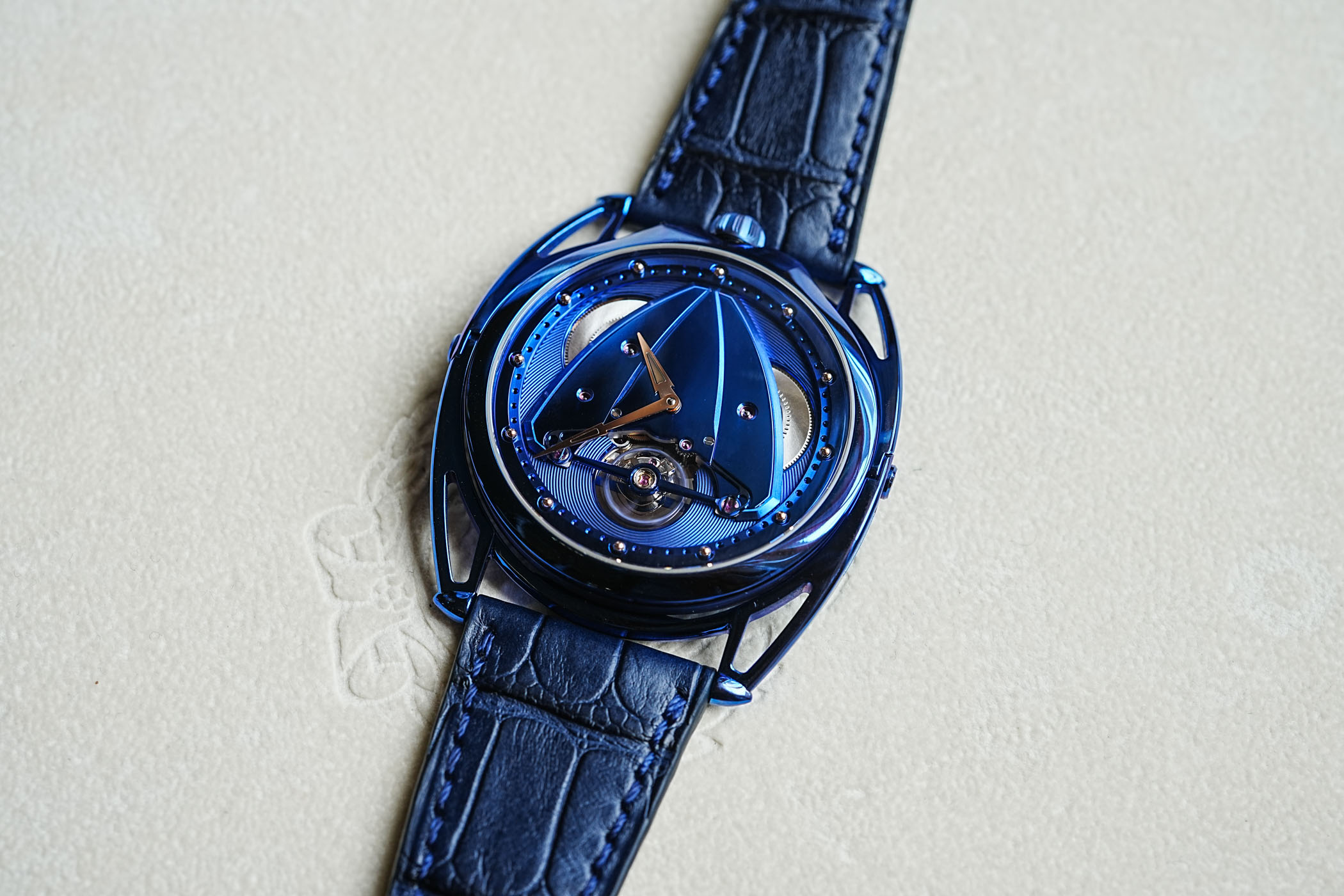 The dial is a fascinating composition of shapes, layers, colours (predominantly blue) and textures. Most of the elements are made of blued titanium, with the signature triangular delta bridge in the centre allowing a view of the two barrels. The titanium balance wheel with white gold weights and the balance spring with a silicon escape wheel are exposed at 6 o’clock, and the entire regulating organ is held in place by a transversal, mirror-polished, blued titanium bridge.