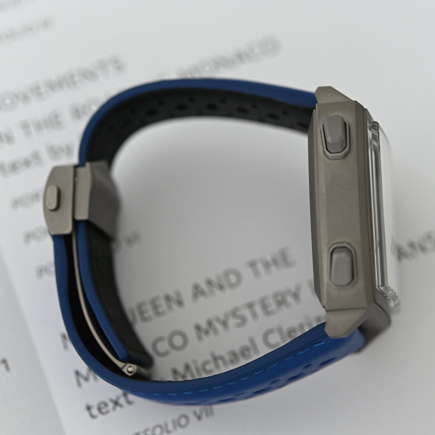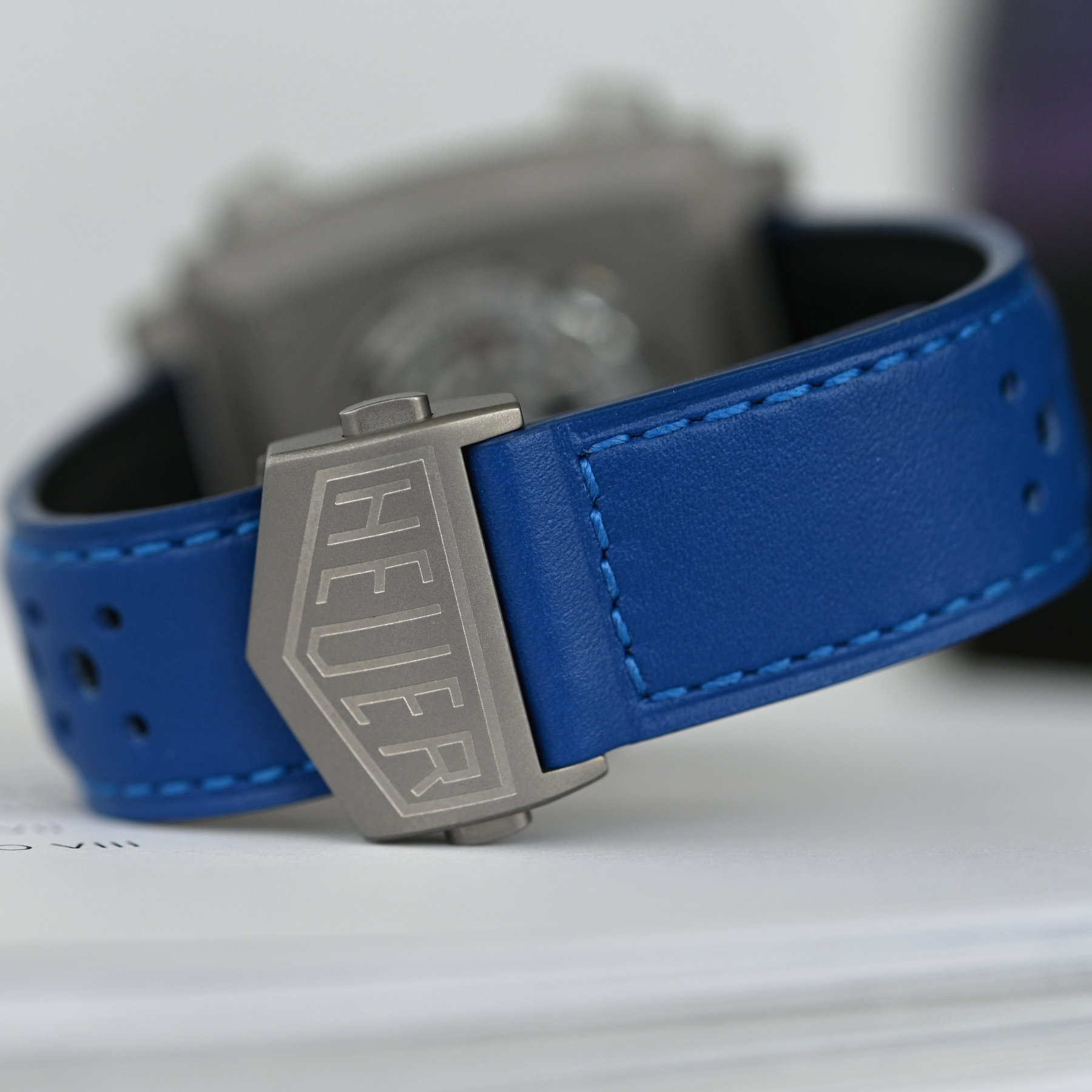 The Monaco Racing Blue case pays a heartfelt tribute to its original and iconic predecessor by harmonizing sharp angles with fantastic curves that make it so unique. The 39mm x 39mm grade 2 titanium case has a sophisticated sandblasted finish on its 47.5mm lug-to-lug span and 14.35mm thickness, making it a visually distinct and tactile delight. Do not let the lug-to-lug measurement put you off; the watch wears comfortably on any wrist. The titanium crown positioned at 9 o’clock tips its hat to the Monaco’s early incarnations, with the chronograph pushers at 2 and 4 o’clock adopting a modern look, which I like. You’ll find the bevelled, domed sapphire crystal on the dial side that complements the overall design perfectly and the sapphire crystal caseback if you turn the watch over. The case construction guarantees water resistance up to a depth of 100 meters.