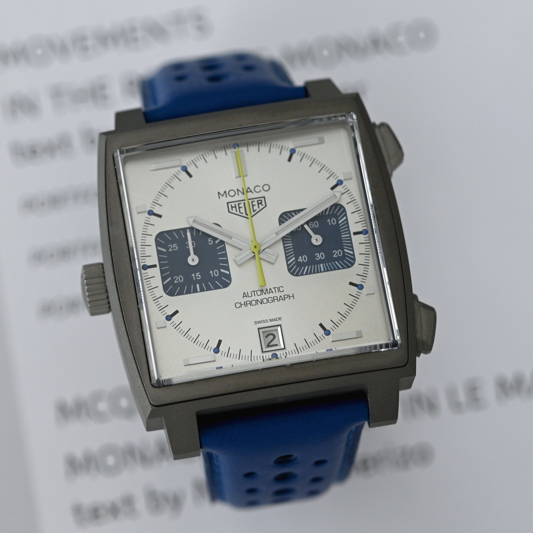 While it’s undeniable that some part of the Monaco chronograph’s allure can be attributed to Steve McQueen and his appearance in the Le Mans motion picture, where he effortlessly sported this watch on his wrist, let’s not overlook the fact that the 1969 Heuer timepiece itself is as original and audacious as the Hollywood legend it’s often associated with. Over the years, it has evolved, constantly pushing the boundaries of contemporary style and trendsetting, exemplified by editions like the pioneering Monaco V4 from 2004 and the recent Monaco Skeleton version. Interestingly, both of these watches (at least the very first V4 editions) share a common material with the TAG Heuer Monaco Chronograph Racing Blue – titanium.