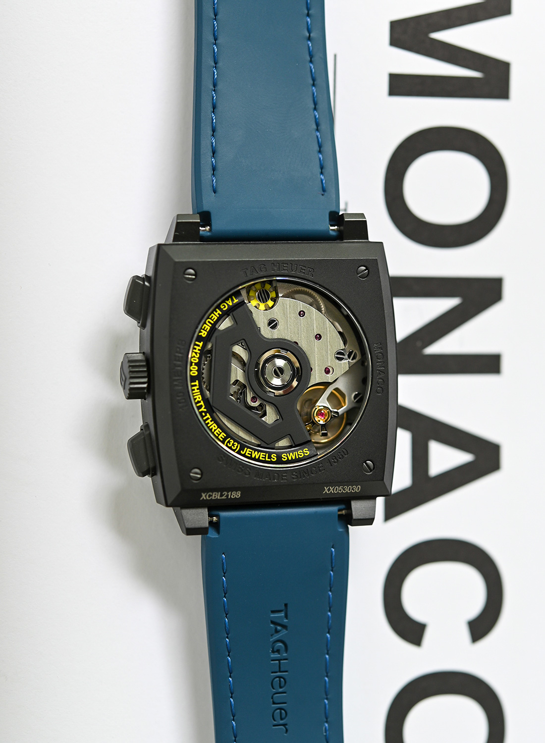 The TAG Heuer Monaco Skeleton Dark Blue features a 39mm-wide grade 2 titanium case with a black DLC coating and a sandblasted finish that extends to the exhibition caseback. This matte finish adds a contemporary architectural mood to the iconic square Monaco silhouette, accentuating the flowing curves along the case sides. These curves soften the otherwise angular design, countering the typically aggressive look of a black DLC watch.